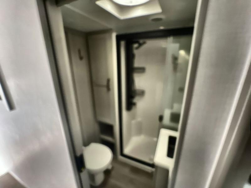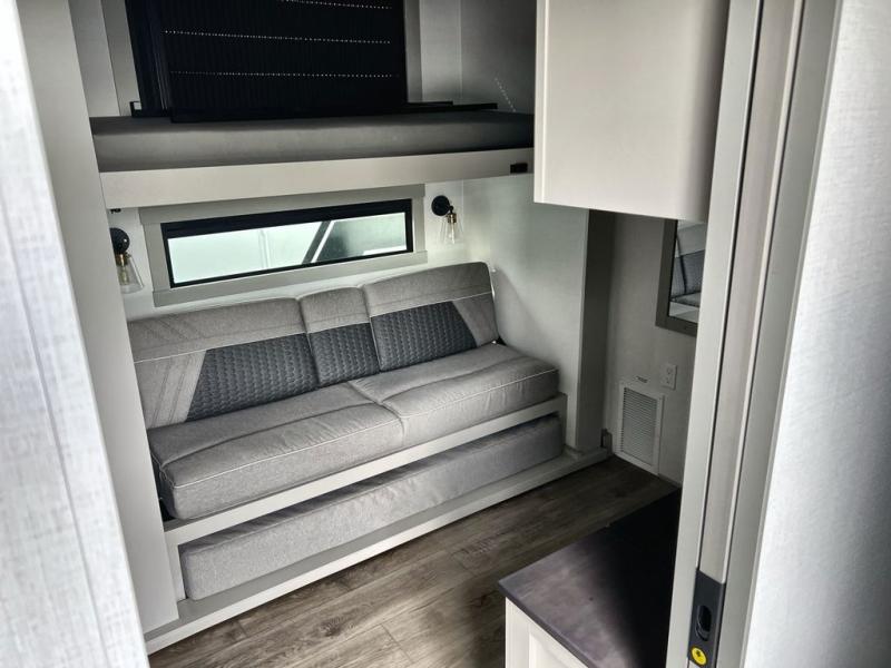 This unit is perfect for your family that needs sleeping space for eight! There is ample seating with a sliding desk/dining table, 62" theater seating, and a 72" tri-fold sofa along the rear wall. You can easily relax and enjoy the telescoping TV with a cozy fireplace below. The kitchen offers all that you need to prepare and cook meals just like home with a 16 cu. ft. refrigerator for your perishables, a 30" residential microwave oven, and three burner range top and oven. You will love the kitchen island all outfitted with pull-out pet bowls and double pull out trash bins with an integrated Stow & Go paper towel holder. There is also an 84" pantry with adjustable shelves for all of your canned and dry goods. Mid-coach, just ahead through the main entry, is a bonus room that can be used as a bedroom featuring a sofa bed with flip-up overhead bunk and trundle below, or an office with pull-out desk so that you can work easily while you travel, or it could also be used as a gaming room since there is also a 50" Smart TV. Head up the steps to a bathroom on your left and a private master suite with king bed slide all the way up front. A sliding dresser top features hidden storage which is perfect for jewelry and other personal belongings. The front wardrobe features mirrored doors and the corner closet has been prepped for a stackable washer and dryer if you choose to add that option.