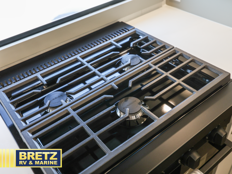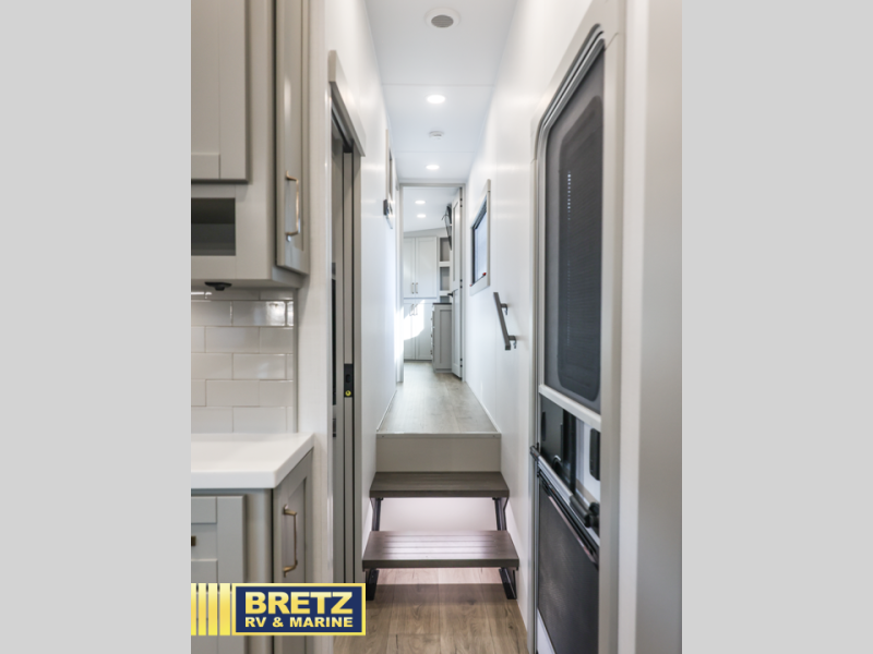 This unit is perfect for your family that needs sleeping space for eight! There is ample seating with a sliding desk/dining table, 62" theater seating, and a 72" tri-fold sofa along the rear wall. You can easily relax and enjoy the telescoping TV with a cozy fireplace below. The kitchen offers all that you need to prepare and cook meals just like home with a 16 cu. ft. refrigerator for your perishables, a 30" residential microwave oven, and three burner range top and oven. You will love the kitchen island all outfitted with pull-out pet bowls and double pull out trash bins with an integrated Stow & Go paper towel holder. There is also an 84" pantry with adjustable shelves for all of your canned and dry goods. Mid-coach, just ahead through the main entry, is a bonus room that can be used as a bedroom featuring a sofa bed with flip-up overhead bunk and trundle below, or an office with pull-out desk so that you can work easily while you travel, or it could also be used as a gaming room since there is also a 50" Smart TV. Head up the steps to a bathroom on your left and a private master suite with king bed slide all the way up front. A sliding dresser top features hidden storage which is perfect for jewelry and other personal belongings. The front wardrobe features mirrored doors and the corner closet has been prepped for a stackable washer and dryer if you choose to add that option.