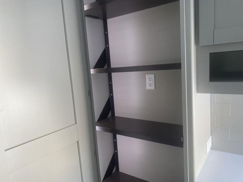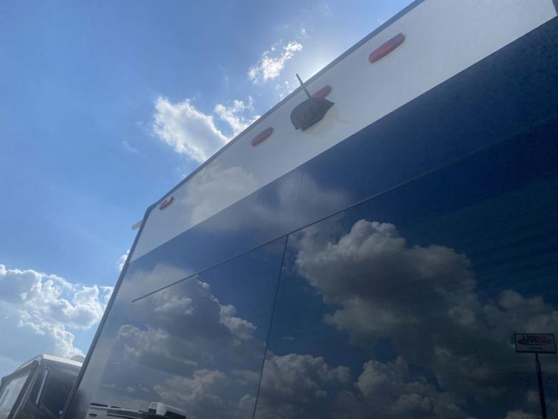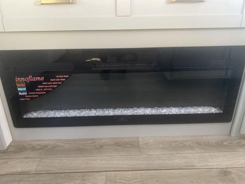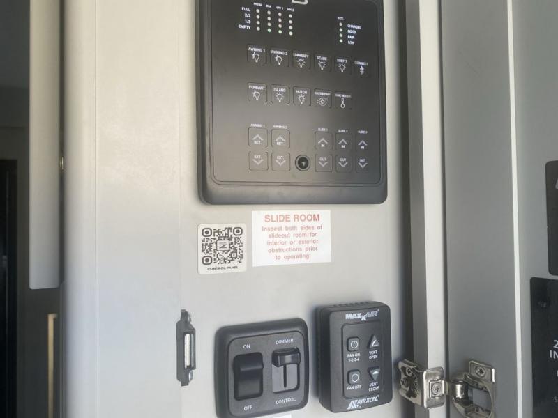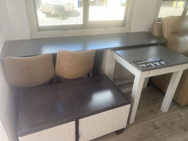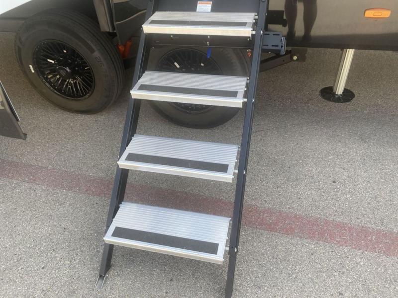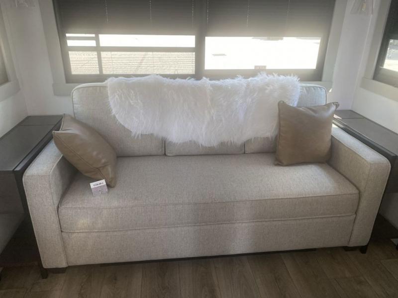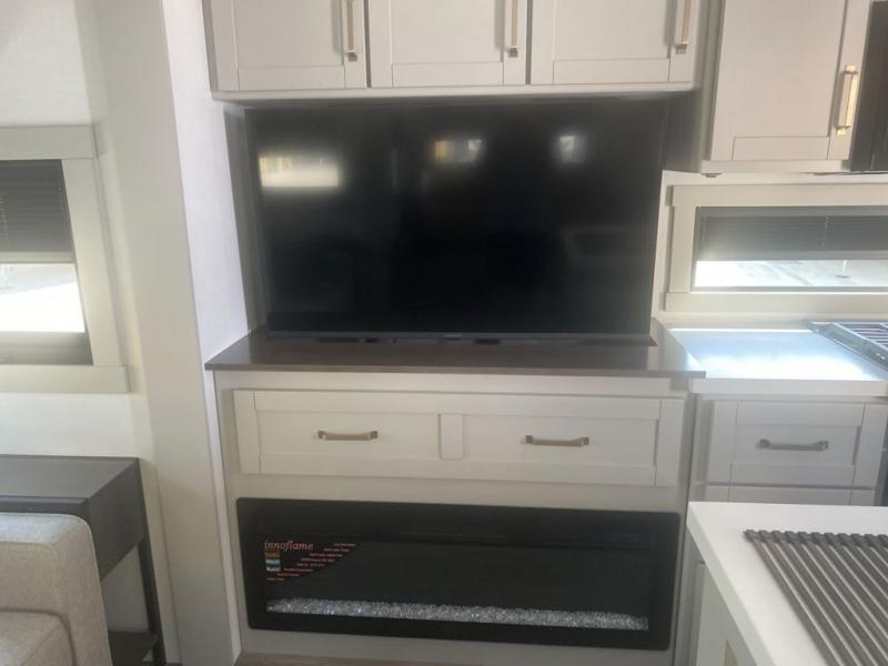 This unit is perfect for your family that needs sleeping space for eight! There is ample seating with a sliding desk/dining table, 62" theater seating, and a 72" tri-fold sofa along the rear wall. You can easily relax and enjoy the telescoping TV with a cozy fireplace below. The kitchen offers all that you need to prepare and cook meals just like home with a 16 cu. ft. refrigerator for your perishables, a 30" residential microwave oven, and three burner range top and oven. You will love the kitchen island all outfitted with pull-out pet bowls and double pull out trash bins with an integrated Stow & Go paper towel holder. There is also an 84" pantry with adjustable shelves for all of your canned and dry goods. Mid-coach, just ahead through the main entry, is a bonus room that can be used as a bedroom featuring a sofa bed with flip-up overhead bunk and trundle below, or an office with pull-out desk so that you can work easily while you travel, or it could also be used as a gaming room since there is also a 50" Smart TV. Head up the steps to a bathroom on your left and a private master suite with king bed slide all the way up front. A sliding dresser top features hidden storage which is perfect for jewelry and other personal belongings. The front wardrobe features mirrored doors and the corner closet has been prepped for a stackable washer and dryer if you choose to add that option.