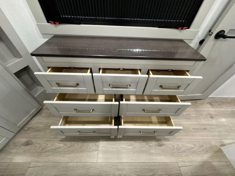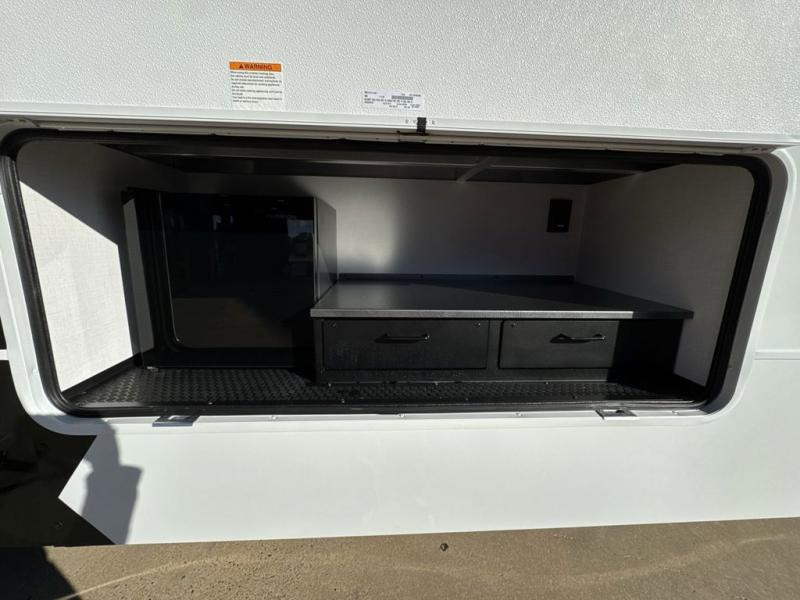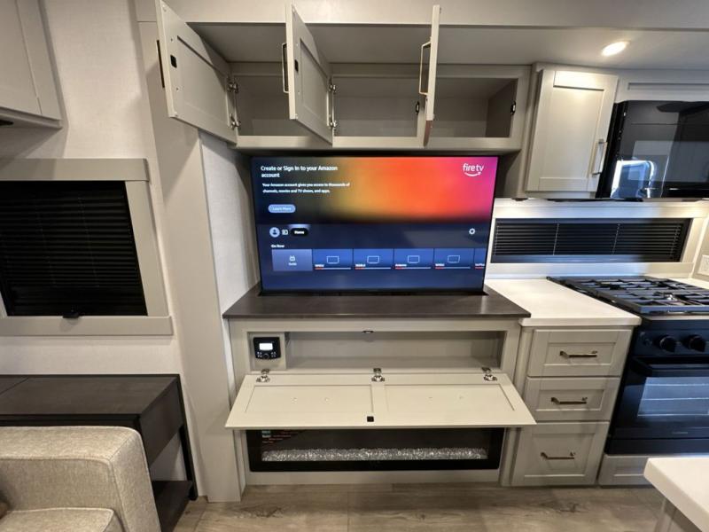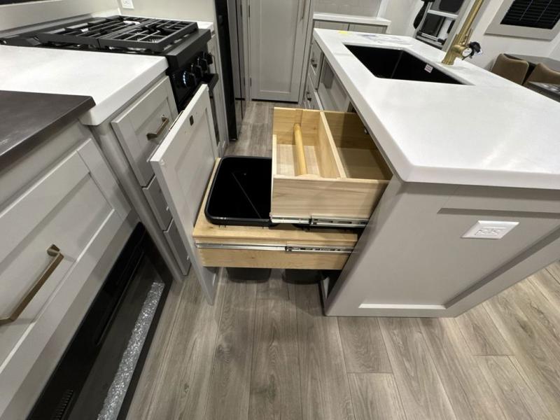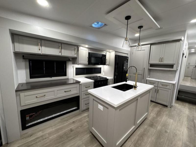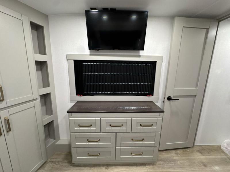 This unit is perfect for your family that needs sleeping space for eight! There is ample seating with a sliding desk/dining table, 62" theater seating, and a 72" tri-fold sofa along the rear wall. You can easily relax and enjoy the telescoping TV with a cozy fireplace below. The kitchen offers all that you need to prepare and cook meals just like home with a 16 cu. ft. refrigerator for your perishables, a 30" residential microwave oven, and three burner range top and oven. You will love the kitchen island all outfitted with pull-out pet bowls and double pull out trash bins with an integrated Stow & Go paper towel holder. There is also an 84" pantry with adjustable shelves for all of your canned and dry goods. Mid-coach, just ahead through the main entry, is a bonus room that can be used as a bedroom featuring a sofa bed with flip-up overhead bunk and trundle below, or an office with pull-out desk so that you can work easily while you travel, or it could also be used as a gaming room since there is also a 50" Smart TV. Head up the steps to a bathroom on your left and a private master suite with king bed slide all the way up front. A sliding dresser top features hidden storage which is perfect for jewelry and other personal belongings. The front wardrobe features mirrored doors and the corner closet has been prepped for a stackable washer and dryer if you choose to add that option.
