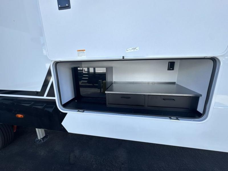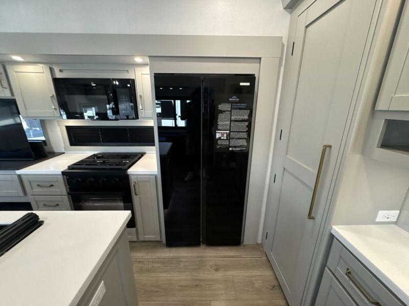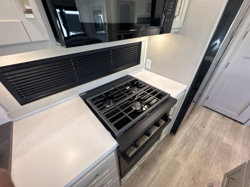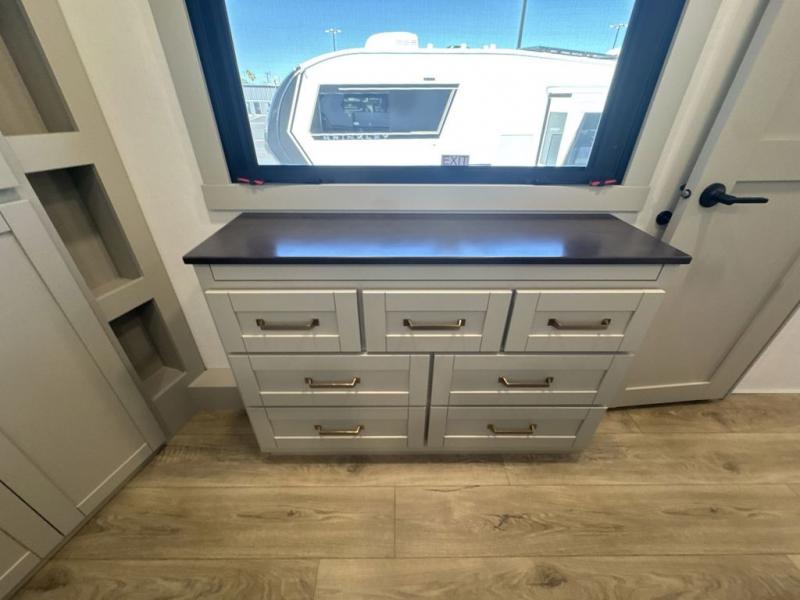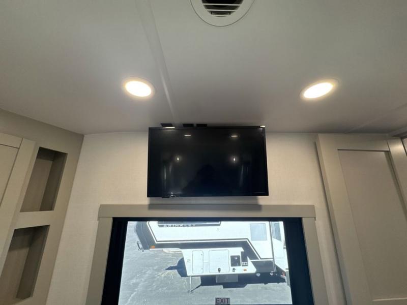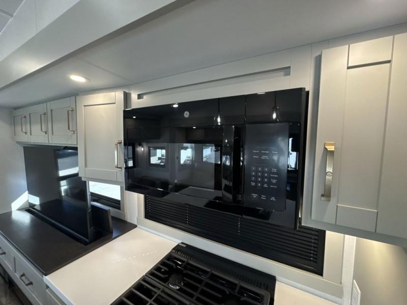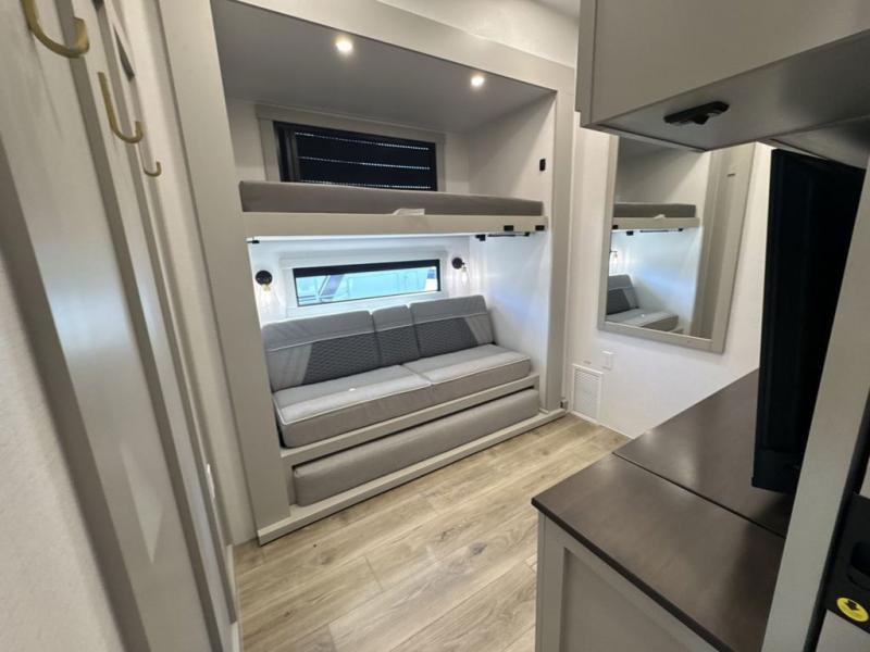 This unit is perfect for your family that needs sleeping space for eight! There is ample seating with a sliding desk/dining table, 62" theater seating, and a 72" tri-fold sofa along the rear wall. You can easily relax and enjoy the telescoping TV with a cozy fireplace below. The kitchen offers all that you need to prepare and cook meals just like home with a 16 cu. ft. refrigerator for your perishables, a 30" residential microwave oven, and three burner range top and oven. You will love the kitchen island all outfitted with pull-out pet bowls and double pull out trash bins with an integrated Stow & Go paper towel holder. There is also an 84" pantry with adjustable shelves for all of your canned and dry goods. Mid-coach, just ahead through the main entry, is a bonus room that can be used as a bedroom featuring a sofa bed with flip-up overhead bunk and trundle below, or an office with pull-out desk so that you can work easily while you travel, or it could also be used as a gaming room since there is also a 50" Smart TV. Head up the steps to a bathroom on your left and a private master suite with king bed slide all the way up front. A sliding dresser top features hidden storage which is perfect for jewelry and other personal belongings. The front wardrobe features mirrored doors and the corner closet has been prepped for a stackable washer and dryer if you choose to add that option.