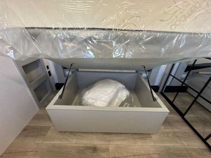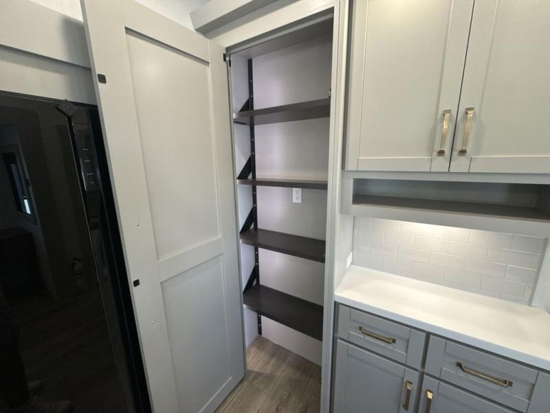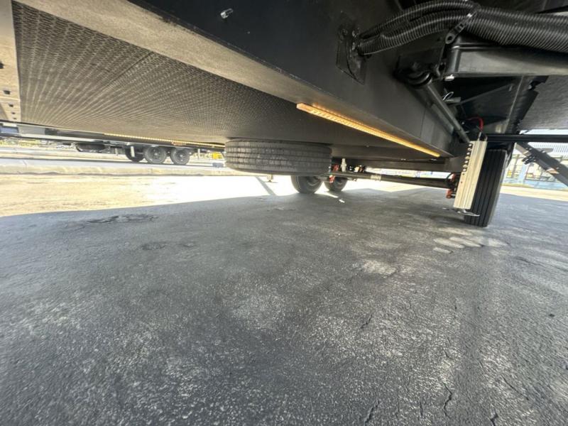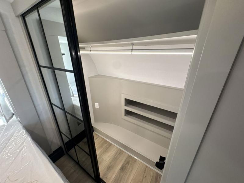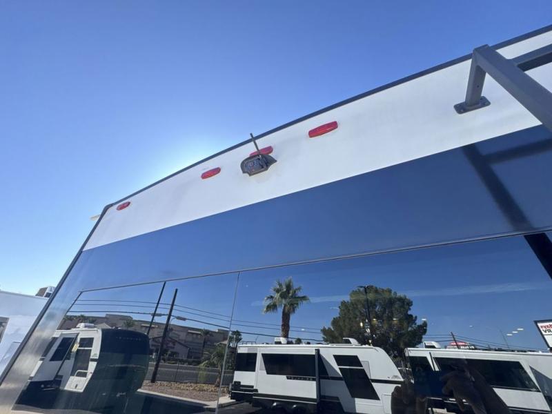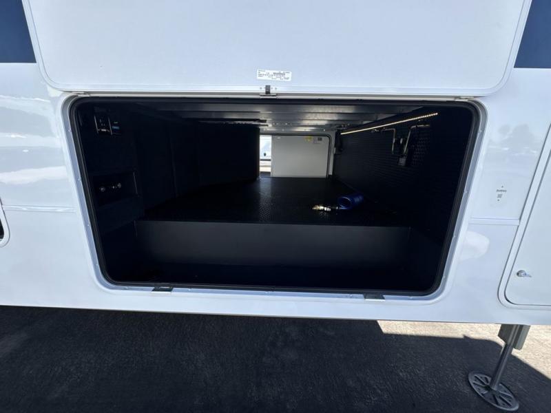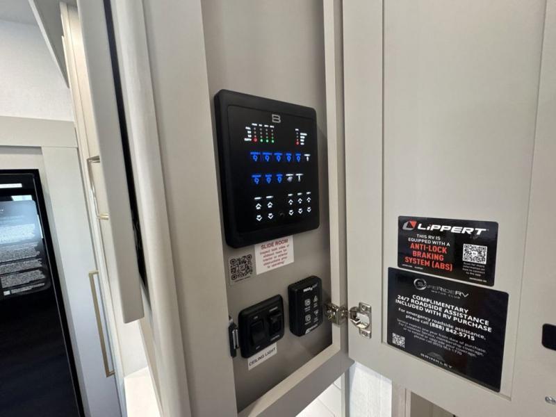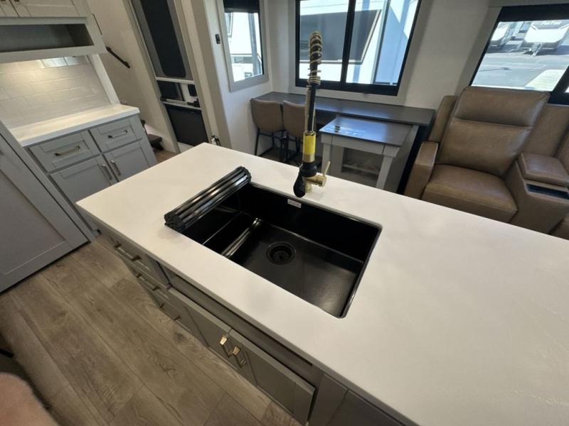 This unit is perfect for your family that needs sleeping space for eight! There is ample seating with a sliding desk/dining table, 62" theater seating, and a 72" tri-fold sofa along the rear wall. You can easily relax and enjoy the telescoping TV with a cozy fireplace below. The kitchen offers all that you need to prepare and cook meals just like home with a 16 cu. ft. refrigerator for your perishables, a 30" residential microwave oven, and three burner range top and oven. You will love the kitchen island all outfitted with pull-out pet bowls and double pull out trash bins with an integrated Stow & Go paper towel holder. There is also an 84" pantry with adjustable shelves for all of your canned and dry goods. Mid-coach, just ahead through the main entry, is a bonus room that can be used as a bedroom featuring a sofa bed with flip-up overhead bunk and trundle below, or an office with pull-out desk so that you can work easily while you travel, or it could also be used as a gaming room since there is also a 50" Smart TV. Head up the steps to a bathroom on your left and a private master suite with king bed slide all the way up front. A sliding dresser top features hidden storage which is perfect for jewelry and other personal belongings. The front wardrobe features mirrored doors and the corner closet has been prepped for a stackable washer and dryer if you choose to add that option.