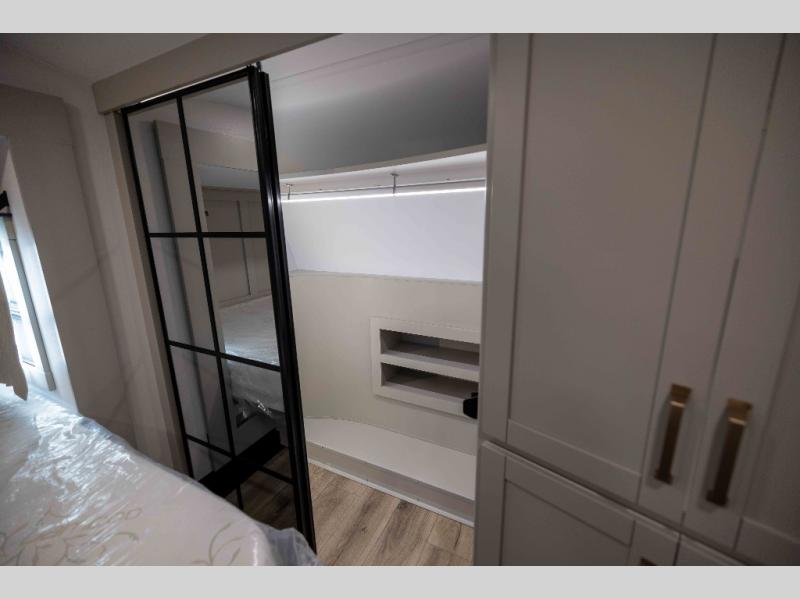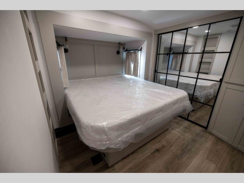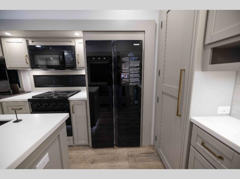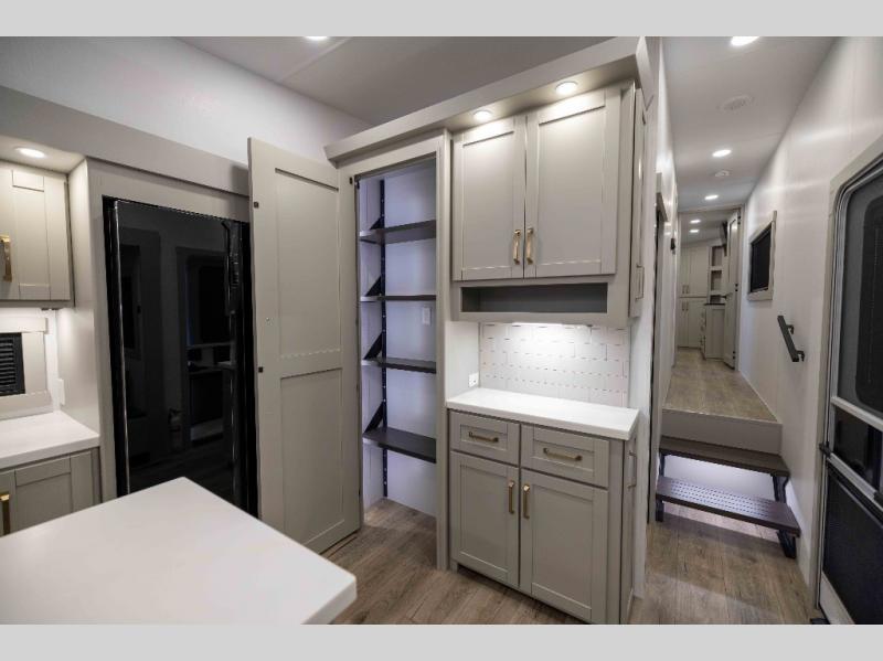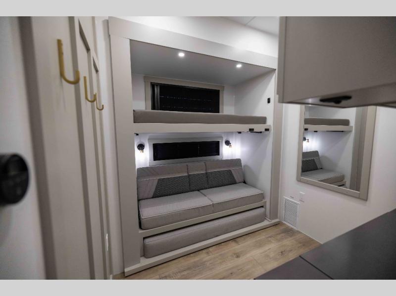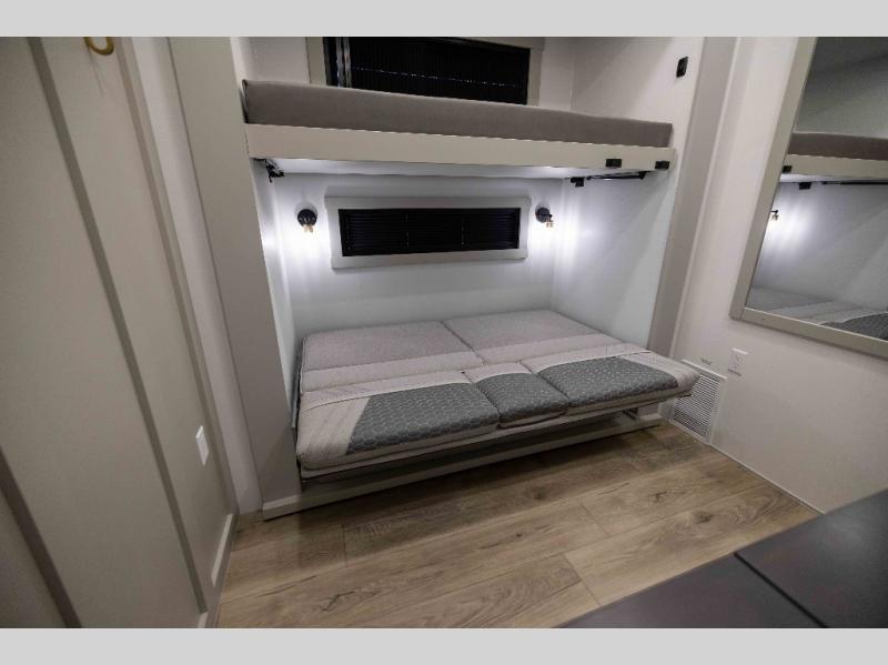 This unit is perfect for your family that needs sleeping space for eight! There is ample seating with a sliding desk/dining table, 62" theater seating, and a 72" tri-fold sofa along the rear wall. You can easily relax and enjoy the telescoping TV with a cozy fireplace below. The kitchen offers all that you need to prepare and cook meals just like home with a 16 cu. ft. refrigerator for your perishables, a 30" residential microwave oven, and three burner range top and oven. You will love the kitchen island all outfitted with pull-out pet bowls and double pull out trash bins with an integrated Stow & Go paper towel holder. There is also an 84" pantry with adjustable shelves for all of your canned and dry goods. Mid-coach, just ahead through the main entry, is a bonus room that can be used as a bedroom featuring a sofa bed with flip-up overhead bunk and trundle below, or an office with pull-out desk so that you can work easily while you travel, or it could also be used as a gaming room since there is also a 50" Smart TV. Head up the steps to a bathroom on your left and a private master suite with king bed slide all the way up front. A sliding dresser top features hidden storage which is perfect for jewelry and other personal belongings. The front wardrobe features mirrored doors and the corner closet has been prepped for a stackable washer and dryer if you choose to add that option.