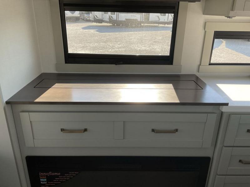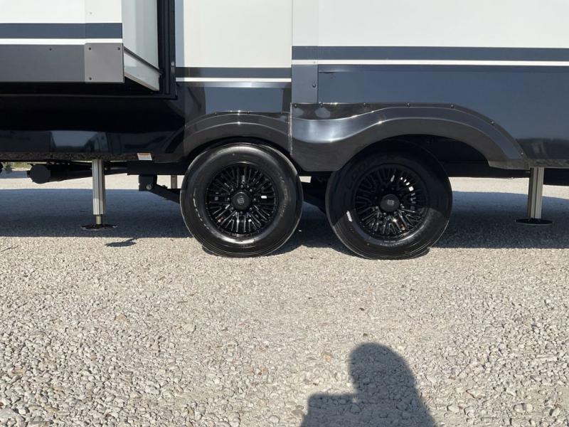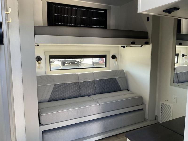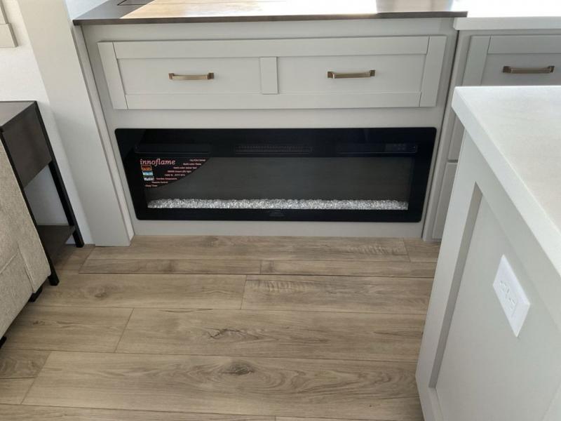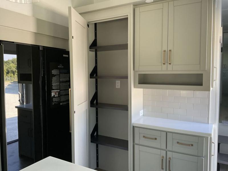 This unit is perfect for your family that needs sleeping space for eight! There is ample seating with a sliding desk/dining table, 62" theater seating, and a 72" tri-fold sofa along the rear wall. You can easily relax and enjoy the telescoping TV with a cozy fireplace below. The kitchen offers all that you need to prepare and cook meals just like home with a 16 cu. ft. refrigerator for your perishables, a 30" residential microwave oven, and three burner range top and oven. You will love the kitchen island all outfitted with pull-out pet bowls and double pull out trash bins with an integrated Stow & Go paper towel holder. There is also an 84" pantry with adjustable shelves for all of your canned and dry goods. Mid-coach, just ahead through the main entry, is a bonus room that can be used as a bedroom featuring a sofa bed with flip-up overhead bunk and trundle below, or an office with pull-out desk so that you can work easily while you travel, or it could also be used as a gaming room since there is also a 50" Smart TV. Head up the steps to a bathroom on your left and a private master suite with king bed slide all the way up front. A sliding dresser top features hidden storage which is perfect for jewelry and other personal belongings. The front wardrobe features mirrored doors and the corner closet has been prepped for a stackable washer and dryer if you choose to add that option.