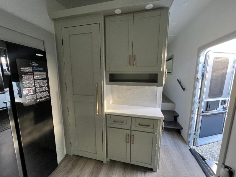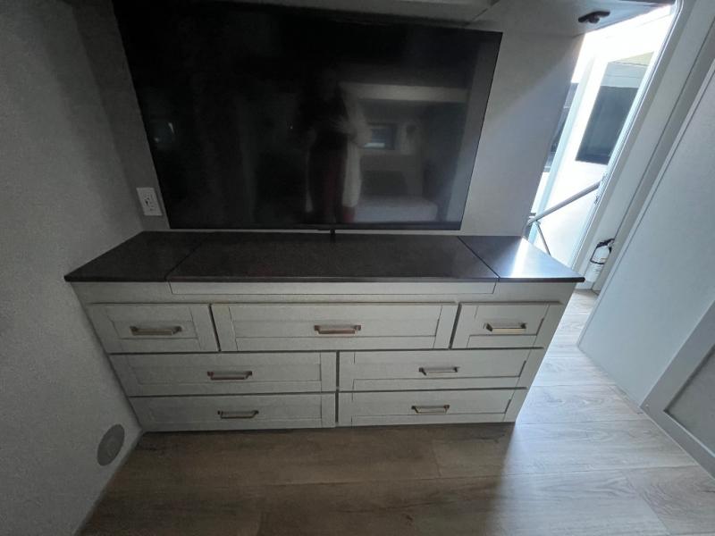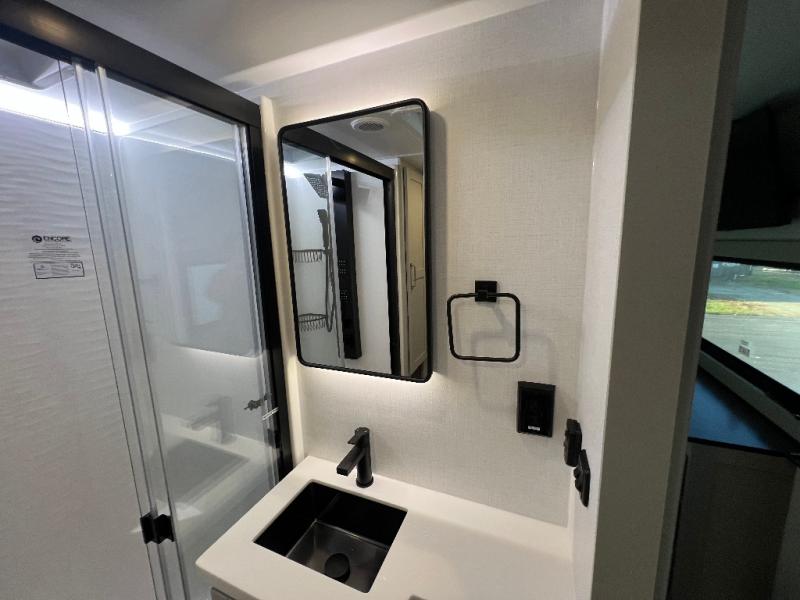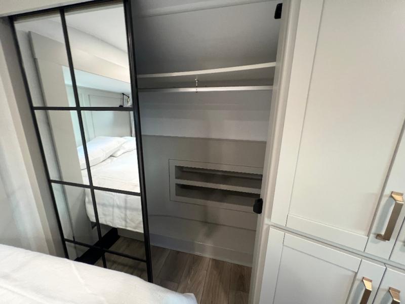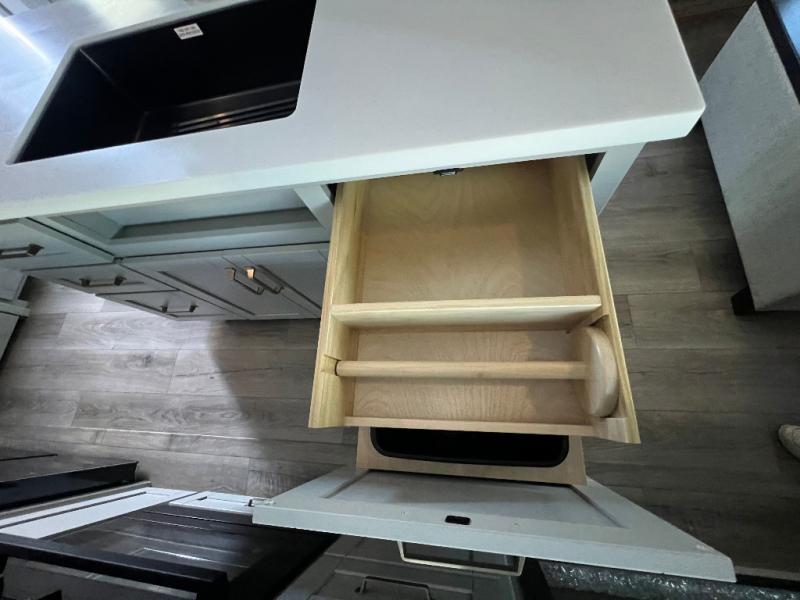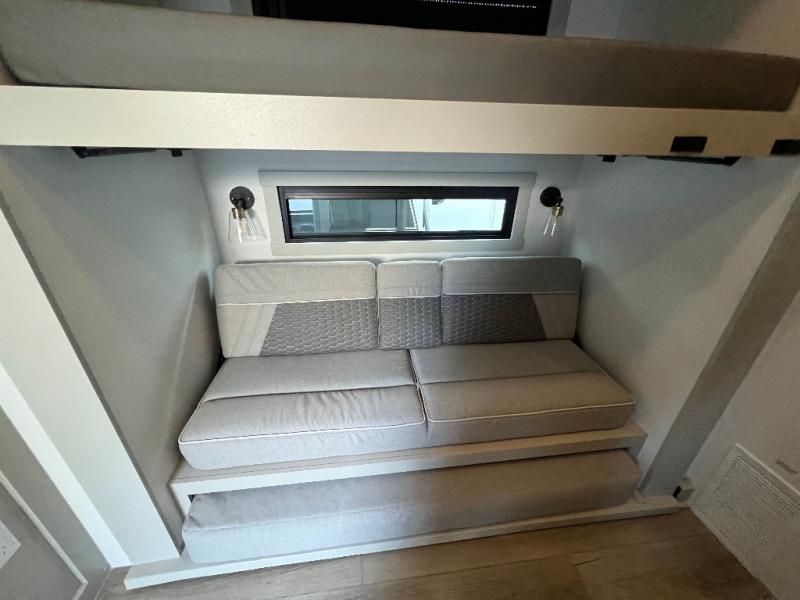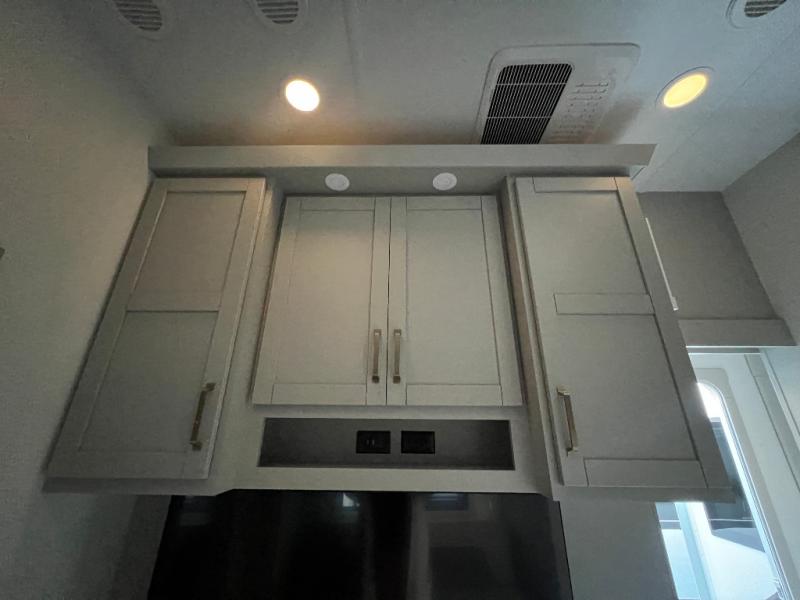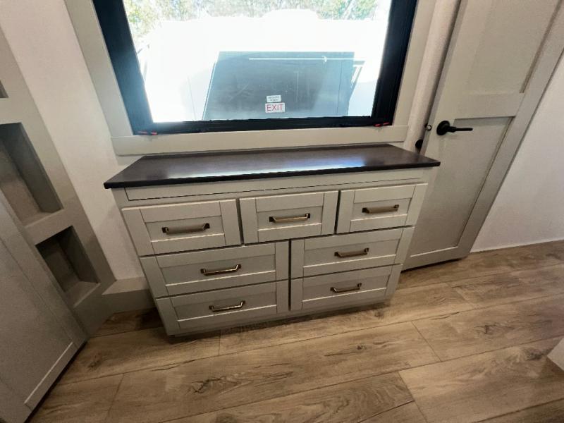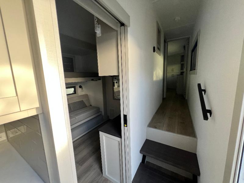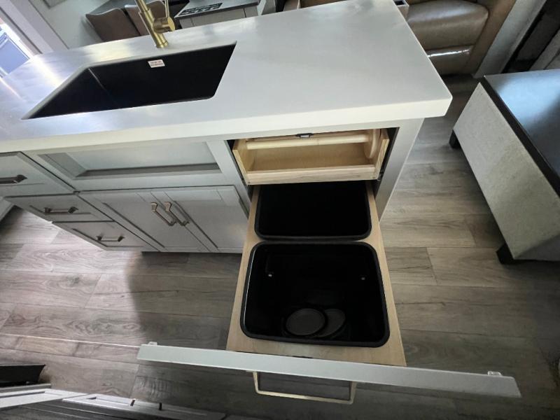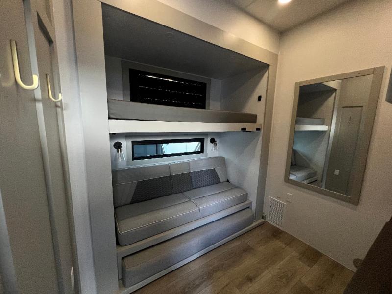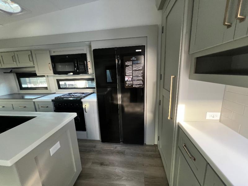 This unit is perfect for your family that needs sleeping space for eight! There is ample seating with a sliding desk/dining table, 62" theater seating, and a 72" tri-fold sofa along the rear wall. You can easily relax and enjoy the telescoping TV with a cozy fireplace below. The kitchen offers all that you need to prepare and cook meals just like home with a 16 cu. ft. refrigerator for your perishables, a 30" residential microwave oven, and three burner range top and oven. You will love the kitchen island all outfitted with pull-out pet bowls and double pull out trash bins with an integrated Stow & Go paper towel holder. There is also an 84" pantry with adjustable shelves for all of your canned and dry goods. Mid-coach, just ahead through the main entry, is a bonus room that can be used as a bedroom featuring a sofa bed with flip-up overhead bunk and trundle below, or an office with pull-out desk so that you can work easily while you travel, or it could also be used as a gaming room since there is also a 50" Smart TV. Head up the steps to a bathroom on your left and a private master suite with king bed slide all the way up front. A sliding dresser top features hidden storage which is perfect for jewelry and other personal belongings. The front wardrobe features mirrored doors and the corner closet has been prepped for a stackable washer and dryer if you choose to add that option.