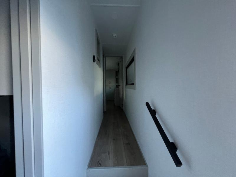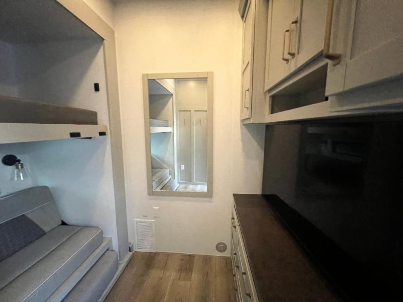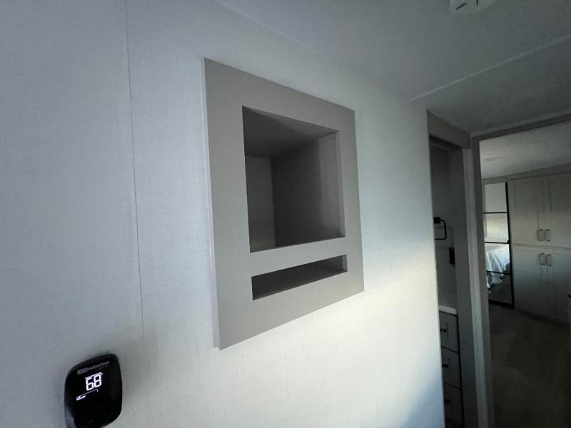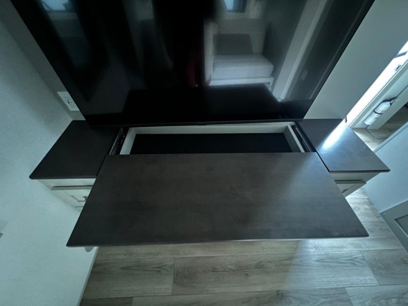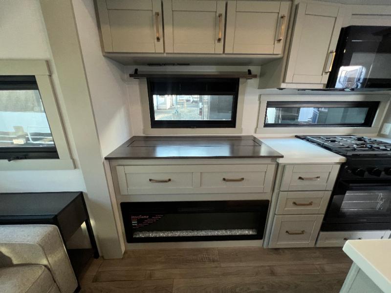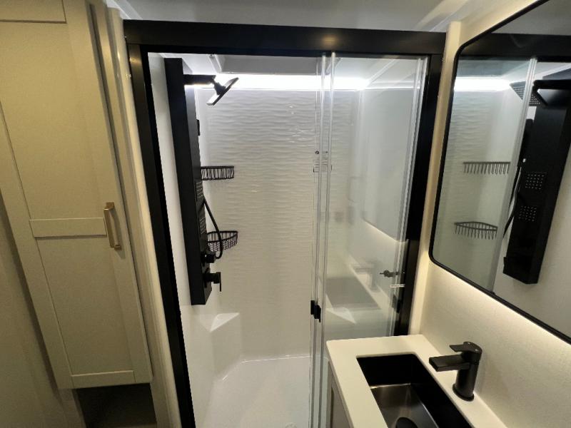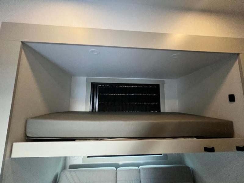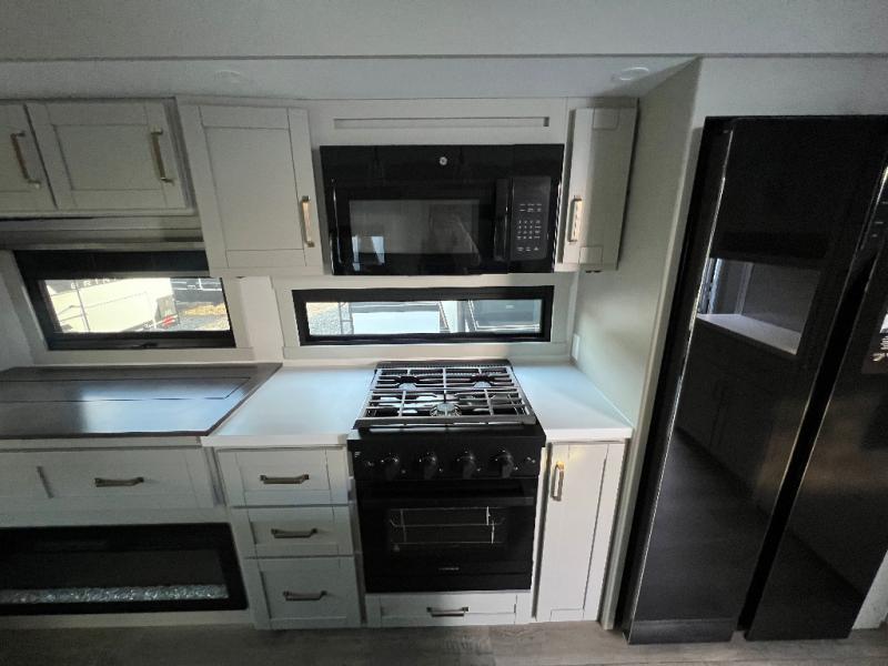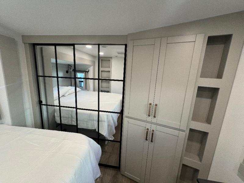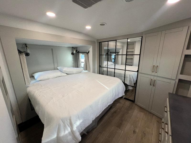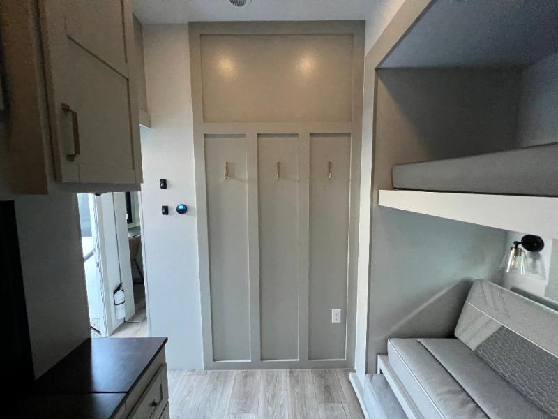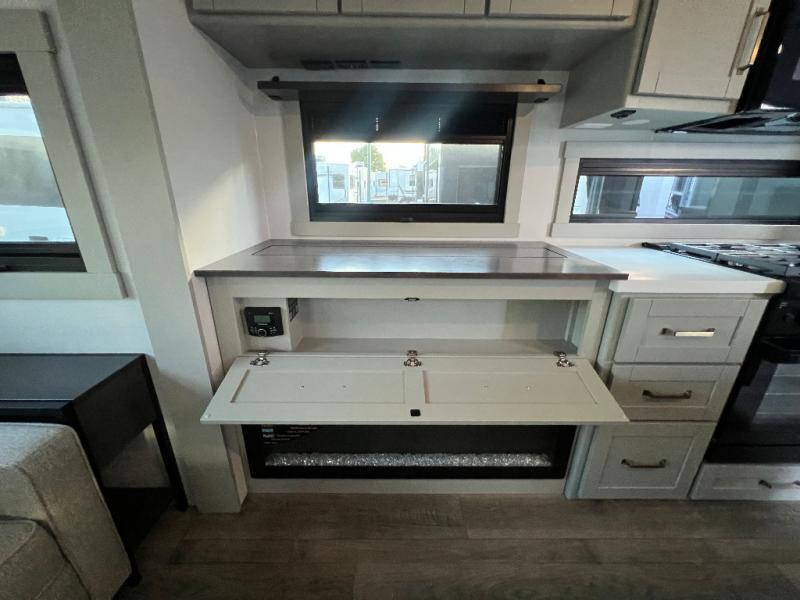 This unit is perfect for your family that needs sleeping space for eight! There is ample seating with a sliding desk/dining table, 62" theater seating, and a 72" tri-fold sofa along the rear wall. You can easily relax and enjoy the telescoping TV with a cozy fireplace below. The kitchen offers all that you need to prepare and cook meals just like home with a 16 cu. ft. refrigerator for your perishables, a 30" residential microwave oven, and three burner range top and oven. You will love the kitchen island all outfitted with pull-out pet bowls and double pull out trash bins with an integrated Stow & Go paper towel holder. There is also an 84" pantry with adjustable shelves for all of your canned and dry goods. Mid-coach, just ahead through the main entry, is a bonus room that can be used as a bedroom featuring a sofa bed with flip-up overhead bunk and trundle below, or an office with pull-out desk so that you can work easily while you travel, or it could also be used as a gaming room since there is also a 50" Smart TV. Head up the steps to a bathroom on your left and a private master suite with king bed slide all the way up front. A sliding dresser top features hidden storage which is perfect for jewelry and other personal belongings. The front wardrobe features mirrored doors and the corner closet has been prepped for a stackable washer and dryer if you choose to add that option.