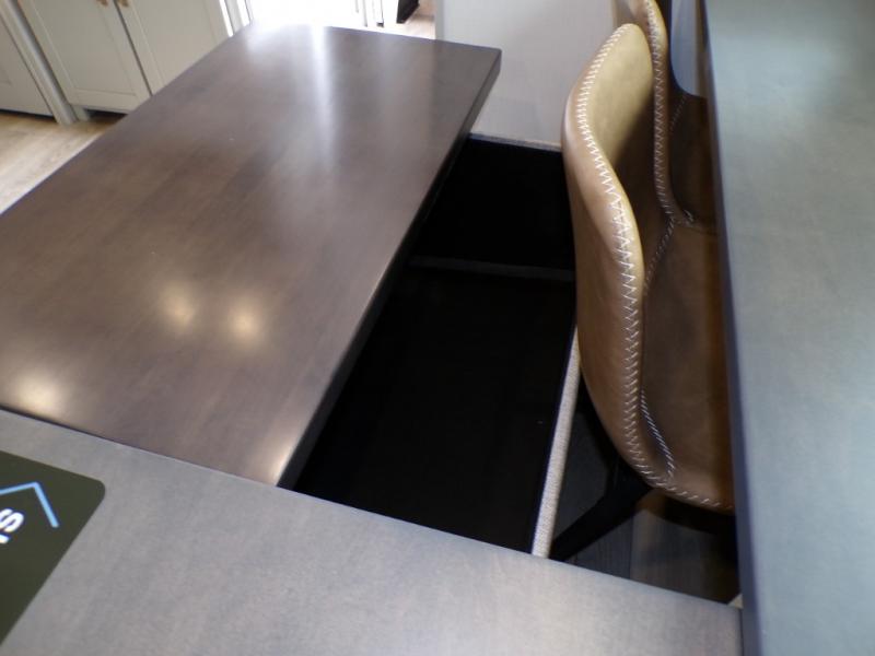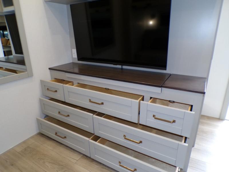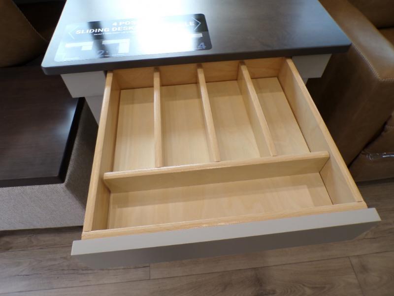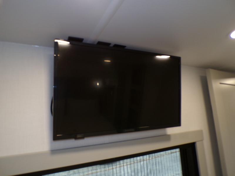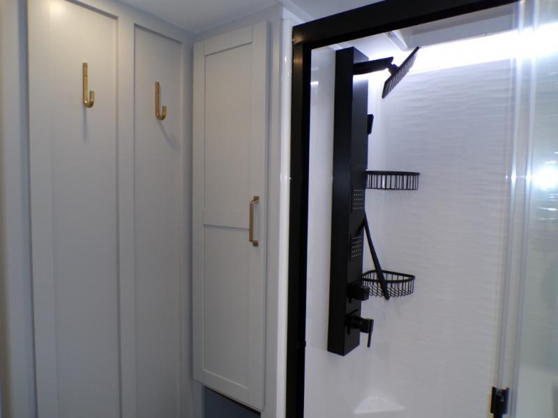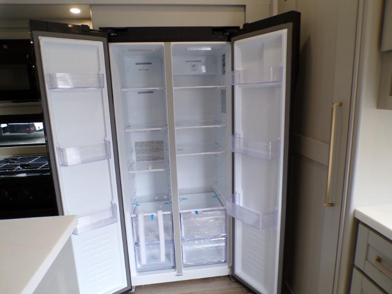 This unit is perfect for your family that needs sleeping space for eight! There is ample seating with a sliding desk/dining table, 62" theater seating, and a 72" tri-fold sofa along the rear wall. You can easily relax and enjoy the telescoping TV with a cozy fireplace below. The kitchen offers all that you need to prepare and cook meals just like home with a 16 cu. ft. refrigerator for your perishables, a 30" residential microwave oven, and three burner range top and oven. You will love the kitchen island all outfitted with pull-out pet bowls and double pull out trash bins with an integrated Stow & Go paper towel holder. There is also an 84" pantry with adjustable shelves for all of your canned and dry goods. Mid-coach, just ahead through the main entry, is a bonus room that can be used as a bedroom featuring a sofa bed with flip-up overhead bunk and trundle below, or an office with pull-out desk so that you can work easily while you travel, or it could also be used as a gaming room since there is also a 50" Smart TV. Head up the steps to a bathroom on your left and a private master suite with king bed slide all the way up front. A sliding dresser top features hidden storage which is perfect for jewelry and other personal belongings. The front wardrobe features mirrored doors and the corner closet has been prepped for a stackable washer and dryer if you choose to add that option.
