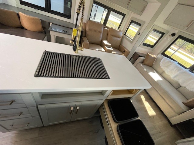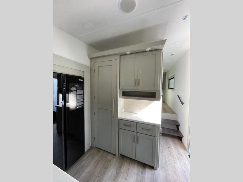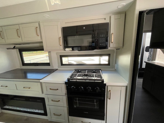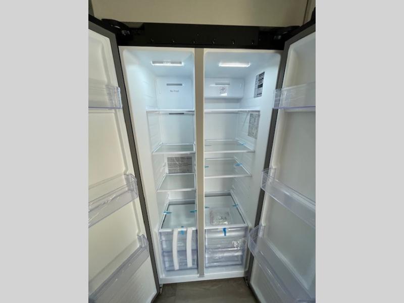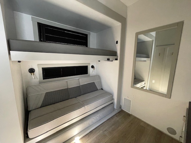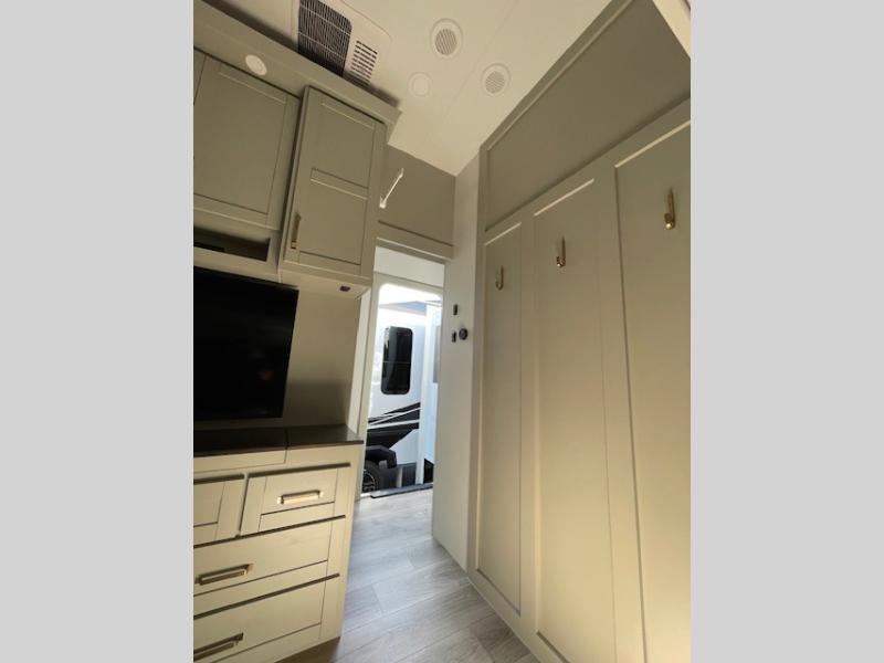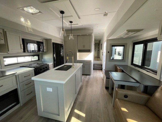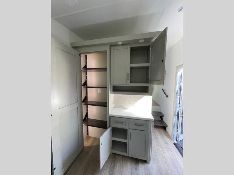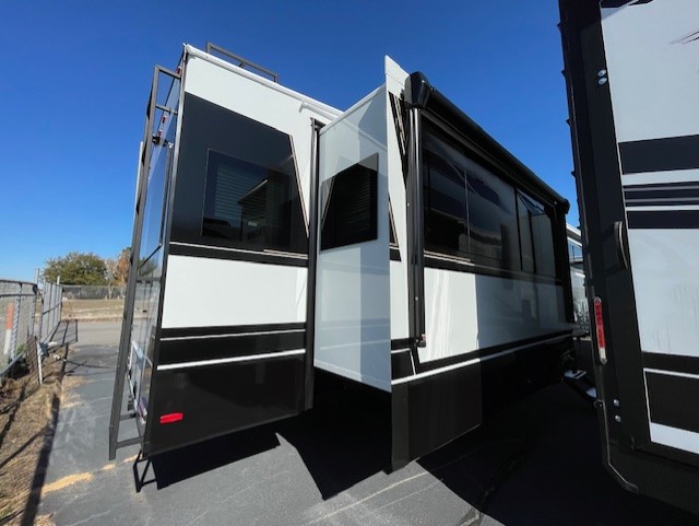 This unit is perfect for your family that needs sleeping space for eight! There is ample seating with a sliding desk/dining table, 62" theater seating, and a 72" tri-fold sofa along the rear wall. You can easily relax and enjoy the telescoping TV with a cozy fireplace below. The kitchen offers all that you need to prepare and cook meals just like home with a 16 cu. ft. refrigerator for your perishables, a 30" residential microwave oven, and three burner range top and oven. You will love the kitchen island all outfitted with pull-out pet bowls and double pull out trash bins with an integrated Stow & Go paper towel holder. There is also an 84" pantry with adjustable shelves for all of your canned and dry goods. Mid-coach, just ahead through the main entry, is a bonus room that can be used as a bedroom featuring a sofa bed with flip-up overhead bunk and trundle below, or an office with pull-out desk so that you can work easily while you travel, or it could also be used as a gaming room since there is also a 50" Smart TV. Head up the steps to a bathroom on your left and a private master suite with king bed slide all the way up front. A sliding dresser top features hidden storage which is perfect for jewelry and other personal belongings. The front wardrobe features mirrored doors and the corner closet has been prepped for a stackable washer and dryer if you choose to add that option.