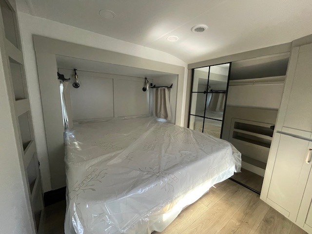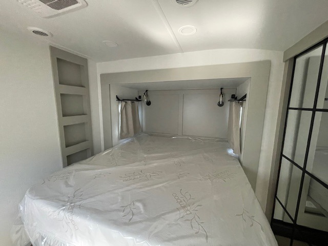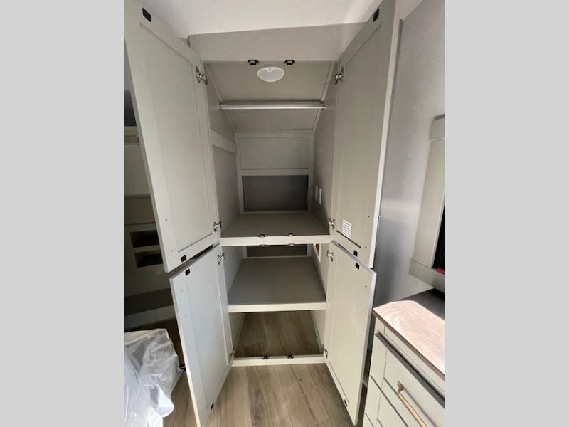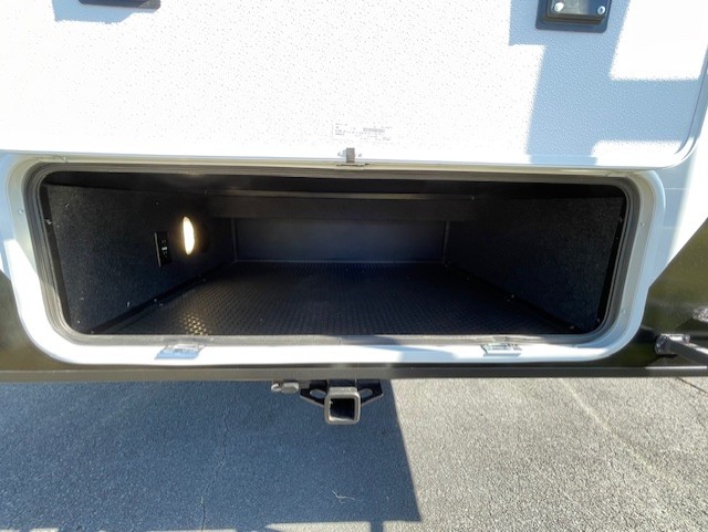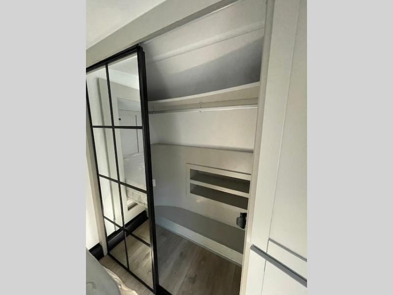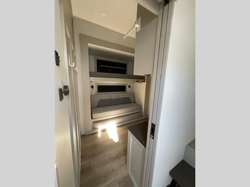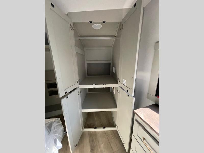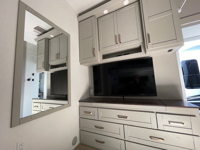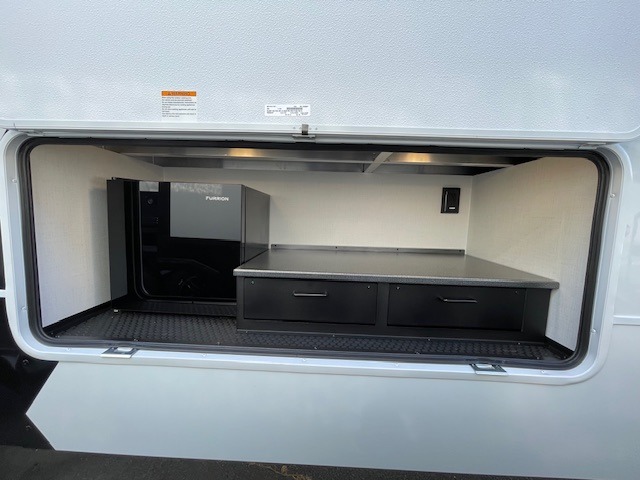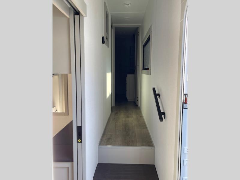 This unit is perfect for your family that needs sleeping space for eight! There is ample seating with a sliding desk/dining table, 62" theater seating, and a 72" tri-fold sofa along the rear wall. You can easily relax and enjoy the telescoping TV with a cozy fireplace below. The kitchen offers all that you need to prepare and cook meals just like home with a 16 cu. ft. refrigerator for your perishables, a 30" residential microwave oven, and three burner range top and oven. You will love the kitchen island all outfitted with pull-out pet bowls and double pull out trash bins with an integrated Stow & Go paper towel holder. There is also an 84" pantry with adjustable shelves for all of your canned and dry goods. Mid-coach, just ahead through the main entry, is a bonus room that can be used as a bedroom featuring a sofa bed with flip-up overhead bunk and trundle below, or an office with pull-out desk so that you can work easily while you travel, or it could also be used as a gaming room since there is also a 50" Smart TV. Head up the steps to a bathroom on your left and a private master suite with king bed slide all the way up front. A sliding dresser top features hidden storage which is perfect for jewelry and other personal belongings. The front wardrobe features mirrored doors and the corner closet has been prepped for a stackable washer and dryer if you choose to add that option.