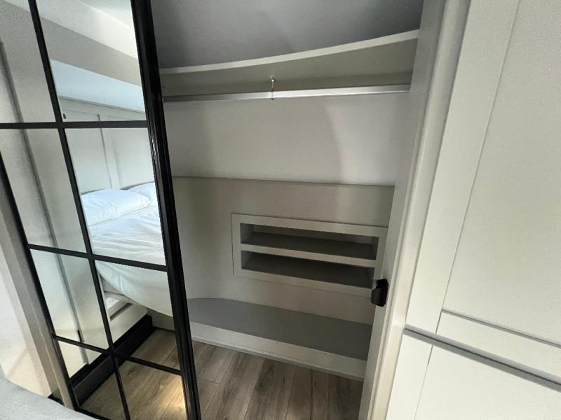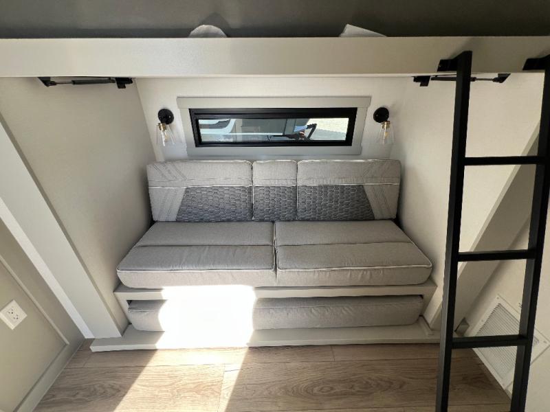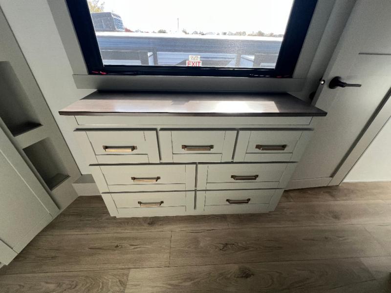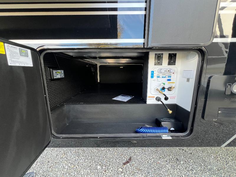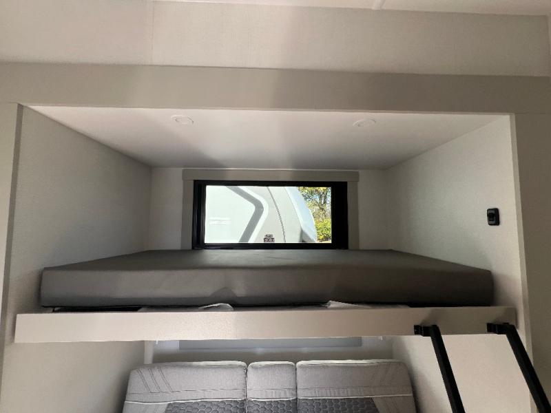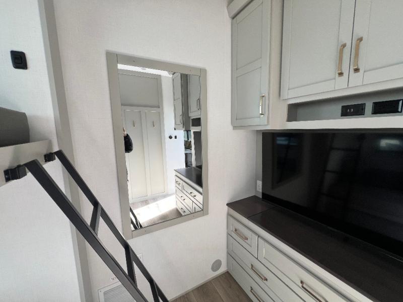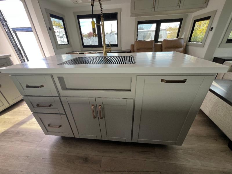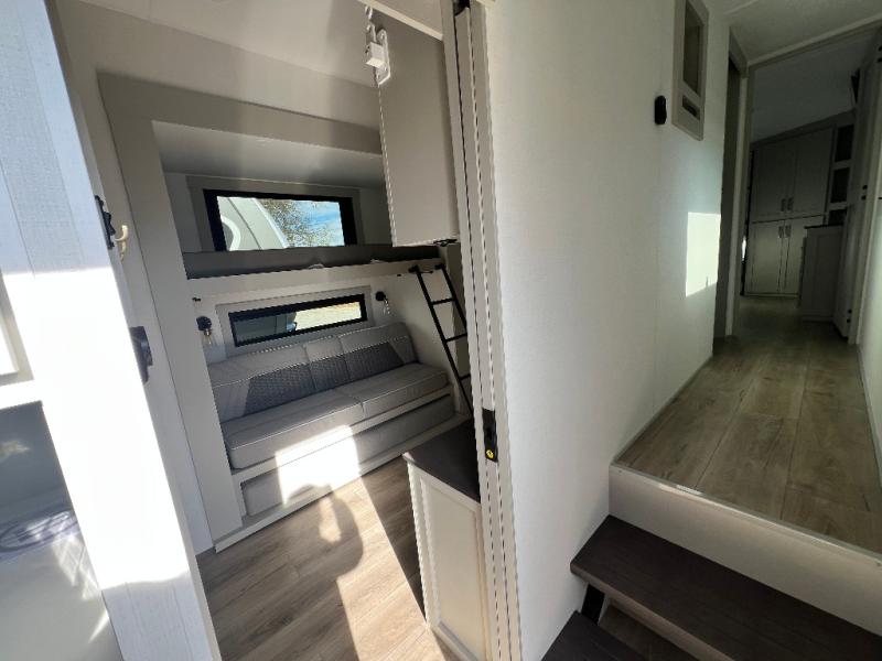 This unit is perfect for your family that needs sleeping space for eight! There is ample seating with a sliding desk/dining table, 62" theater seating, and a 72" tri-fold sofa along the rear wall. You can easily relax and enjoy the telescoping TV with a cozy fireplace below. The kitchen offers all that you need to prepare and cook meals just like home with a 16 cu. ft. refrigerator for your perishables, a 30" residential microwave oven, and three burner range top and oven. You will love the kitchen island all outfitted with pull-out pet bowls and double pull out trash bins with an integrated Stow & Go paper towel holder. There is also an 84" pantry with adjustable shelves for all of your canned and dry goods. Mid-coach, just ahead through the main entry, is a bonus room that can be used as a bedroom featuring a sofa bed with flip-up overhead bunk and trundle below, or an office with pull-out desk so that you can work easily while you travel, or it could also be used as a gaming room since there is also a 50" Smart TV. Head up the steps to a bathroom on your left and a private master suite with king bed slide all the way up front. A sliding dresser top features hidden storage which is perfect for jewelry and other personal belongings. The front wardrobe features mirrored doors and the corner closet has been prepped for a stackable washer and dryer if you choose to add that option.
