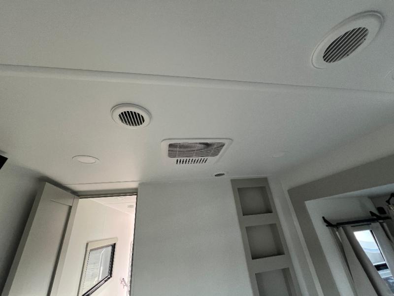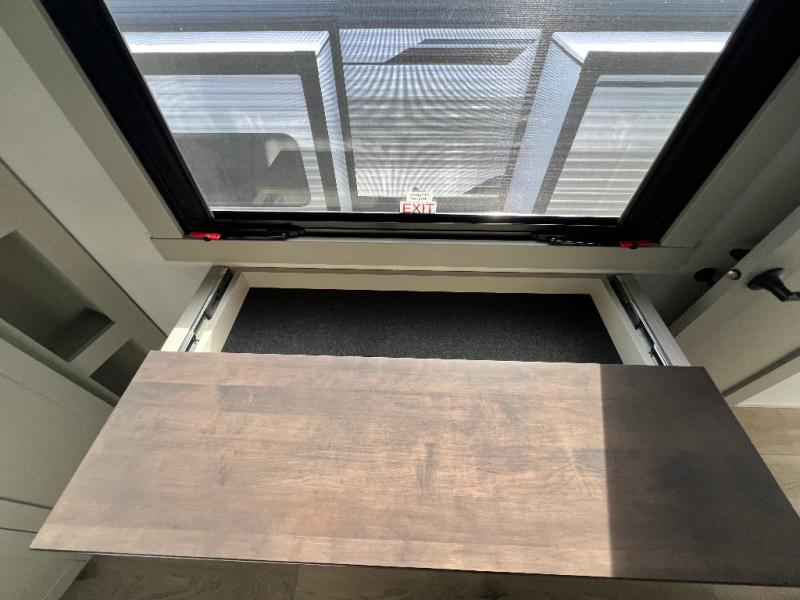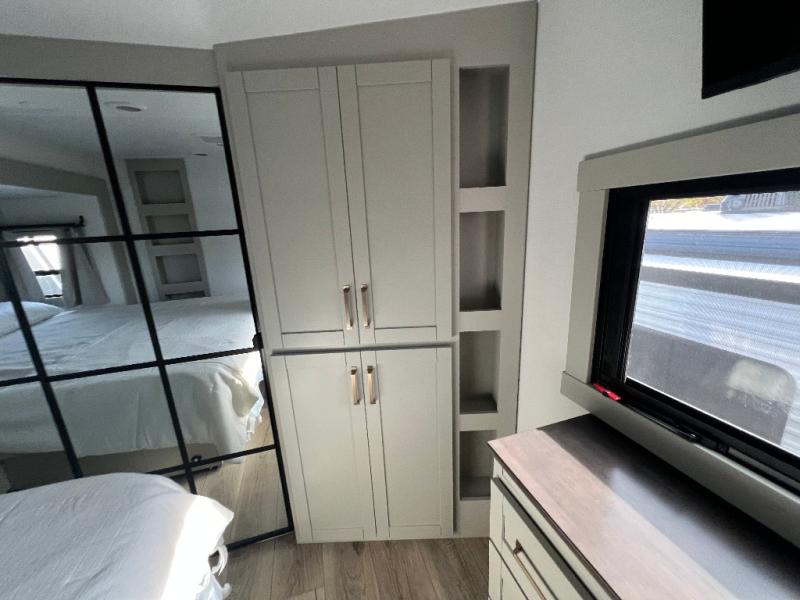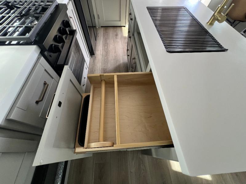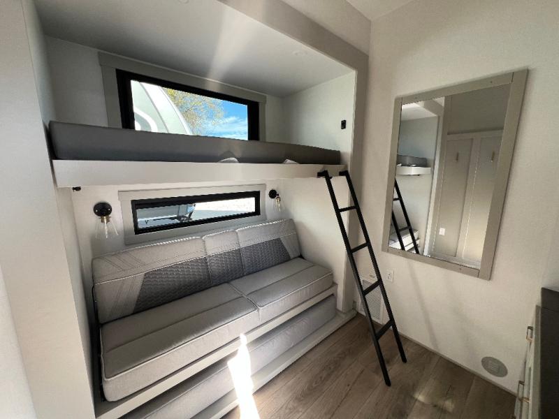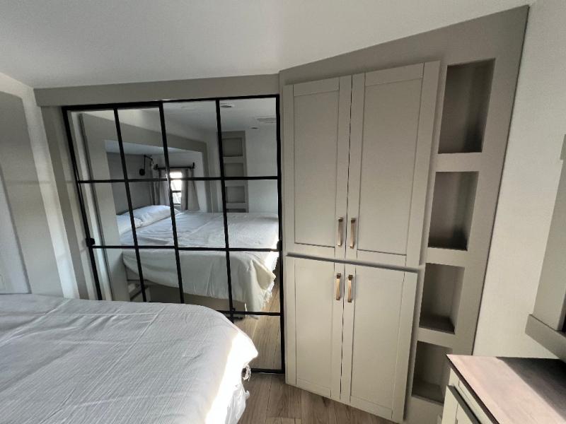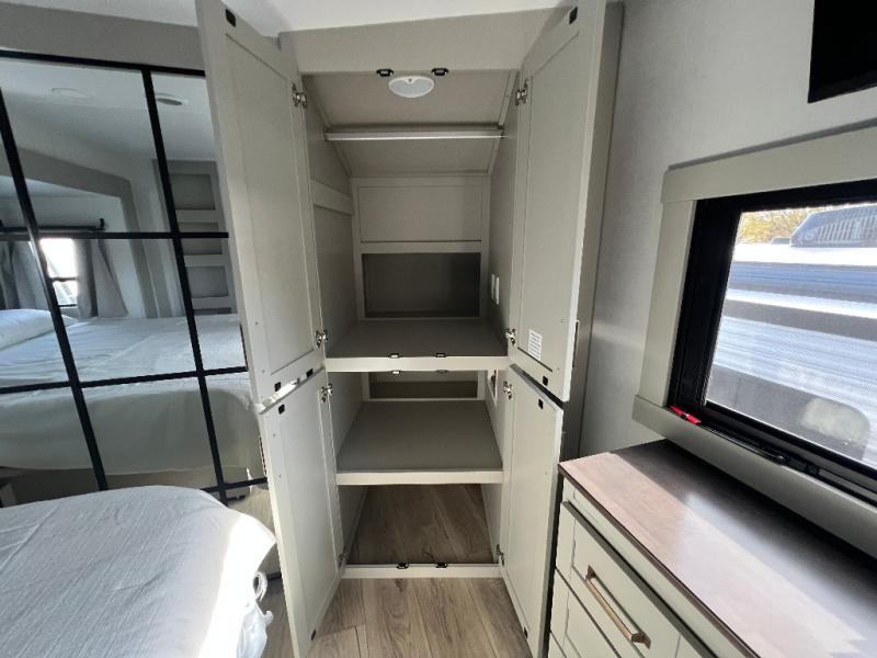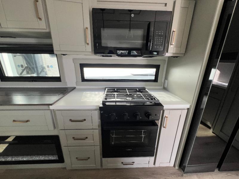 This unit is perfect for your family that needs sleeping space for eight! There is ample seating with a sliding desk/dining table, 62" theater seating, and a 72" tri-fold sofa along the rear wall. You can easily relax and enjoy the telescoping TV with a cozy fireplace below. The kitchen offers all that you need to prepare and cook meals just like home with a 16 cu. ft. refrigerator for your perishables, a 30" residential microwave oven, and three burner range top and oven. You will love the kitchen island all outfitted with pull-out pet bowls and double pull out trash bins with an integrated Stow & Go paper towel holder. There is also an 84" pantry with adjustable shelves for all of your canned and dry goods. Mid-coach, just ahead through the main entry, is a bonus room that can be used as a bedroom featuring a sofa bed with flip-up overhead bunk and trundle below, or an office with pull-out desk so that you can work easily while you travel, or it could also be used as a gaming room since there is also a 50" Smart TV. Head up the steps to a bathroom on your left and a private master suite with king bed slide all the way up front. A sliding dresser top features hidden storage which is perfect for jewelry and other personal belongings. The front wardrobe features mirrored doors and the corner closet has been prepped for a stackable washer and dryer if you choose to add that option.