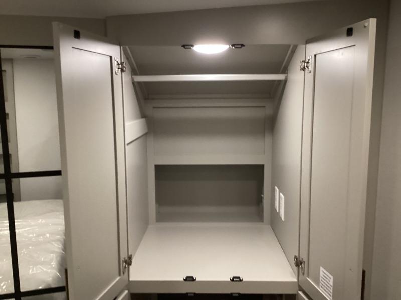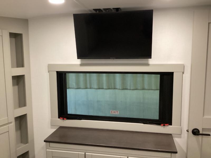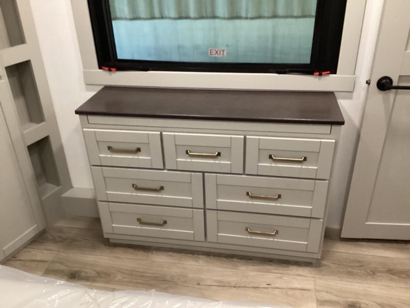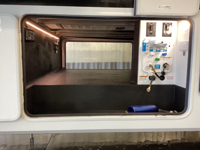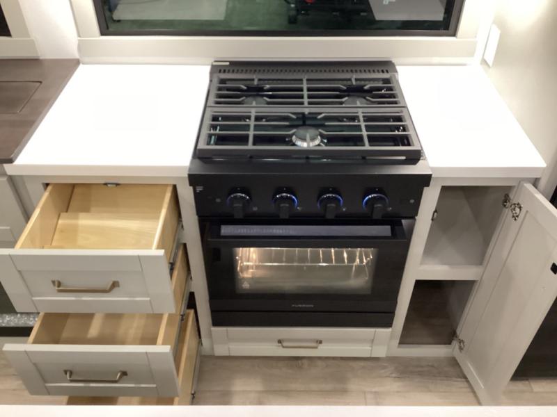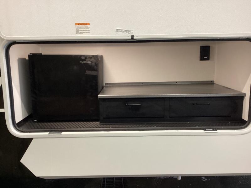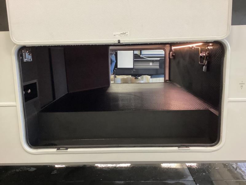 Inside, you’ll discover an expansive living area featuring theater-style seating, a 72-inch tri-fold sofa, and a built-in entertainment center with fireplace. The chef-worthy kitchen includes a large island, 16 cu ft refrigerator, and premium storage. Mid-coach, a bonus room adds flexibility — use it as a bunk or sofa bed space, office, or gaming room. Up front, the master suite offers a king-size bed, sliding dresser with hidden storage, and washer/dryer prep. With four slide-outs to open the space wide, you’ll feel like you brought the comforts of home to the campground.