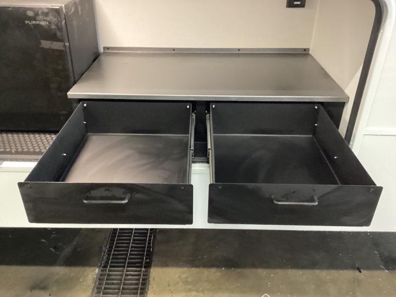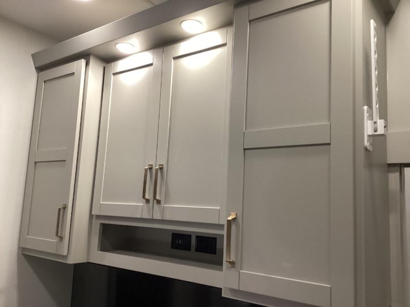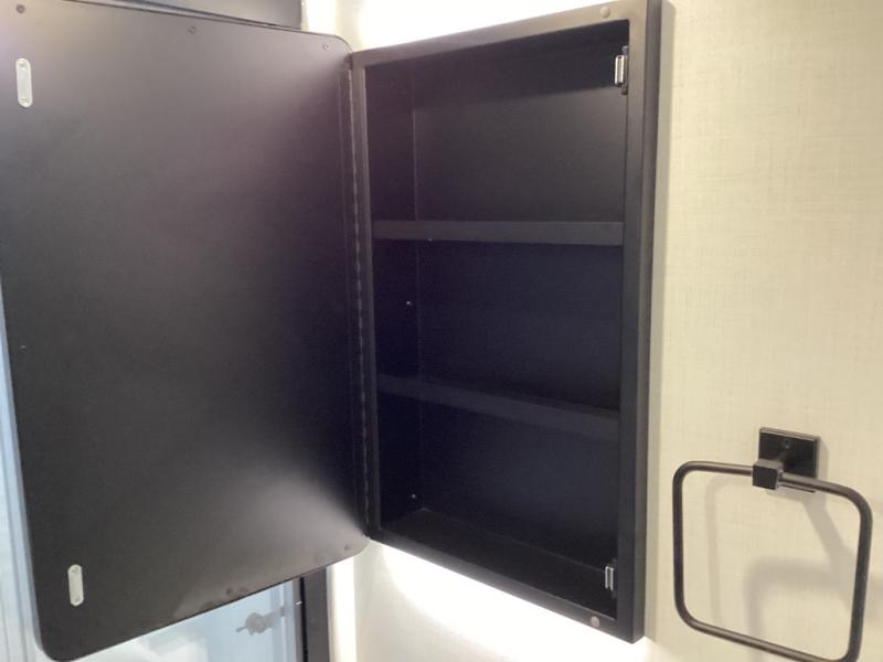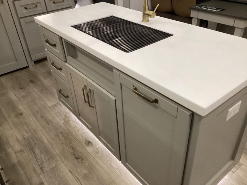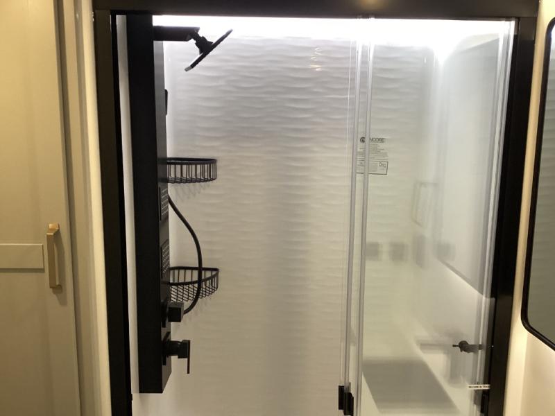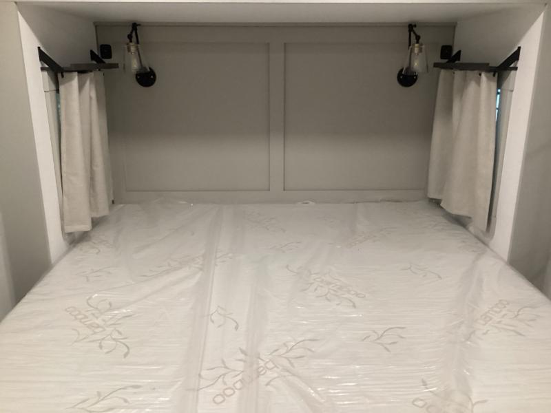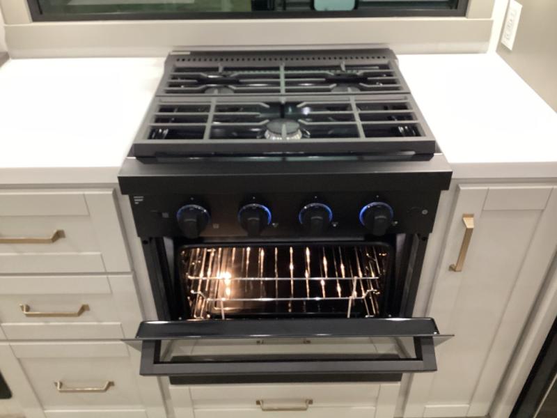 Inside, you’ll discover an expansive living area featuring theater-style seating, a 72-inch tri-fold sofa, and a built-in entertainment center with fireplace. The chef-worthy kitchen includes a large island, 16 cu ft refrigerator, and premium storage. Mid-coach, a bonus room adds flexibility — use it as a bunk or sofa bed space, office, or gaming room. Up front, the master suite offers a king-size bed, sliding dresser with hidden storage, and washer/dryer prep. With four slide-outs to open the space wide, you’ll feel like you brought the comforts of home to the campground.