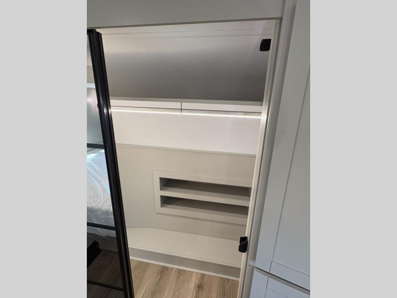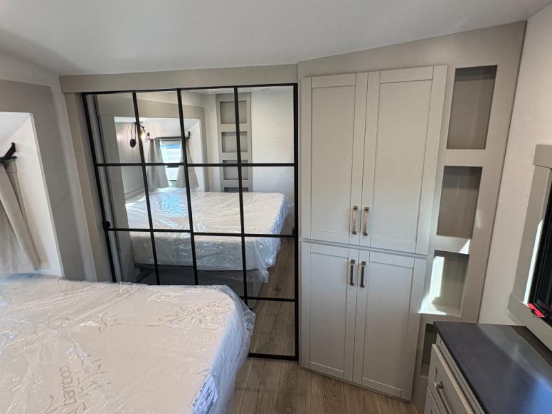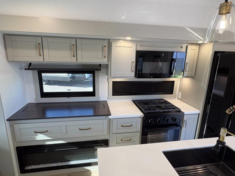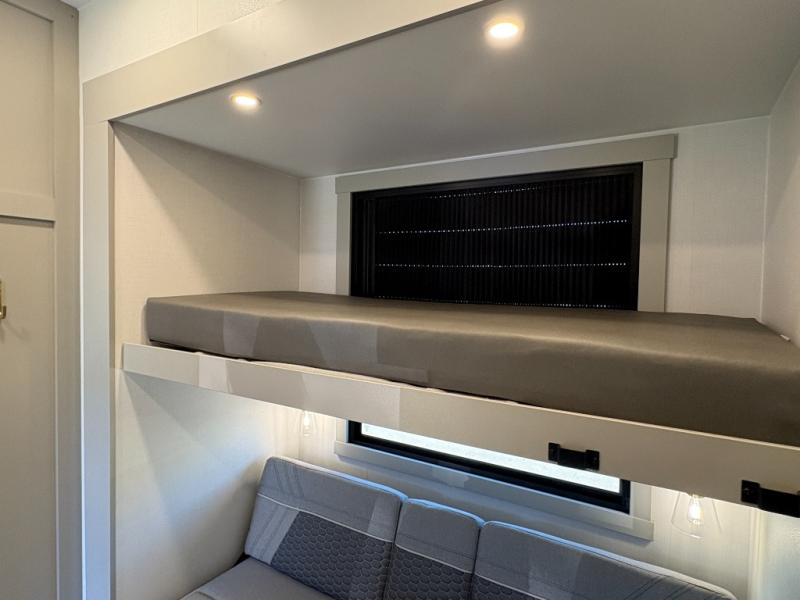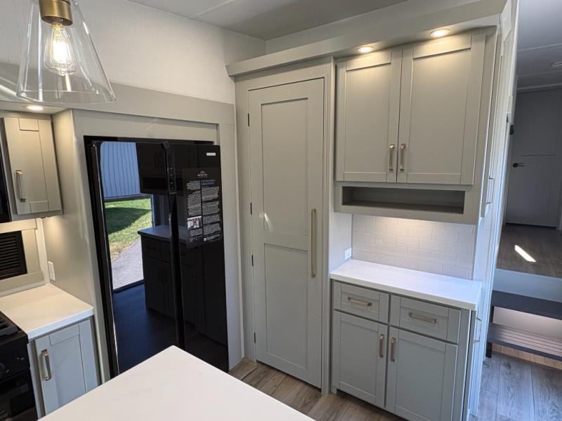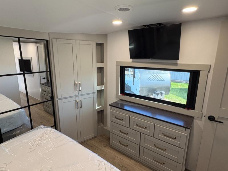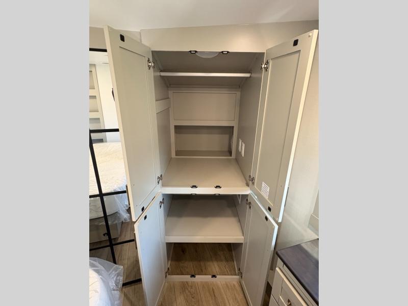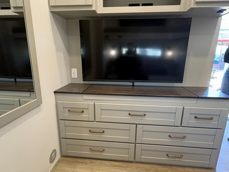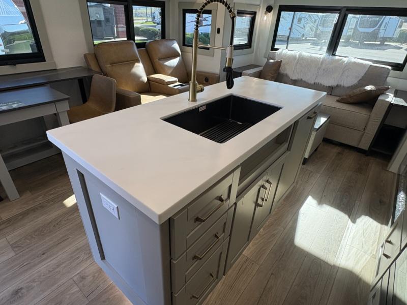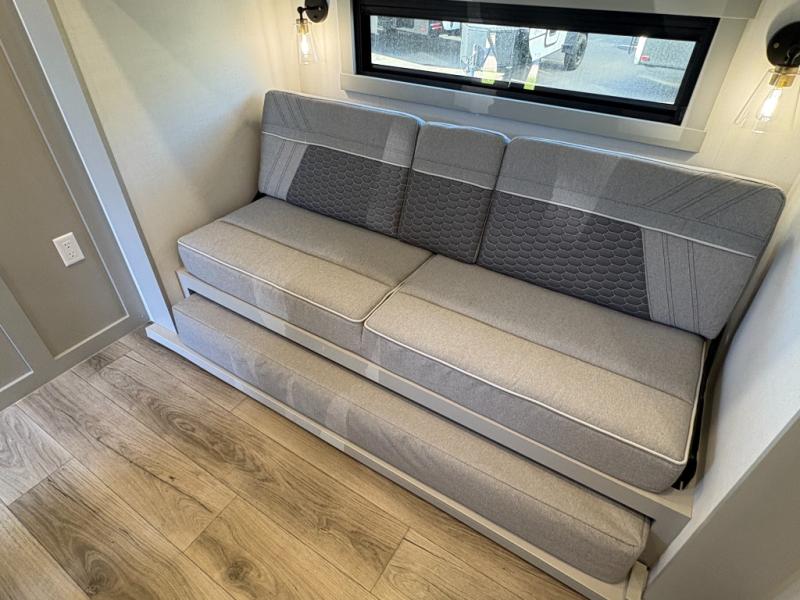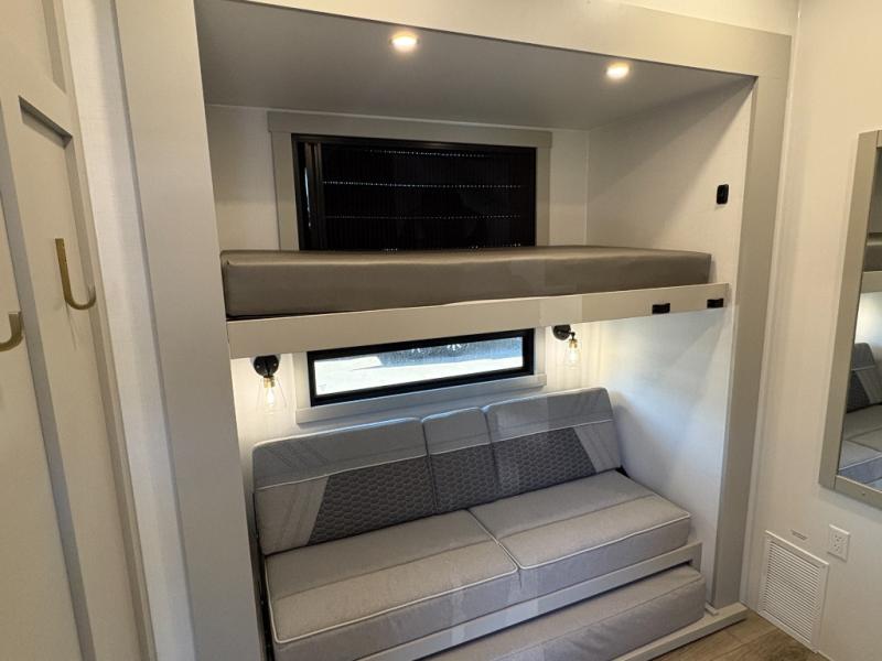 This unit is perfect for your family that needs sleeping space for eight! There is ample seating with a sliding desk/dining table, 62" theater seating, and a 72" tri-fold sofa along the rear wall. You can easily relax and enjoy the telescoping TV with a cozy fireplace below. The kitchen offers all that you need to prepare and cook meals just like home with a 16 cu. ft. refrigerator for your perishables, a 30" residential microwave oven, and three burner range top and oven. You will love the kitchen island all outfitted with pull-out pet bowls and double pull out trash bins with an integrated Stow & Go paper towel holder. There is also an 84" pantry with adjustable shelves for all of your canned and dry goods. Mid-coach, just ahead through the main entry, is a bonus room that can be used as a bedroom featuring a sofa bed with flip-up overhead bunk and trundle below, or an office with pull-out desk so that you can work easily while you travel, or it could also be used as a gaming room since there is also a 50" Smart TV. Head up the steps to a bathroom on your left and a private master suite with king bed slide all the way up front. A sliding dresser top features hidden storage which is perfect for jewelry and other personal belongings. The front wardrobe features mirrored doors and the corner closet has been prepped for a stackable washer and dryer if you choose to add that option.