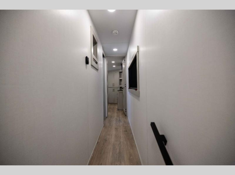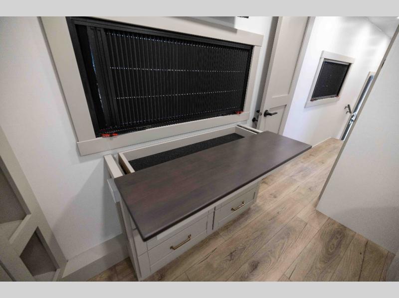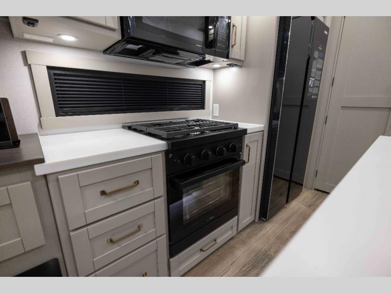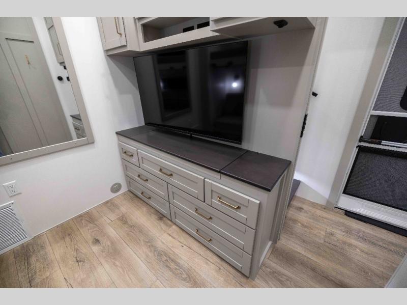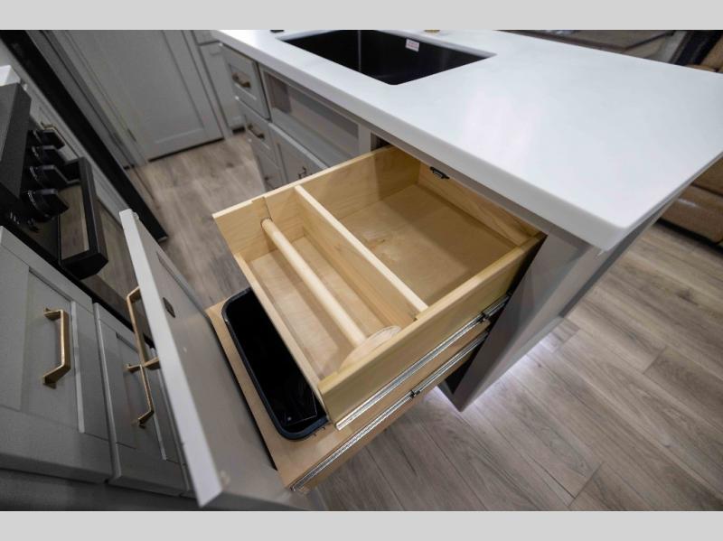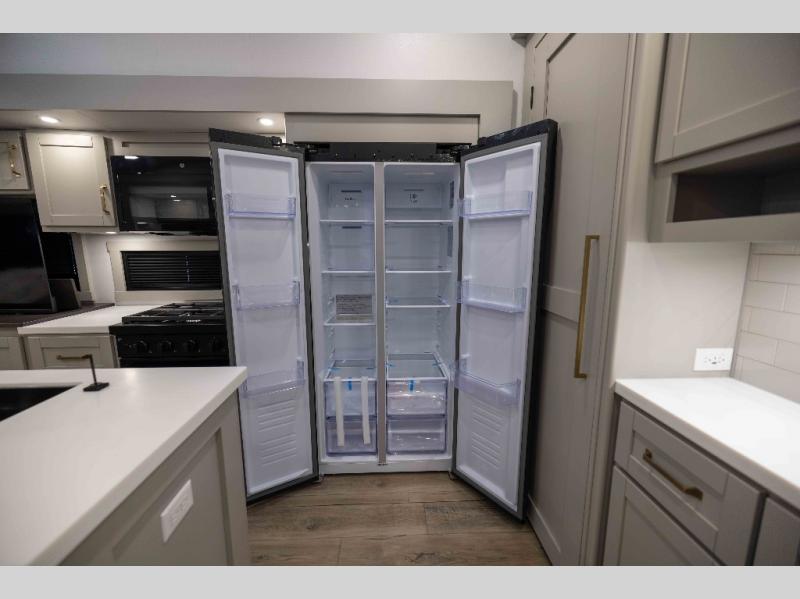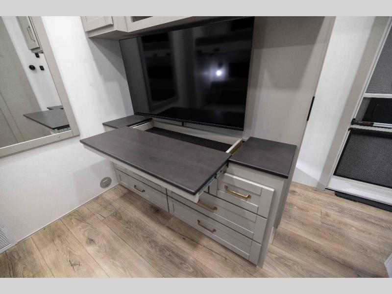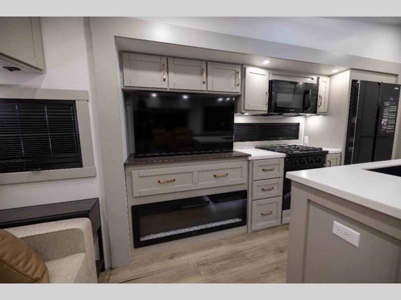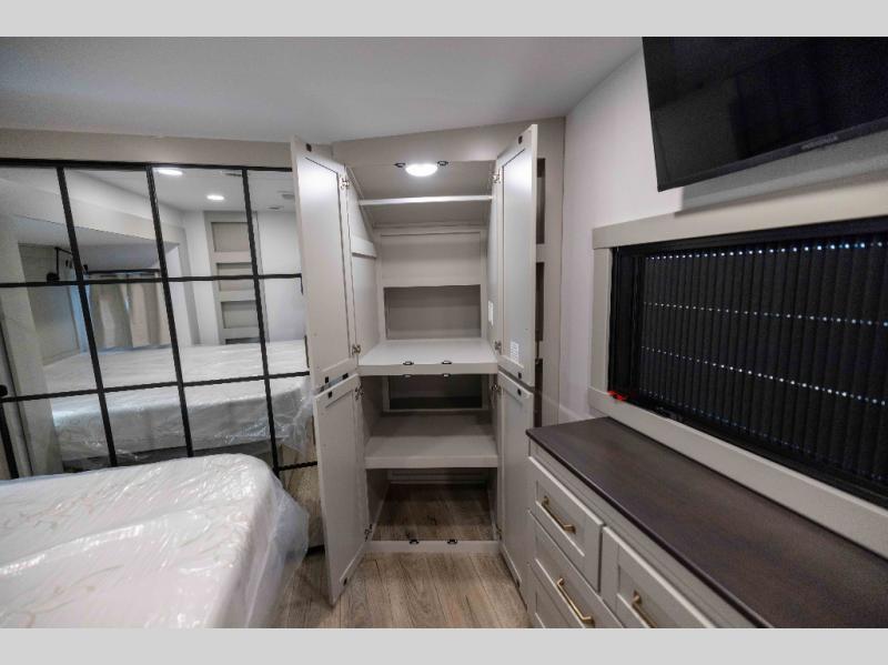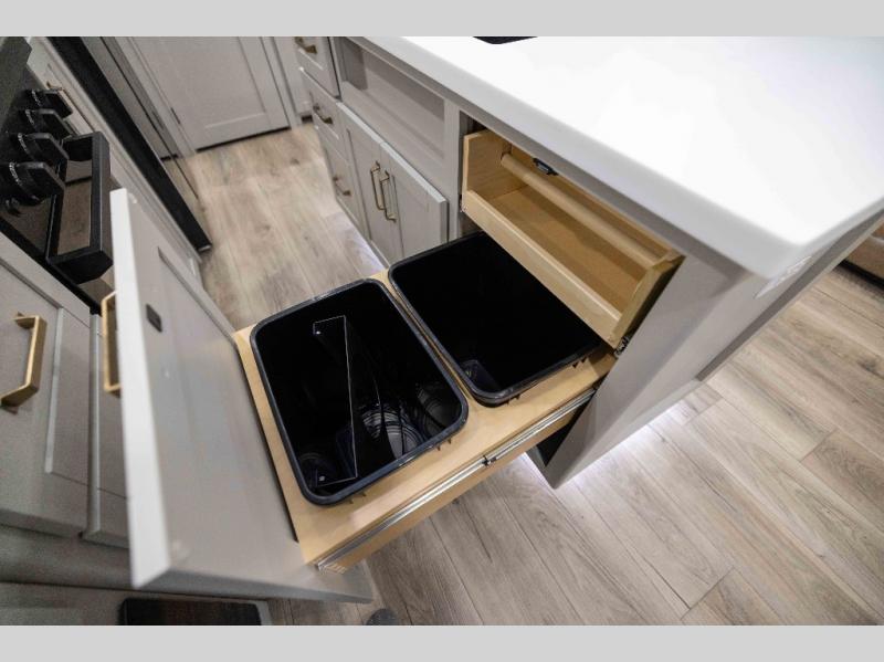 This unit is perfect for your family that needs sleeping space for eight! There is ample seating with a sliding desk/dining table, 62" theater seating, and a 72" tri-fold sofa along the rear wall. You can easily relax and enjoy the telescoping TV with a cozy fireplace below. The kitchen offers all that you need to prepare and cook meals just like home with a 16 cu. ft. refrigerator for your perishables, a 30" residential microwave oven, and three burner range top and oven. You will love the kitchen island all outfitted with pull-out pet bowls and double pull out trash bins with an integrated Stow & Go paper towel holder. There is also an 84" pantry with adjustable shelves for all of your canned and dry goods. Mid-coach, just ahead through the main entry, is a bonus room that can be used as a bedroom featuring a sofa bed with flip-up overhead bunk and trundle below, or an office with pull-out desk so that you can work easily while you travel, or it could also be used as a gaming room since there is also a 50" Smart TV. Head up the steps to a bathroom on your left and a private master suite with king bed slide all the way up front. A sliding dresser top features hidden storage which is perfect for jewelry and other personal belongings. The front wardrobe features mirrored doors and the corner closet has been prepped for a stackable washer and dryer if you choose to add that option.