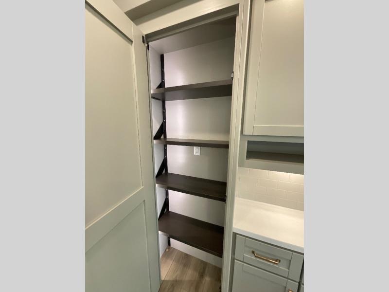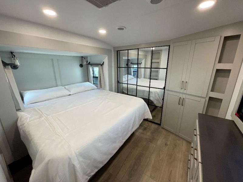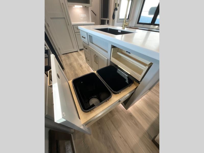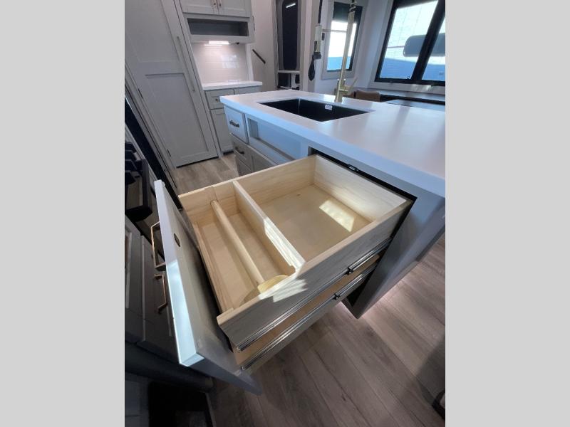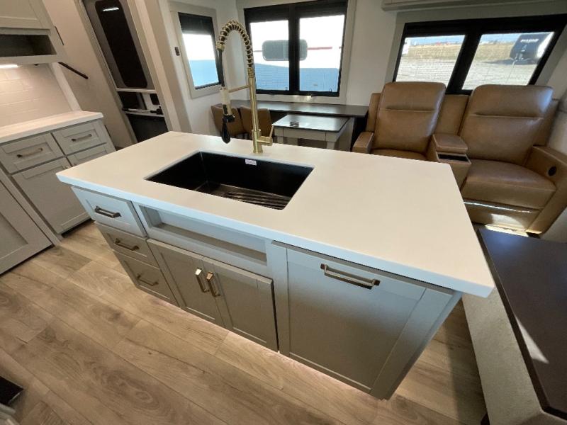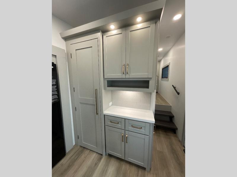This unit is perfect for your family that needs sleeping space for eight! There is ample seating with a sliding desk/dining table, 62" theater seating, and a 72" tri-fold sofa along the rear wall. You can easily relax and enjoy the telescoping TV with a cozy fireplace below. The kitchen offers all that you need to prepare and cook meals just like home with a 16 cu. ft. refrigerator for your perishables, a 30" residential microwave oven, and three burner range top and oven. You will love the kitchen island all outfitted with pull-out pet bowls and double pull out trash bins with an integrated Stow & Go paper towel holder. There is also an 84" pantry with adjustable shelves for all of your canned and dry goods. Mid-coach, just ahead through the main entry, is a bonus room that can be used as a bedroom featuring a sofa bed with flip-up overhead bunk and trundle below, or an office with pull-out desk so that you can work easily while you travel, or it could also be used as a gaming room since there is also a 50" Smart TV. Head up the steps to a bathroom on your left and a private master suite with king bed slide all the way up front. A sliding dresser top features hidden storage which is perfect for jewelry and other personal belongings. The front wardrobe features mirrored doors and the corner closet has been prepped for a stackable washer and dryer if you choose to add that option.