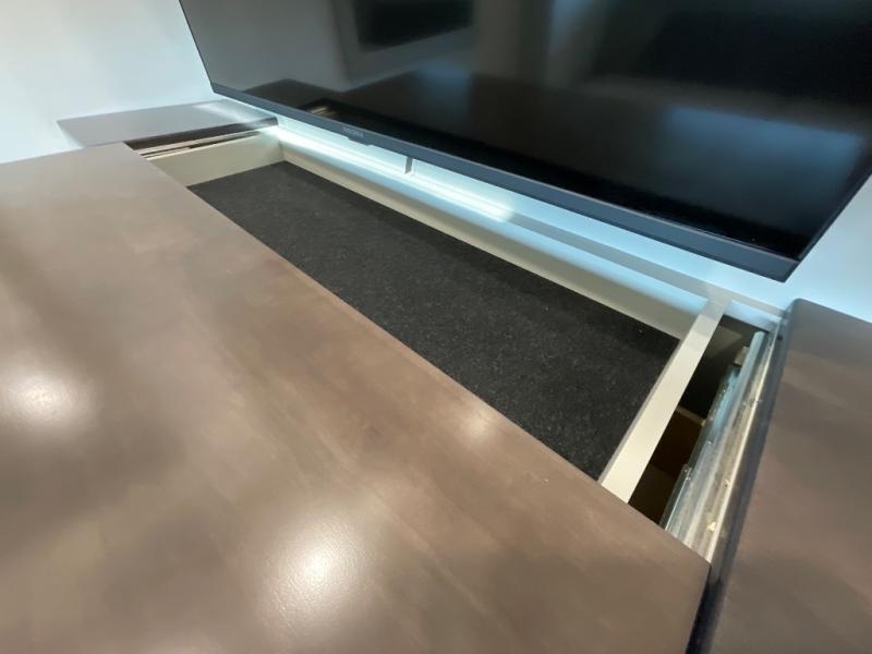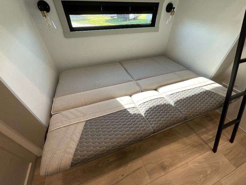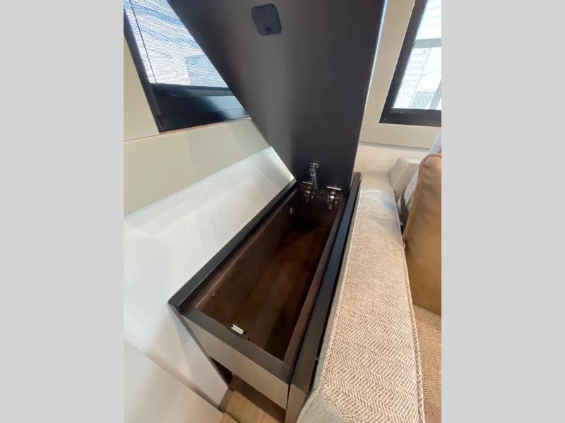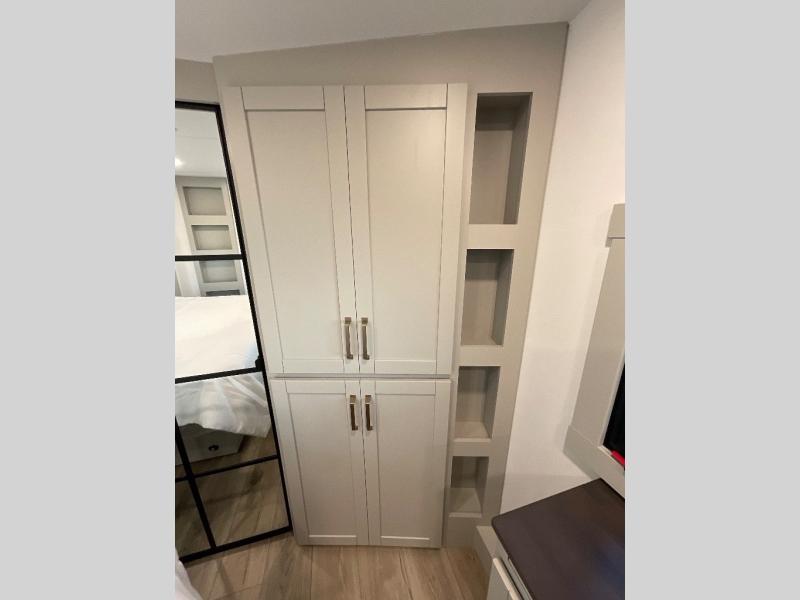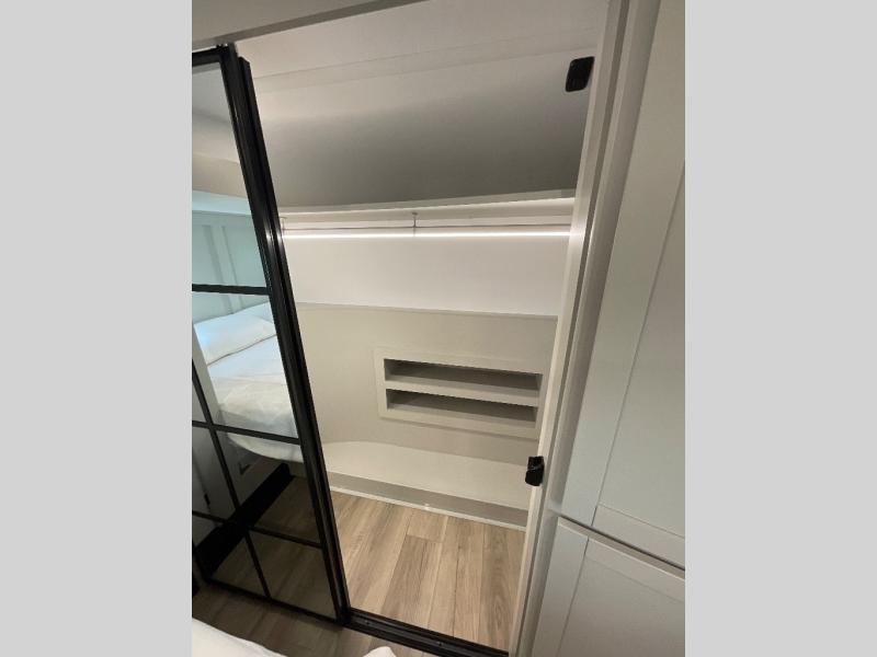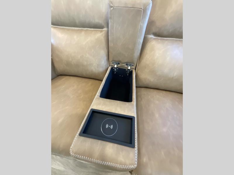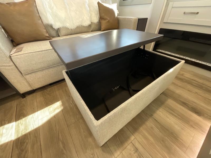 This unit is perfect for your family that needs sleeping space for eight! There is ample seating with a sliding desk/dining table, 62" theater seating, and a 72" tri-fold sofa along the rear wall. You can easily relax and enjoy the telescoping TV with a cozy fireplace below. The kitchen offers all that you need to prepare and cook meals just like home with a 16 cu. ft. refrigerator for your perishables, a 30" residential microwave oven, and three burner range top and oven. You will love the kitchen island all outfitted with pull-out pet bowls and double pull out trash bins with an integrated Stow & Go paper towel holder. There is also an 84" pantry with adjustable shelves for all of your canned and dry goods. Mid-coach, just ahead through the main entry, is a bonus room that can be used as a bedroom featuring a sofa bed with flip-up overhead bunk and trundle below, or an office with pull-out desk so that you can work easily while you travel, or it could also be used as a gaming room since there is also a 50" Smart TV. Head up the steps to a bathroom on your left and a private master suite with king bed slide all the way up front. A sliding dresser top features hidden storage which is perfect for jewelry and other personal belongings. The front wardrobe features mirrored doors and the corner closet has been prepped for a stackable washer and dryer if you choose to add that option.