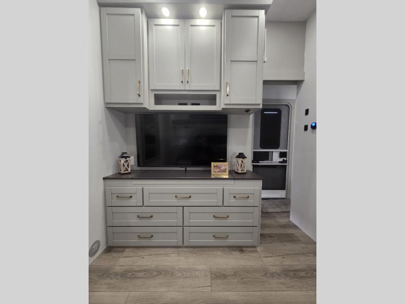 This unit is perfect for your family that needs sleeping space for eight! There is ample seating with a sliding desk/dining table, 62" theater seating, and a 72" tri-fold sofa along the rear wall. You can easily relax and enjoy the telescoping TV with a cozy fireplace below. The kitchen offers all that you need to prepare and cook meals just like home with a 16 cu. ft. refrigerator for your perishables, a 30" residential microwave oven, and three burner range top and oven. You will love the kitchen island all outfitted with pull-out pet bowls and double pull out trash bins with an integrated Stow & Go paper towel holder. There is also an 84" pantry with adjustable shelves for all of your canned and dry goods. Mid-coach, just ahead through the main entry, is a bonus room that can be used as a bedroom featuring a sofa bed with flip-up overhead bunk and trundle below, or an office with pull-out desk so that you can work easily while you travel, or it could also be used as a gaming room since there is also a 50" Smart TV. Head up the steps to a bathroom on your left and a private master suite with king bed slide all the way up front. A sliding dresser top features hidden storage which is perfect for jewelry and other personal belongings. The front wardrobe features mirrored doors and the corner closet has been prepped for a stackable washer and dryer if you choose to add that option.