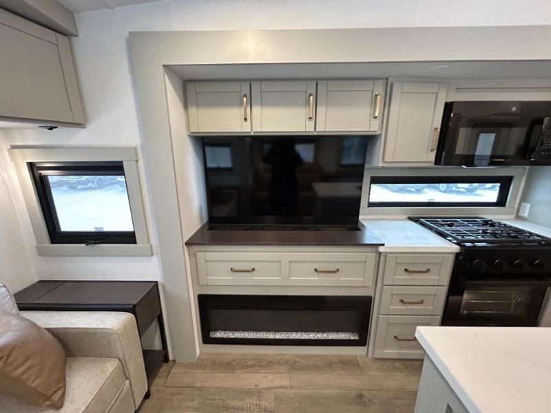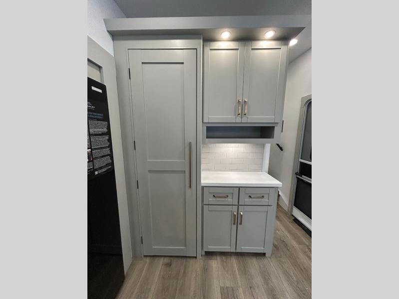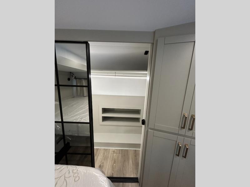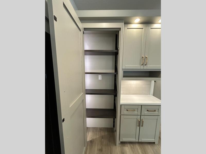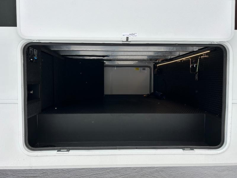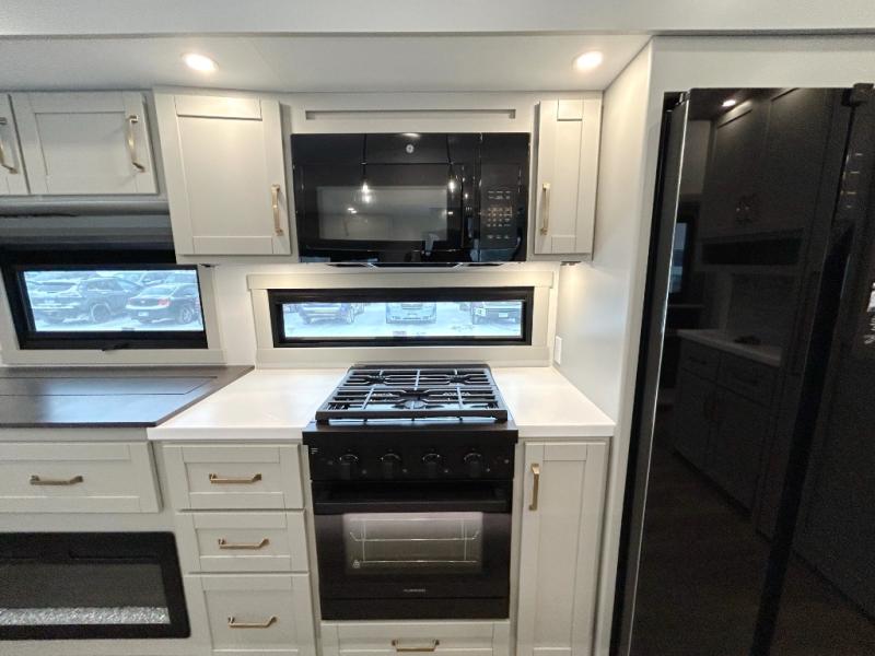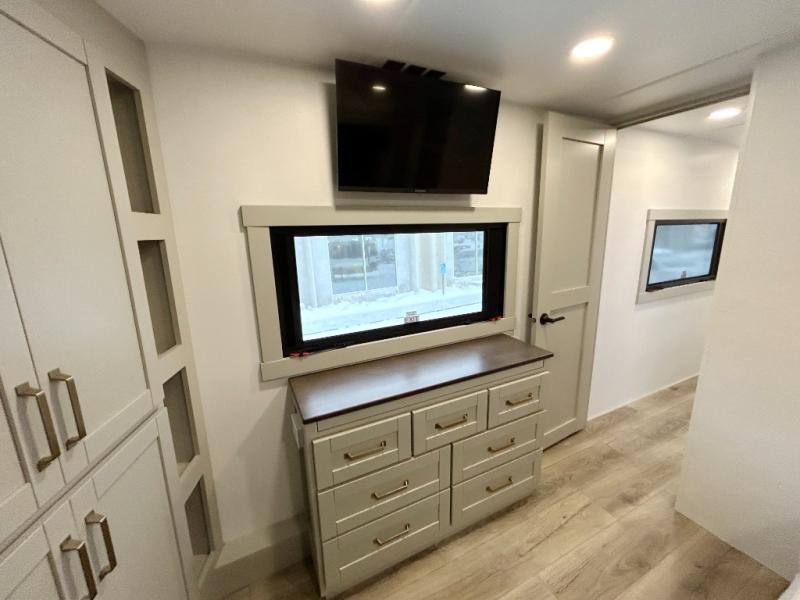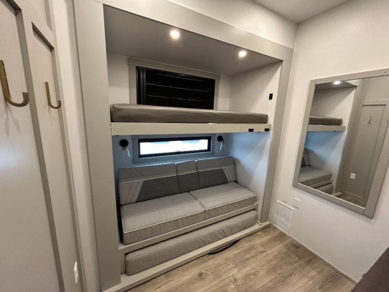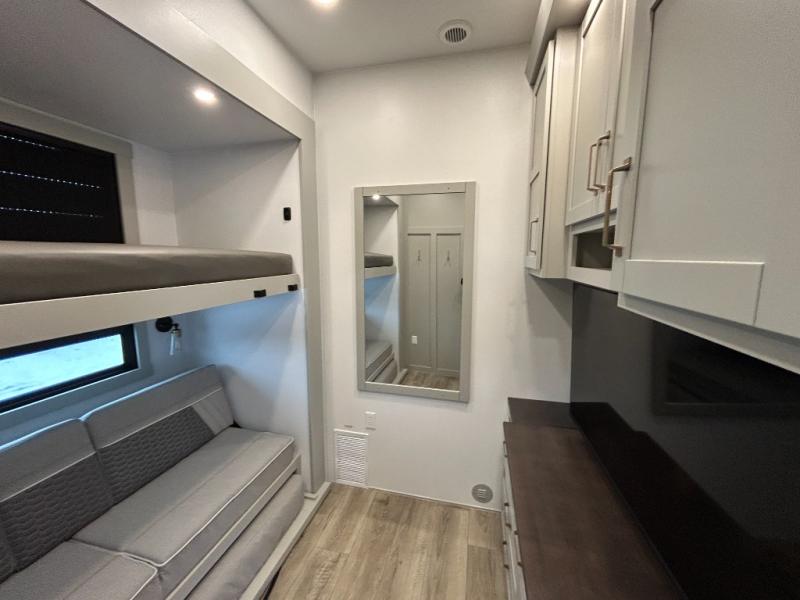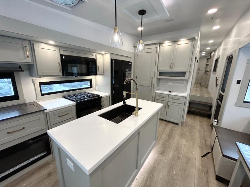 This unit is perfect for your family that needs sleeping space for eight! There is ample seating with a sliding desk/dining table, 62" theater seating, and a 72" tri-fold sofa along the rear wall. You can easily relax and enjoy the telescoping TV with a cozy fireplace below. The kitchen offers all that you need to prepare and cook meals just like home with a 16 cu. ft. refrigerator for your perishables, a 30" residential microwave oven, and three burner range top and oven. You will love the kitchen island all outfitted with pull-out pet bowls and double pull out trash bins with an integrated Stow & Go paper towel holder. There is also an 84" pantry with adjustable shelves for all of your canned and dry goods. Mid-coach, just ahead through the main entry, is a bonus room that can be used as a bedroom featuring a sofa bed with flip-up overhead bunk and trundle below, or an office with pull-out desk so that you can work easily while you travel, or it could also be used as a gaming room since there is also a 50" Smart TV. Head up the steps to a bathroom on your left and a private master suite with king bed slide all the way up front. A sliding dresser top features hidden storage which is perfect for jewelry and other personal belongings. The front wardrobe features mirrored doors and the corner closet has been prepped for a stackable washer and dryer if you choose to add that option.