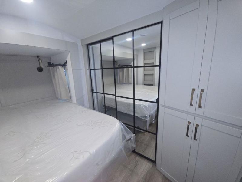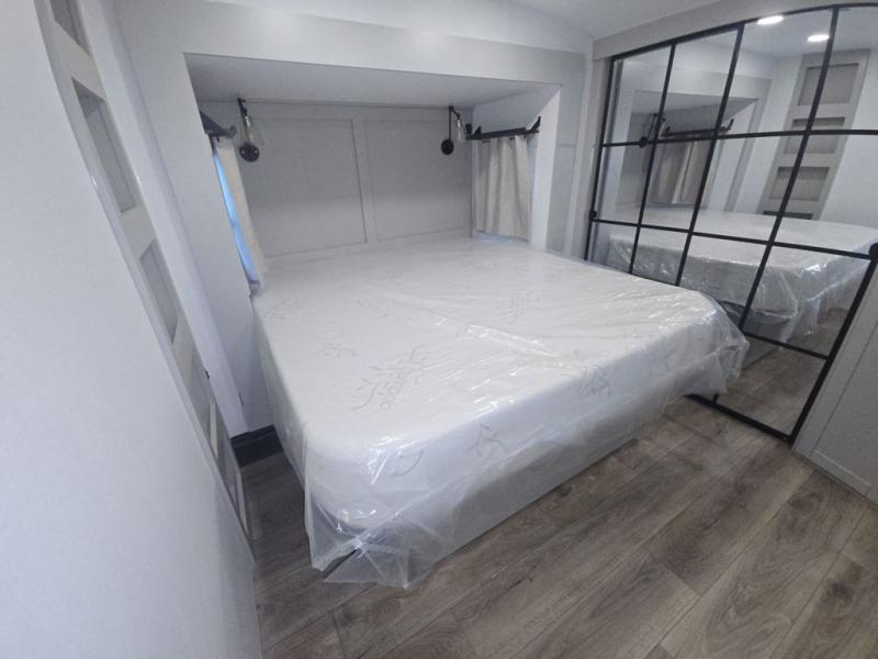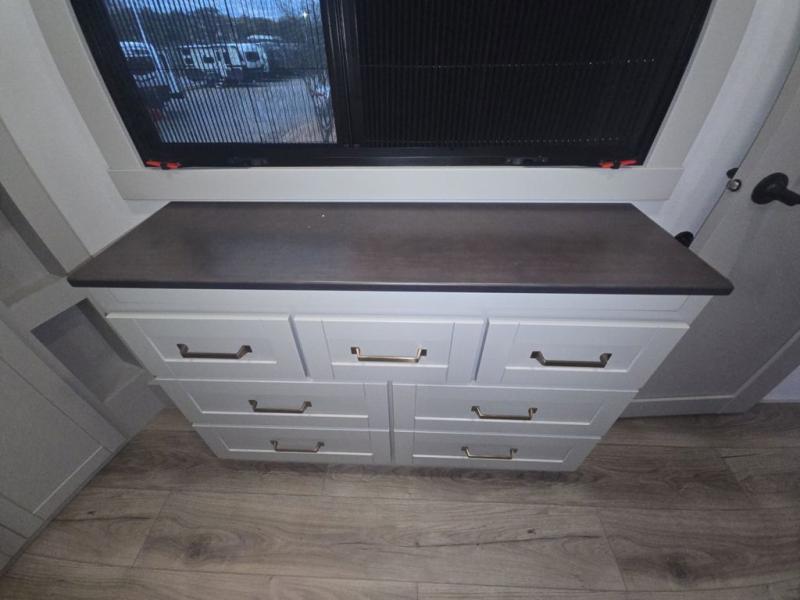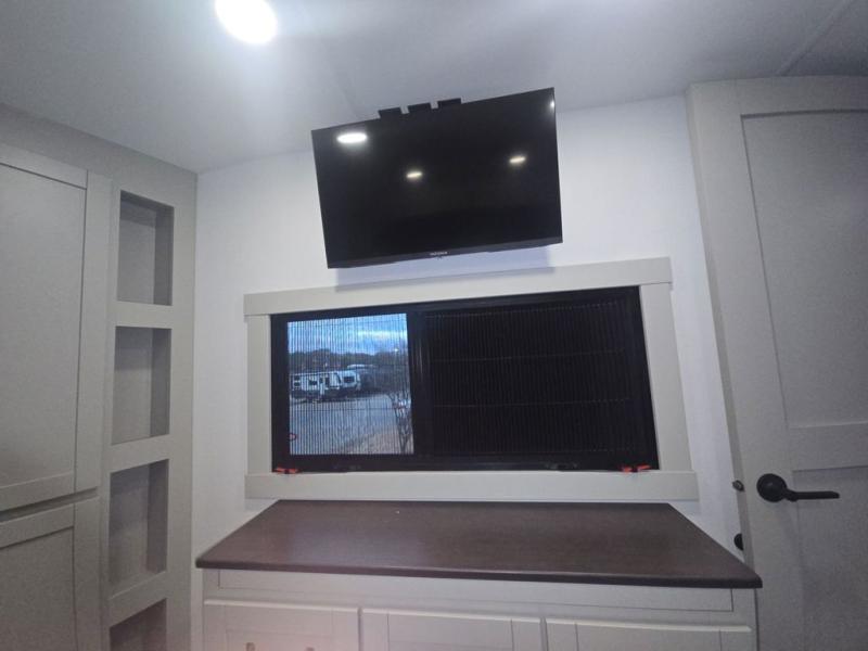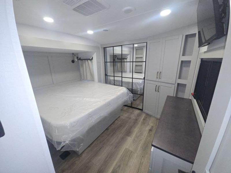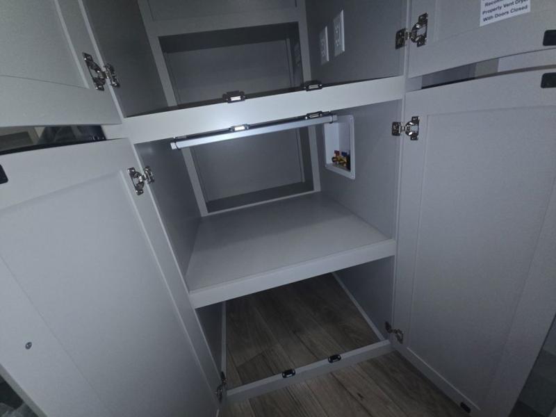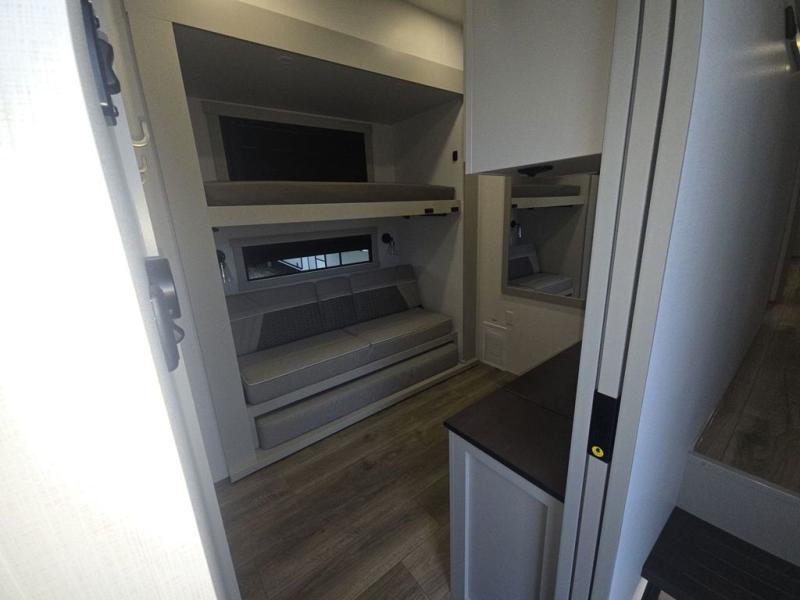 This unit is perfect for your family that needs sleeping space for eight! There is ample seating with a sliding desk/dining table, 62" theater seating, and a 72" tri-fold sofa along the rear wall. You can easily relax and enjoy the telescoping TV with a cozy fireplace below. The kitchen offers all that you need to prepare and cook meals just like home with a 16 cu. ft. refrigerator for your perishables, a 30" residential microwave oven, and three burner range top and oven. You will love the kitchen island all outfitted with pull-out pet bowls and double pull out trash bins with an integrated Stow & Go paper towel holder. There is also an 84" pantry with adjustable shelves for all of your canned and dry goods. Mid-coach, just ahead through the main entry, is a bonus room that can be used as a bedroom featuring a sofa bed with flip-up overhead bunk and trundle below, or an office with pull-out desk so that you can work easily while you travel, or it could also be used as a gaming room since there is also a 50" Smart TV. Head up the steps to a bathroom on your left and a private master suite with king bed slide all the way up front. A sliding dresser top features hidden storage which is perfect for jewelry and other personal belongings. The front wardrobe features mirrored doors and the corner closet has been prepped for a stackable washer and dryer if you choose to add that option.