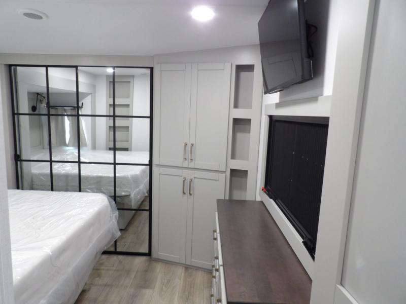 This unit is perfect for your family that needs sleeping space for eight! There is ample seating with a sliding desk/dining table, 62" theater seating, and a 72" tri-fold sofa along the rear wall. You can easily relax and enjoy the telescoping TV with a cozy fireplace below. The kitchen offers all that you need to prepare and cook meals just like home with a 16 cu. ft. refrigerator for your perishables, a 30" residential microwave oven, and three burner range top and oven. You will love the kitchen island all outfitted with pull-out pet bowls and double pull out trash bins with an integrated Stow & Go paper towel holder. There is also an 84" pantry with adjustable shelves for all of your canned and dry goods. Mid-coach, just ahead through the main entry, is a bonus room that can be used as a bedroom featuring a sofa bed with flip-up overhead bunk and trundle below, or an office with pull-out desk so that you can work easily while you travel, or it could also be used as a gaming room since there is also a 50" Smart TV. Head up the steps to a bathroom on your left and a private master suite with king bed slide all the way up front. A sliding dresser top features hidden storage which is perfect for jewelry and other personal belongings. The front wardrobe features mirrored doors and the corner closet has been prepped for a stackable washer and dryer if you choose to add that option.