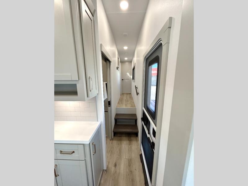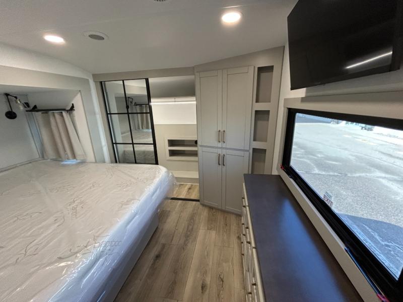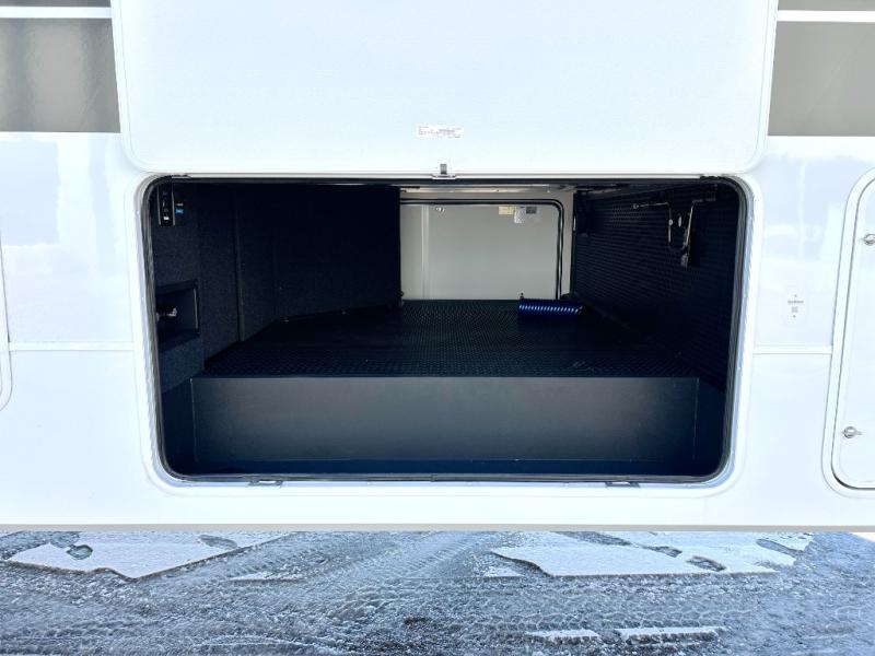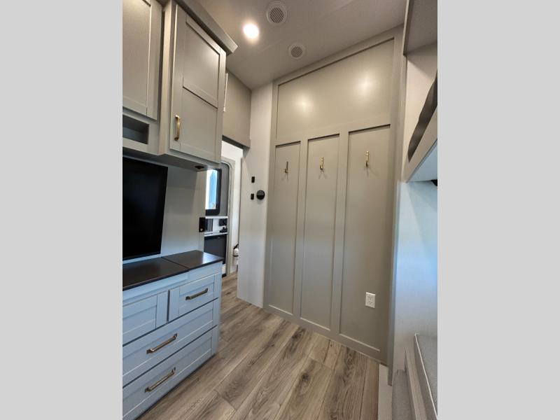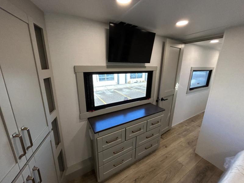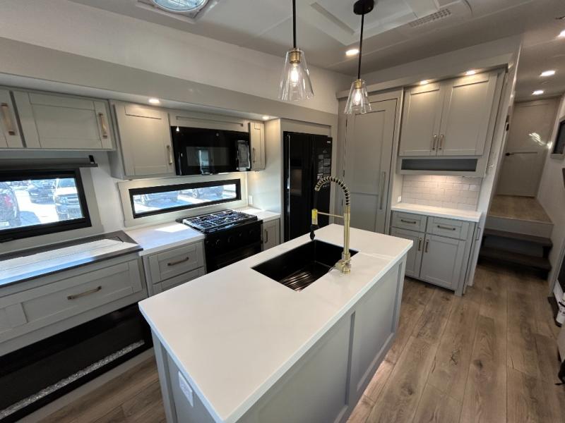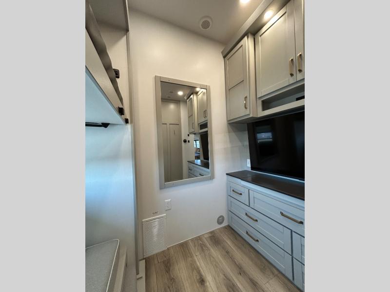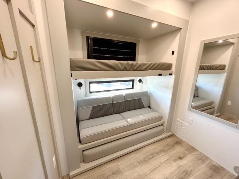 This unit is perfect for your family that needs sleeping space for eight! There is ample seating with a sliding desk/dining table, 62" theater seating, and a 72" tri-fold sofa along the rear wall. You can easily relax and enjoy the telescoping TV with a cozy fireplace below. The kitchen offers all that you need to prepare and cook meals just like home with a 16 cu. ft. refrigerator for your perishables, a 30" residential microwave oven, and three burner range top and oven. You will love the kitchen island all outfitted with pull-out pet bowls and double pull out trash bins with an integrated Stow & Go paper towel holder. There is also an 84" pantry with adjustable shelves for all of your canned and dry goods. Mid-coach, just ahead through the main entry, is a bonus room that can be used as a bedroom featuring a sofa bed with flip-up overhead bunk and trundle below, or an office with pull-out desk so that you can work easily while you travel, or it could also be used as a gaming room since there is also a 50" Smart TV. Head up the steps to a bathroom on your left and a private master suite with king bed slide all the way up front. A sliding dresser top features hidden storage which is perfect for jewelry and other personal belongings. The front wardrobe features mirrored doors and the corner closet has been prepped for a stackable washer and dryer if you choose to add that option.