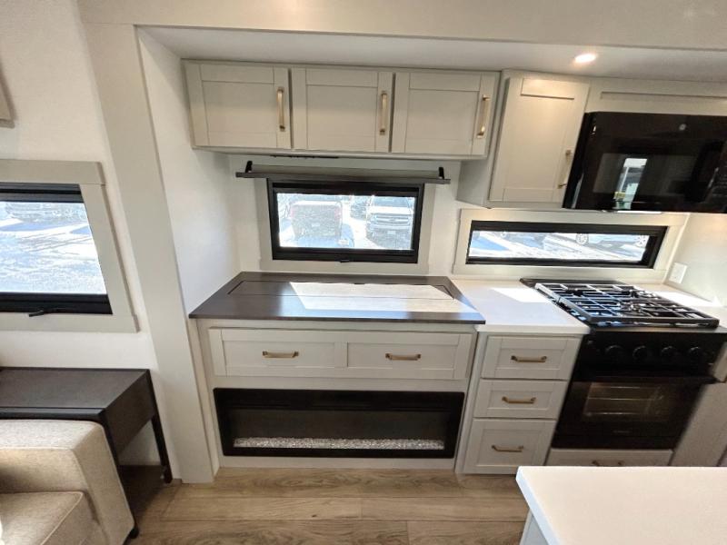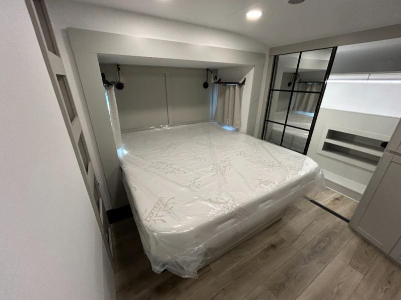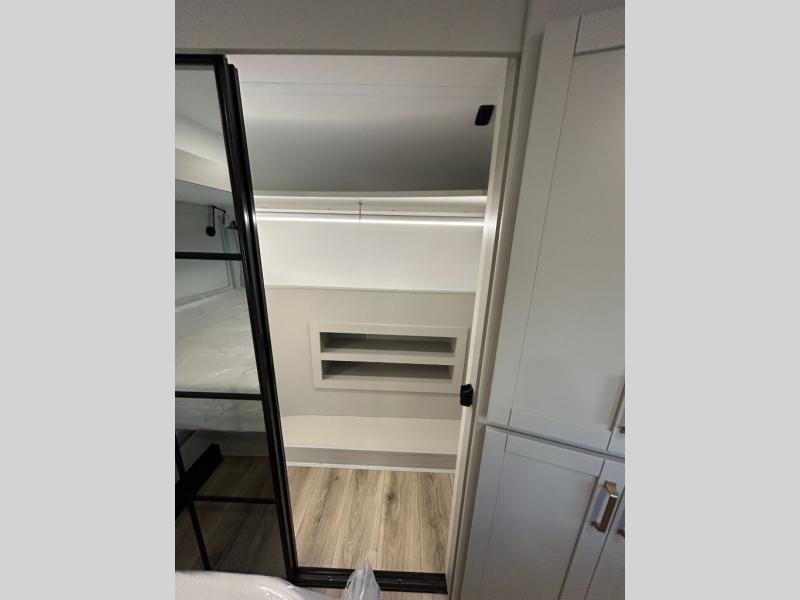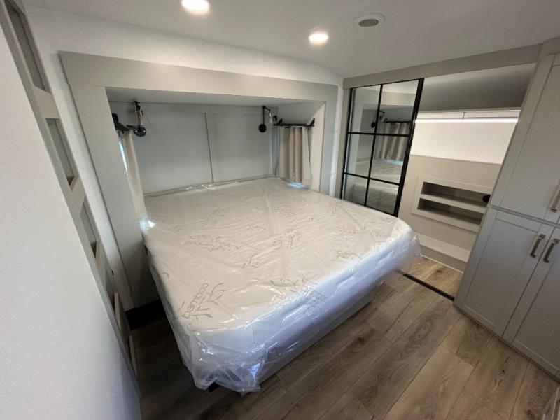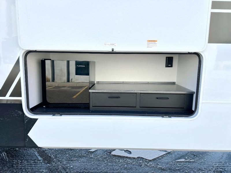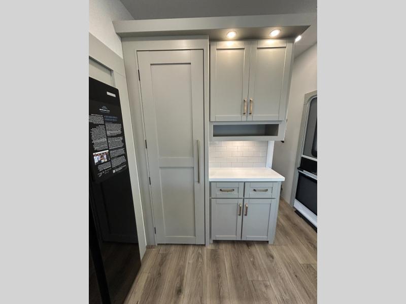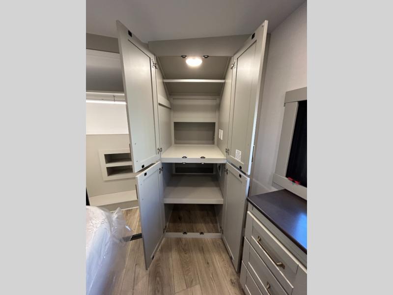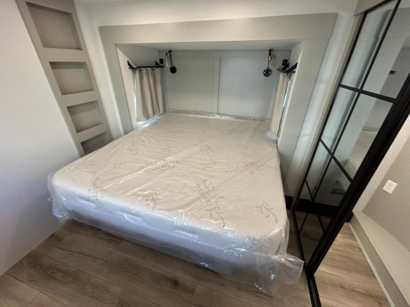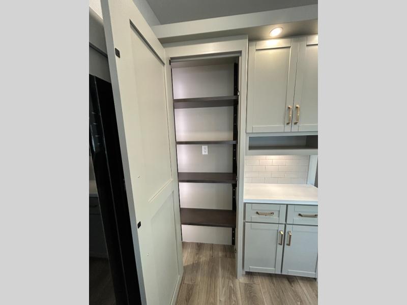 This unit is perfect for your family that needs sleeping space for eight! There is ample seating with a sliding desk/dining table, 62" theater seating, and a 72" tri-fold sofa along the rear wall. You can easily relax and enjoy the telescoping TV with a cozy fireplace below. The kitchen offers all that you need to prepare and cook meals just like home with a 16 cu. ft. refrigerator for your perishables, a 30" residential microwave oven, and three burner range top and oven. You will love the kitchen island all outfitted with pull-out pet bowls and double pull out trash bins with an integrated Stow & Go paper towel holder. There is also an 84" pantry with adjustable shelves for all of your canned and dry goods. Mid-coach, just ahead through the main entry, is a bonus room that can be used as a bedroom featuring a sofa bed with flip-up overhead bunk and trundle below, or an office with pull-out desk so that you can work easily while you travel, or it could also be used as a gaming room since there is also a 50" Smart TV. Head up the steps to a bathroom on your left and a private master suite with king bed slide all the way up front. A sliding dresser top features hidden storage which is perfect for jewelry and other personal belongings. The front wardrobe features mirrored doors and the corner closet has been prepped for a stackable washer and dryer if you choose to add that option.