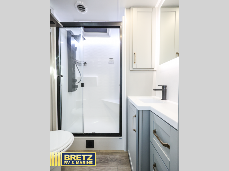 You are going to love every adventure in this cozy coach! In front, a private bedroom awaits you each night providing a comfortable place to get a good night sleep with built-in bedside and under bed storage including outlets and USB ports for your electronics. There are four drawers under the bed, two on each side for more clothing storage. There is also a fireplace in this room as well. A full bath next to the bedroom includes a 30" x 42" one-piece fiberglass shower so you can stay clean and refreshed throughout your trip. The combined kitchen and living area at the rear of the unit will be a favorite place to visit together since there is theater seating and a dinette with bench seat and two chairs. In the slide opposite, you will find a television and fireplace, that makes two fireplaces! You will also enjoy the kitchen island with bar stools, along with additional kitchen counter space, a pantry with adjustable shelves, and a spacious 16 cu. ft. refrigerator that can still open when the slide out is in. Head outside to find a drop-frame pass-thru storage and rear storage, two patio awnings, LED chassis lighting, quad step entry, and more!