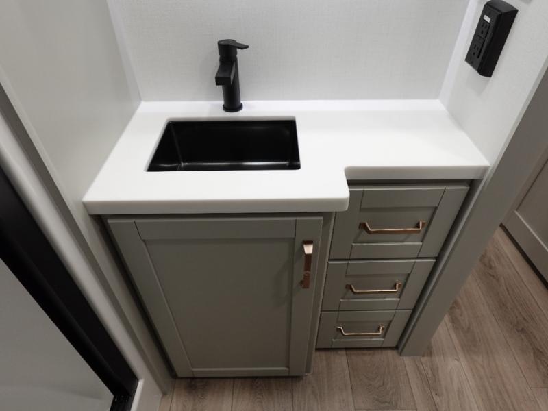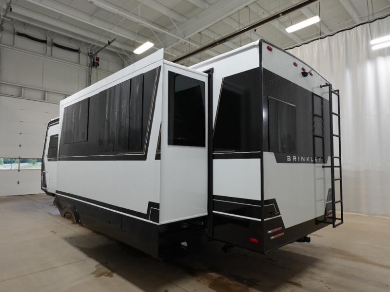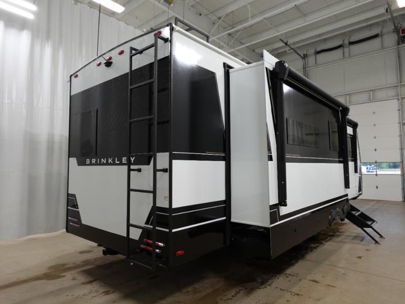 With any Model Z Air travel trailer by Brinkley, you will enjoy premium features at every turn. The industry-first low maintenance roof is sure to be appreciated, plus there are industry-first brass plumbing connections for excellent resistance to corrosion. The drop-frame chassis with over 45 cu. ft. of exterior storage will allow you to bring along camp gear galore, plus there are motion lighting and power outlets for added convenience! You'll also find two hot/cold showers outdoors, along with a 370-watt solar panel, a custom LP box with locked battery storage, and a premium utility center with a retractable 65' water hose to wash off mud from the lake. The interior is just as accommodating with its solid surface countertops, Brinkley CraftSense wood trim construction, integrated window screens and insulated blackout blinds, and the list of luxury features goes on!