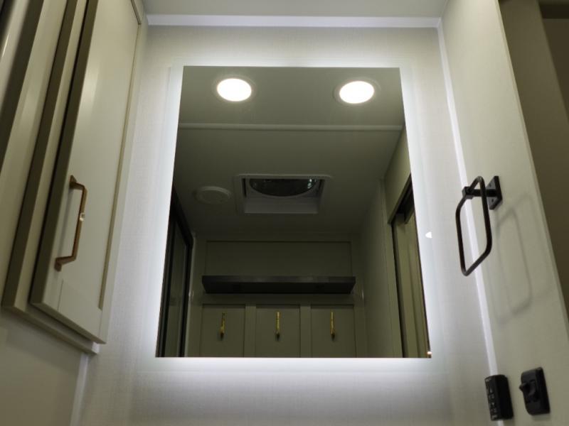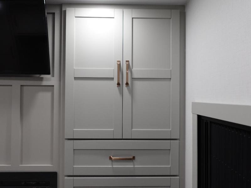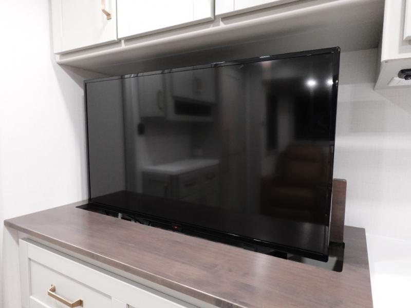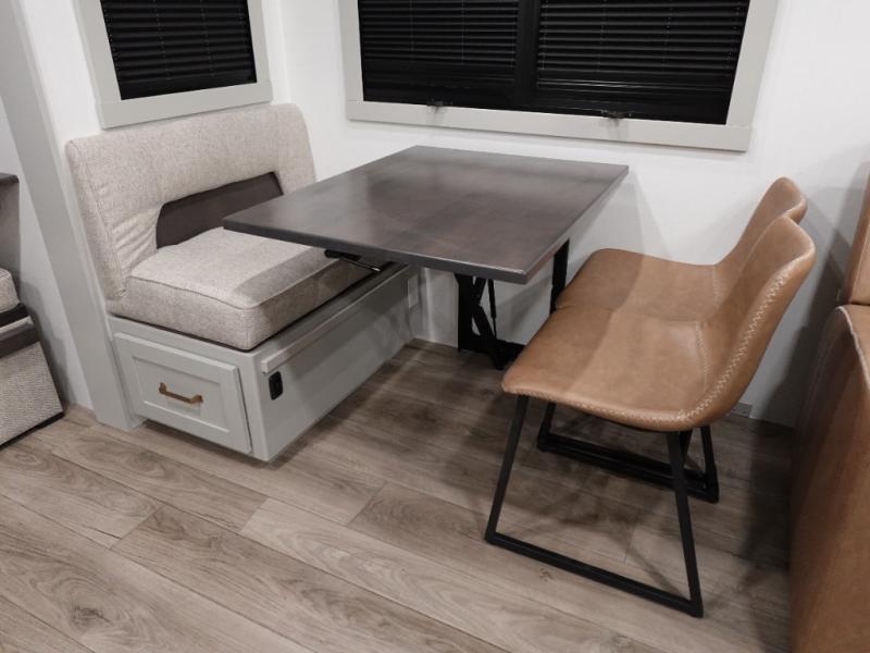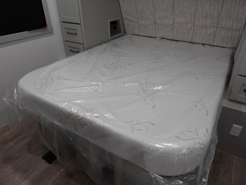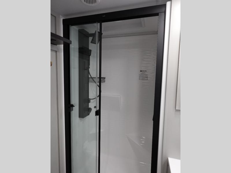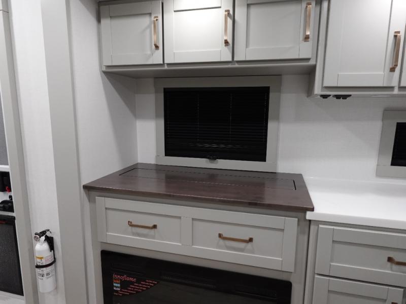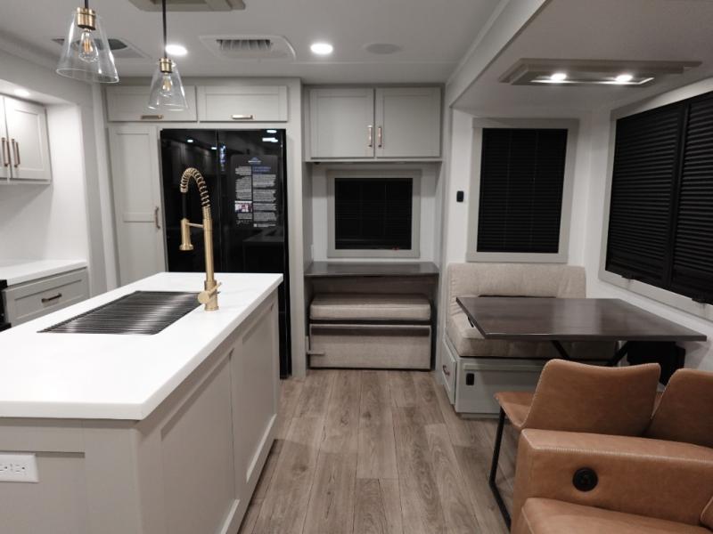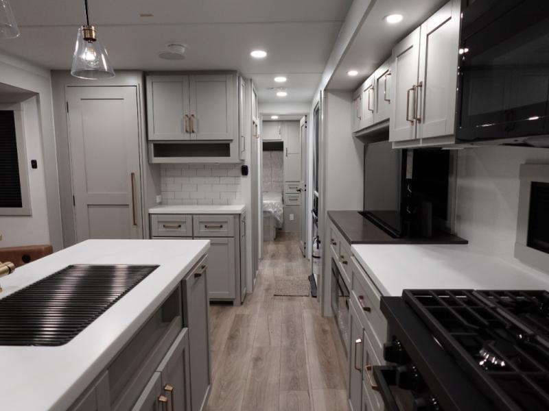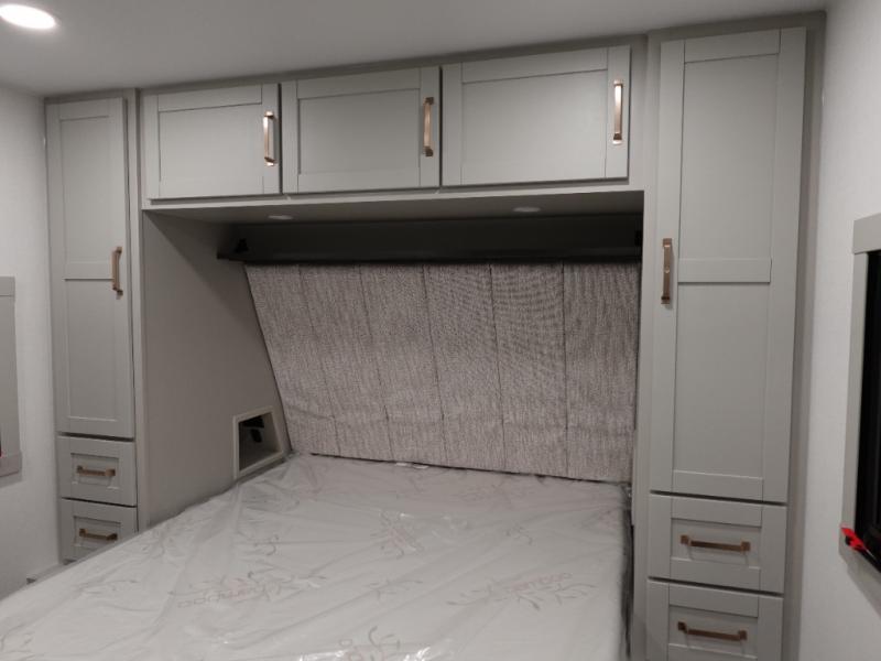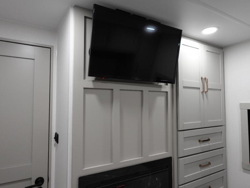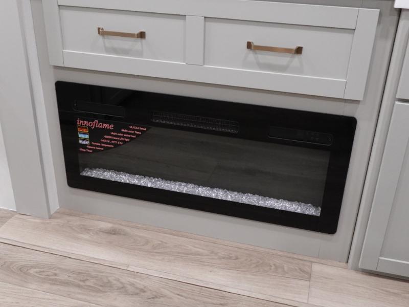 You are going to love every adventure in this cozy coach! In front, a private bedroom awaits you each night providing a comfortable place to get a good night sleep with built-in bedside and under bed storage including outlets and USB ports for your electronics. There are four drawers under the bed, two on each side for more clothing storage. There is also a fireplace in this room as well. A full bath next to the bedroom includes a 30" x 42" one-piece fiberglass shower so you can stay clean and refreshed throughout your trip. The combined kitchen and living area at the rear of the unit will be a favorite place to visit together since there is theater seating and a dinette with bench seat and two chairs. In the slide opposite, you will find a television and fireplace, that makes two fireplaces! You will also enjoy the kitchen island with bar stools, along with additional kitchen counter space, a pantry with adjustable shelves, and a spacious 16 cu. ft. refrigerator that can still open when the slide out is in. Head outside to find a drop-frame pass-thru storage and rear storage, two patio awnings, LED chassis lighting, quad step entry, and more!