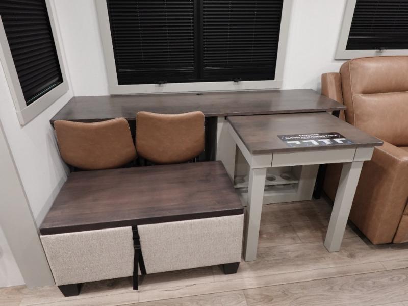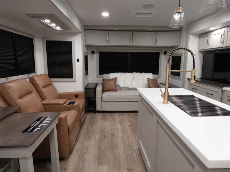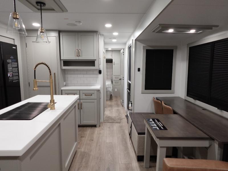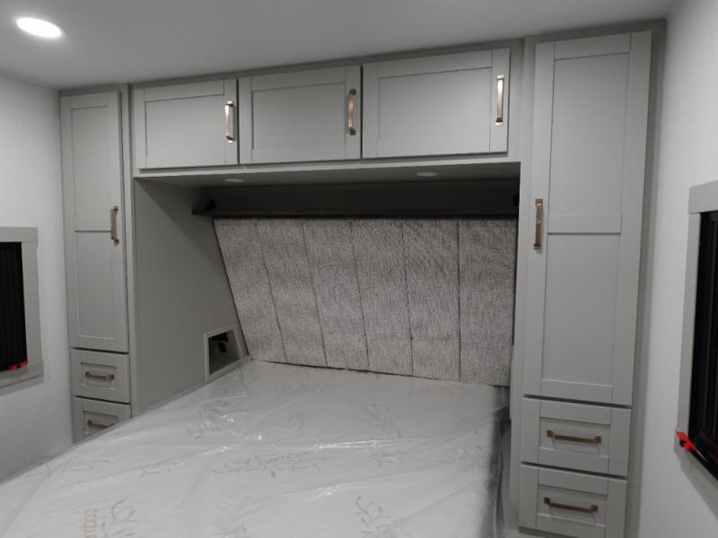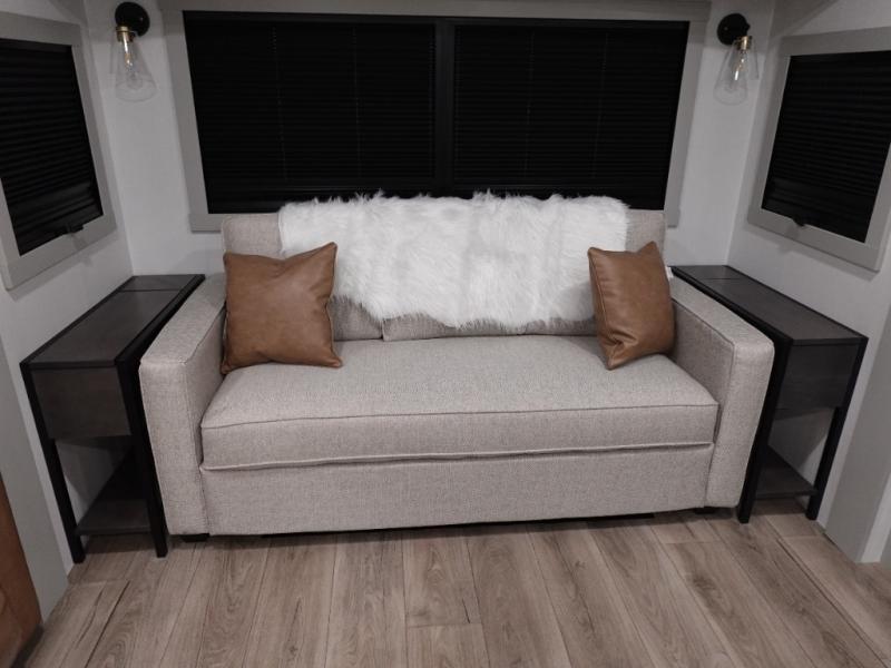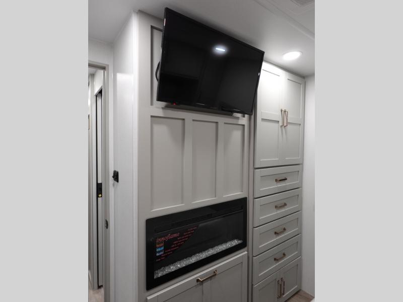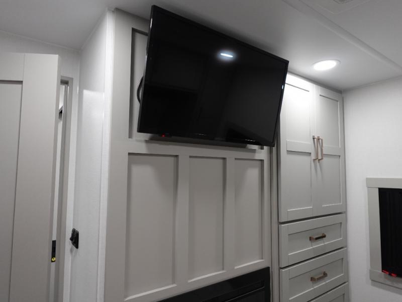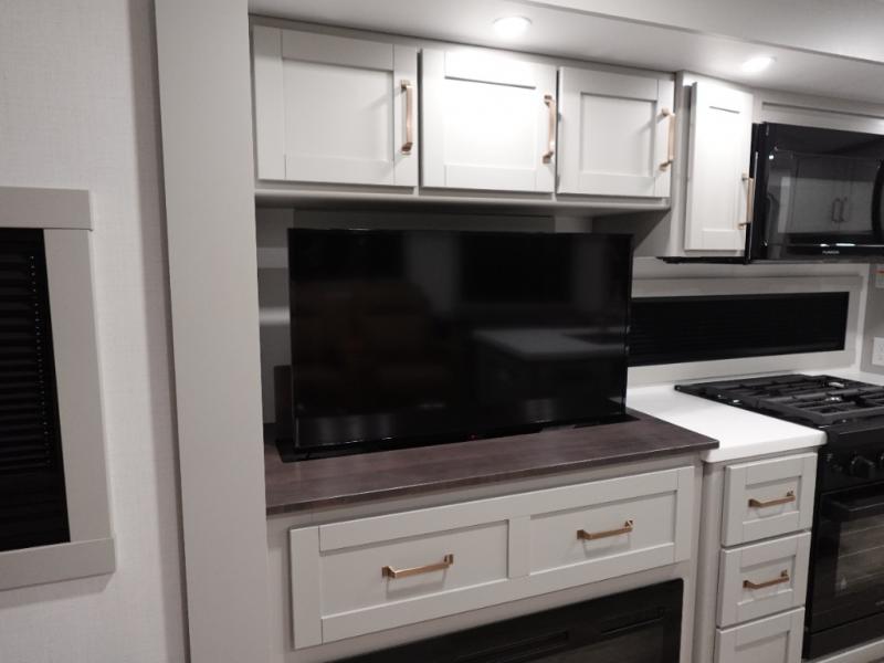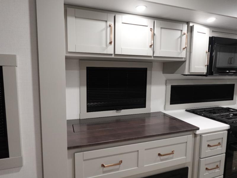 This travel trailer is spacious thanks to the dual opposing slides in the combined kitchen and living area. There is a rear 72" tri-fold sofa here, theater seating, and a sliding desk/dining table. The televator and fireplace will let you relax each evening with a movie or good book, and the full kitchen lets you make meals wherever you go. The chef of your group will also appreciate the pantry with adjustable shelving for all their ingredients, a hutch, 30" residential microwave, and even a pull-out trash bin for easy clean-up. When you're ready to call it a night, the front private bedroom will be waiting for you. This room includes a queen bed with four underbed drawers, a closet with pass-thru access to the bathroom closet, plus washer and dryer prep if you want the option to go full-time!