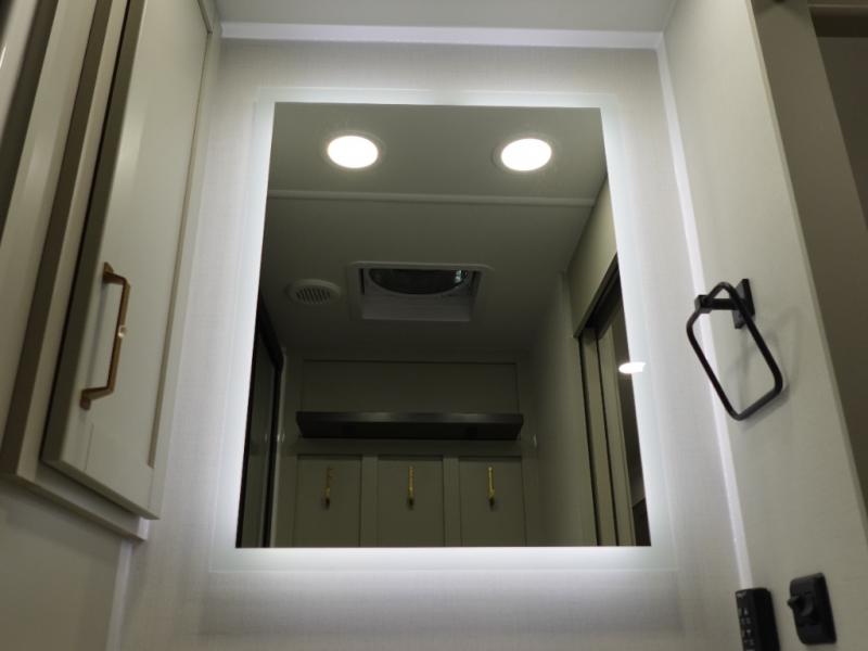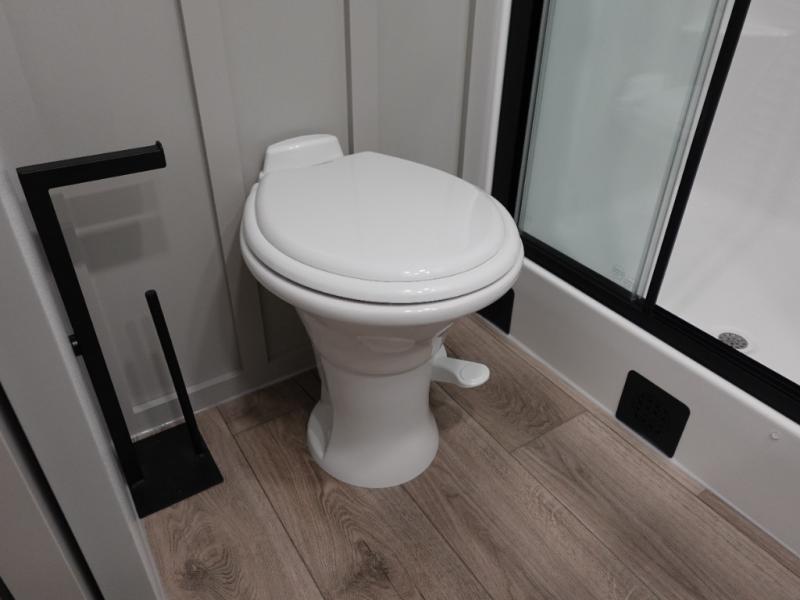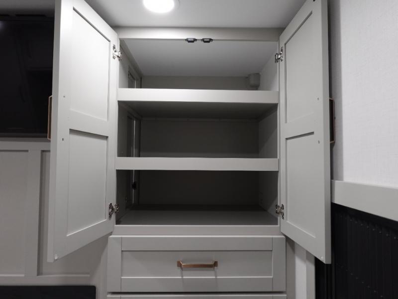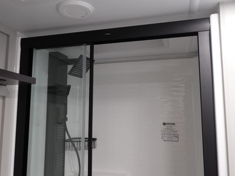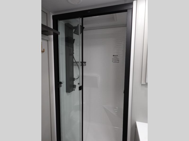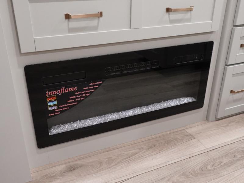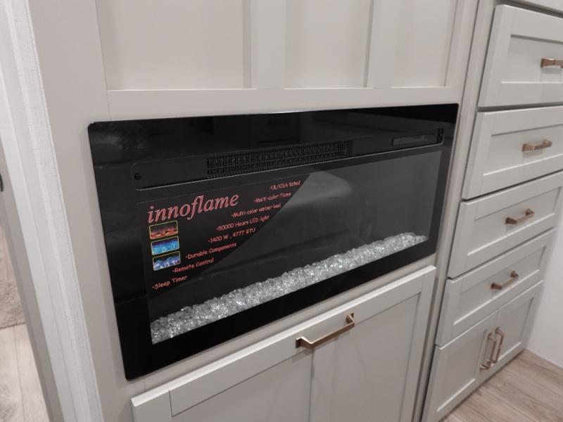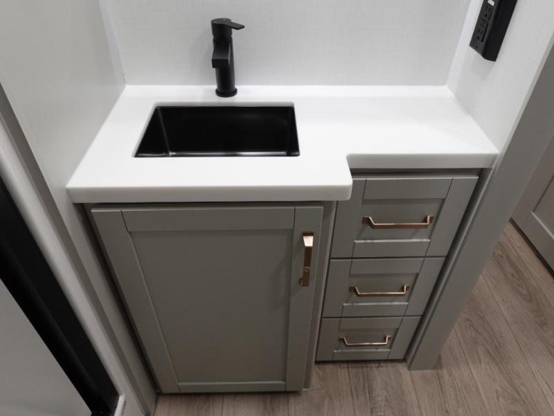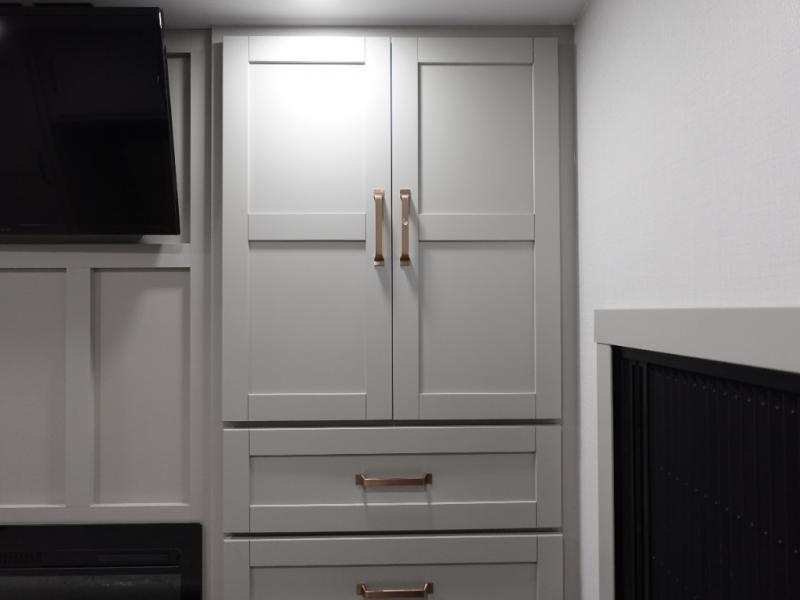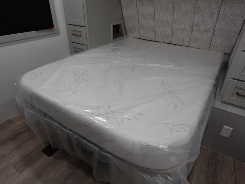 This travel trailer is spacious thanks to the dual opposing slides in the combined kitchen and living area. There is a rear 72" tri-fold sofa here, theater seating, and a sliding desk/dining table. The televator and fireplace will let you relax each evening with a movie or good book, and the full kitchen lets you make meals wherever you go. The chef of your group will also appreciate the pantry with adjustable shelving for all their ingredients, a hutch, 30" residential microwave, and even a pull-out trash bin for easy clean-up. When you're ready to call it a night, the front private bedroom will be waiting for you. This room includes a queen bed with four underbed drawers, a closet with pass-thru access to the bathroom closet, plus washer and dryer prep if you want the option to go full-time!
