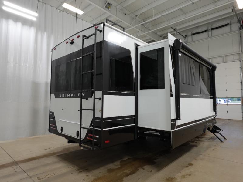 With any Model Z Air travel trailer by Brinkley, you will enjoy premium features at every turn. The industry-first low maintenance roof is sure to be appreciated, plus there are industry-first brass plumbing connections for excellent resistance to corrosion. The drop-frame chassis with ample exterior storage will allow you to bring along camp gear galore, plus there are motion lighting and power outlets for added convenience! You'll also find two hot/cold showers outdoors, along with a 370-watt solar panel, a custom LP box with locked battery storage, and a premium utility center with a retractable 65' water hose to wash off mud from the lake. The interior is just as accommodating with its solid surface countertops, Brinkley CraftSense wood trim construction, integrated window screens and insulated blackout blinds, and the list of luxury features goes on!