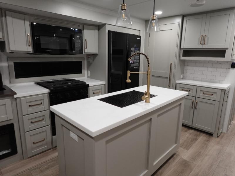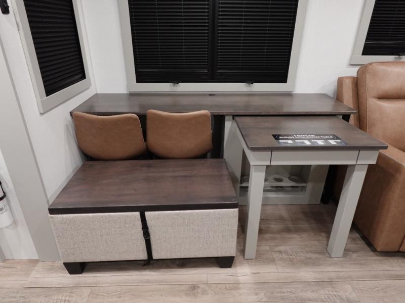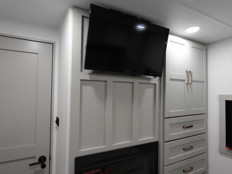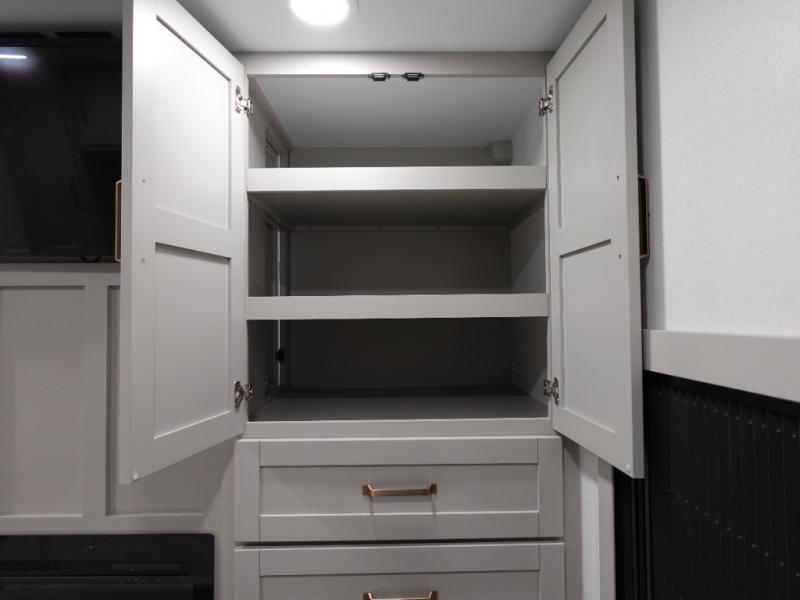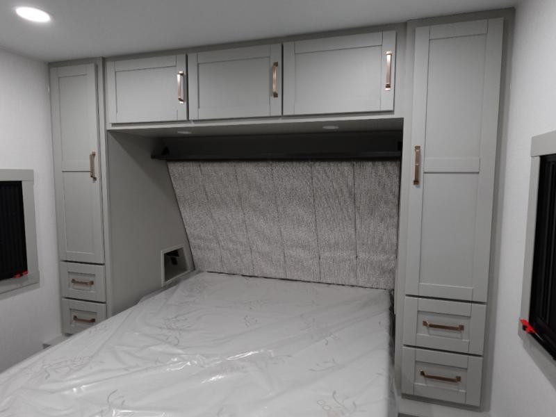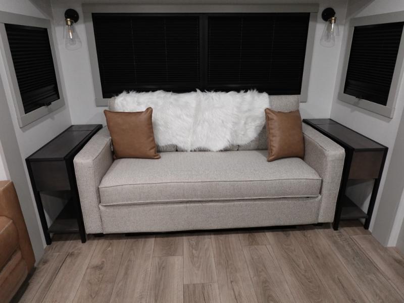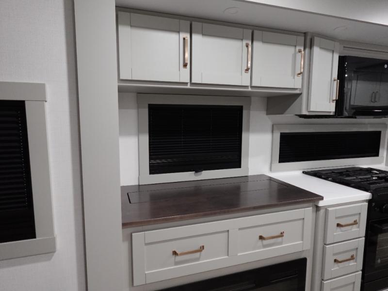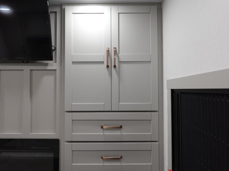 This travel trailer is spacious thanks to the dual opposing slides in the combined kitchen and living area. There is a rear 72" tri-fold sofa here, theater seating, and a sliding desk/dining table. The televator and fireplace will let you relax each evening with a movie or good book, and the full kitchen lets you make meals wherever you go. The chef of your group will also appreciate the pantry with adjustable shelving for all their ingredients, a hutch, 30" residential microwave, and even a pull-out trash bin for easy clean-up. When you're ready to call it a night, the front private bedroom will be waiting for you. This room includes a queen bed with four underbed drawers, a closet with pass-thru access to the bathroom closet, plus washer and dryer prep if you want the option to go full-time!