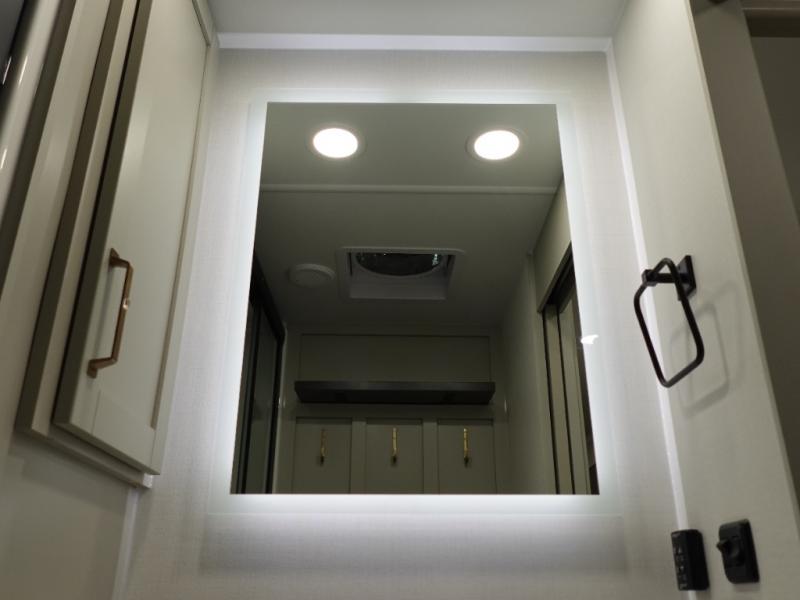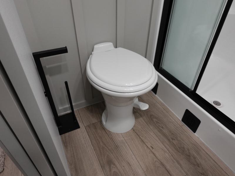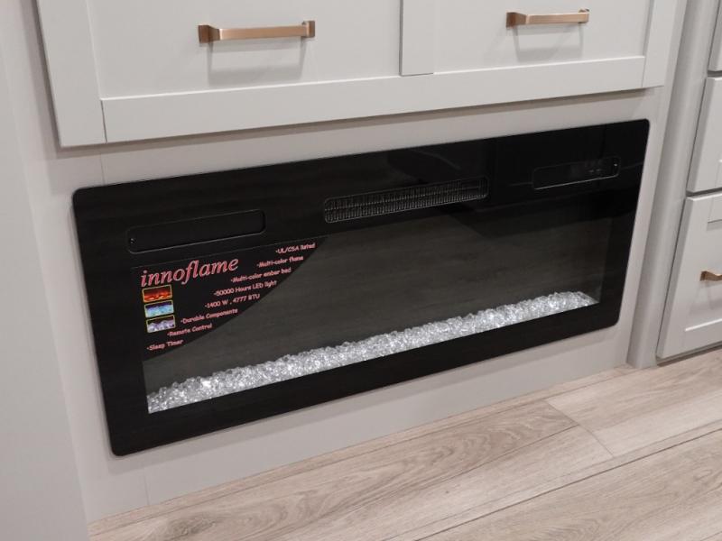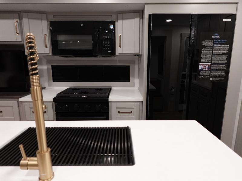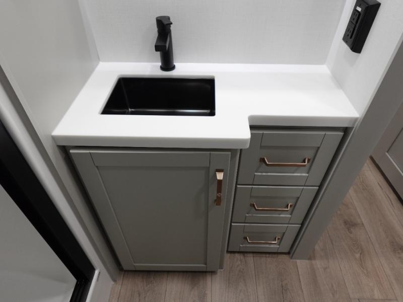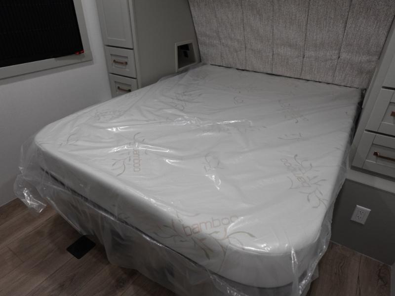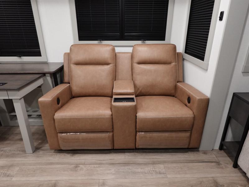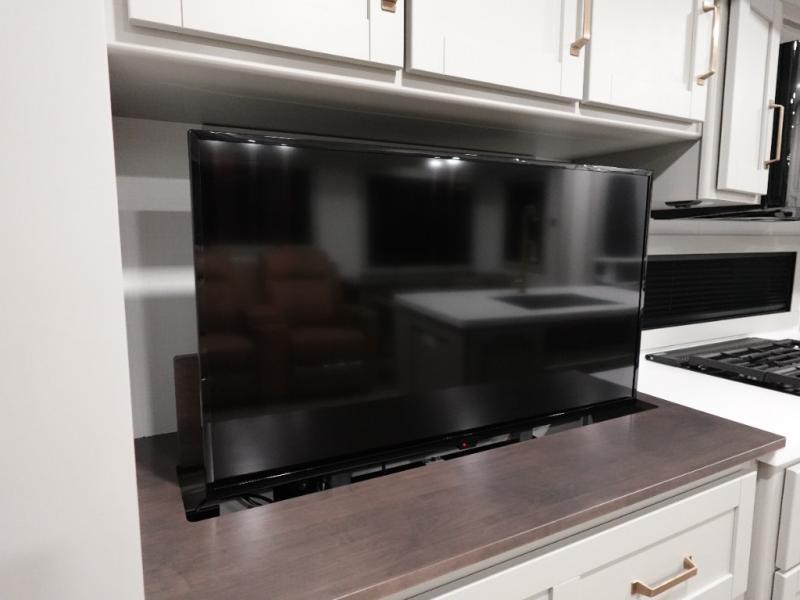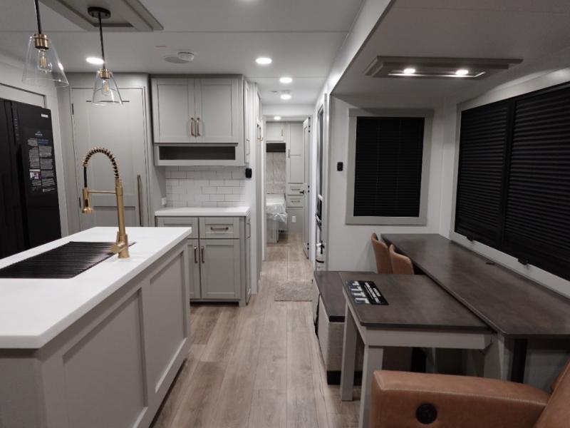 This travel trailer is spacious thanks to the dual opposing slides in the combined kitchen and living area. There is a rear 72" tri-fold sofa here, theater seating, and a sliding desk/dining table. The televator and fireplace will let you relax each evening with a movie or good book, and the full kitchen lets you make meals wherever you go. The chef of your group will also appreciate the pantry with adjustable shelving for all their ingredients, a hutch, 30" residential microwave, and even a pull-out trash bin for easy clean-up. When you're ready to call it a night, the front private bedroom will be waiting for you. This room includes a queen bed with four underbed drawers, a closet with pass-thru access to the bathroom closet, plus washer and dryer prep if you want the option to go full-time!