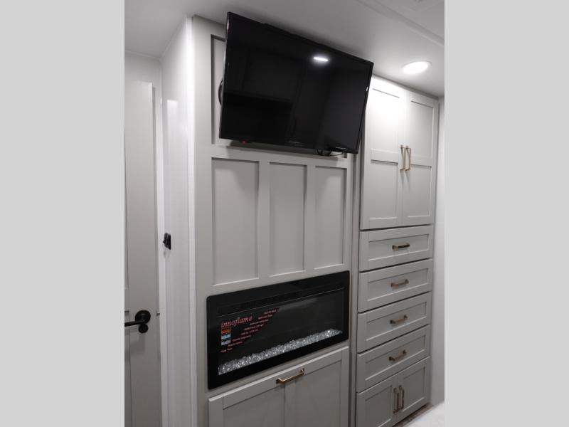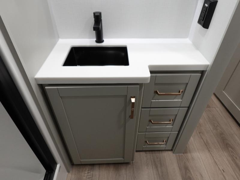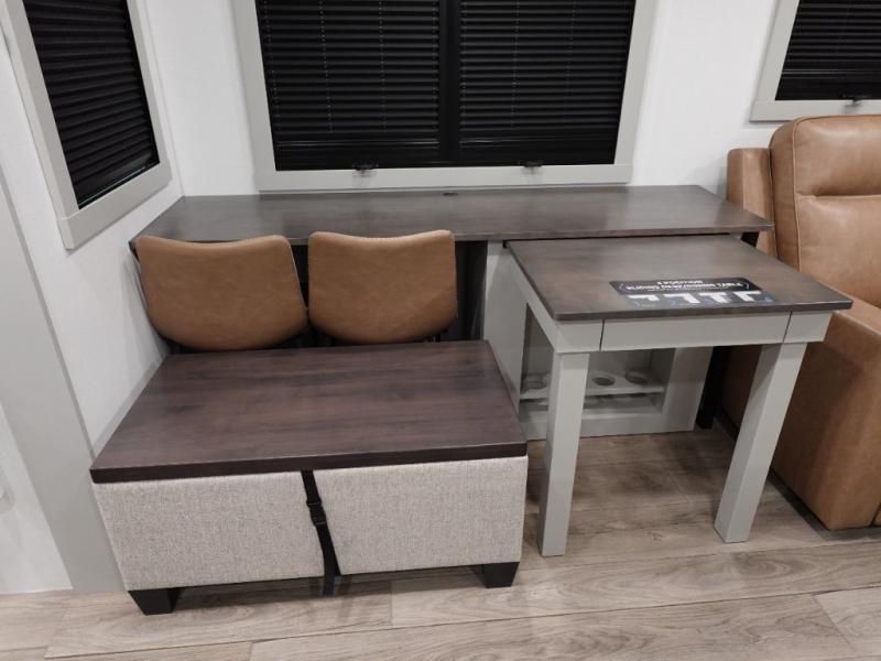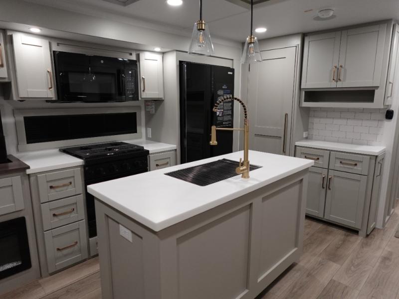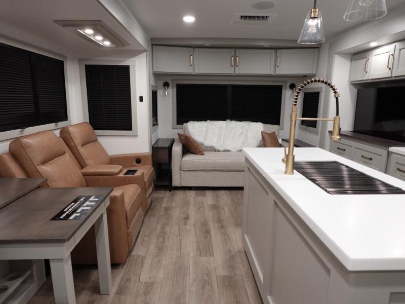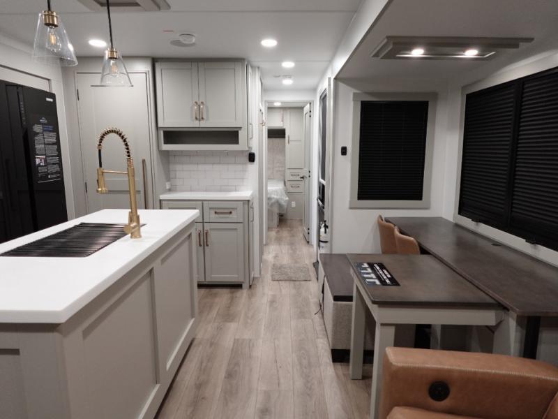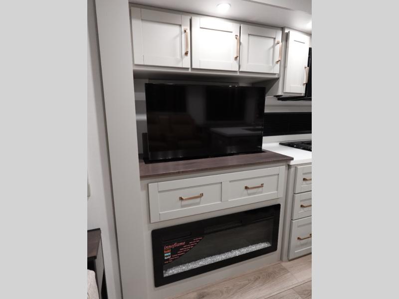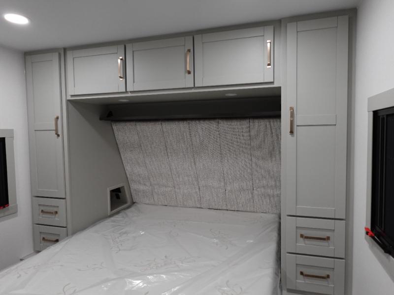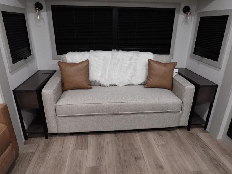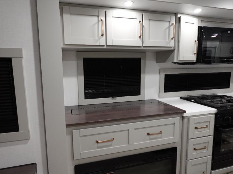 This travel trailer is spacious thanks to the dual opposing slides in the combined kitchen and living area. There is a rear 72" tri-fold sofa here, theater seating, and a sliding desk/dining table. The televator and fireplace will let you relax each evening with a movie or good book, and the full kitchen lets you make meals wherever you go. The chef of your group will also appreciate the pantry with adjustable shelving for all their ingredients, a hutch, 30" residential microwave, and even a pull-out trash bin for easy clean-up. When you're ready to call it a night, the front private bedroom will be waiting for you. This room includes a queen bed with four underbed drawers, a closet with pass-thru access to the bathroom closet, plus washer and dryer prep if you want the option to go full-time!
