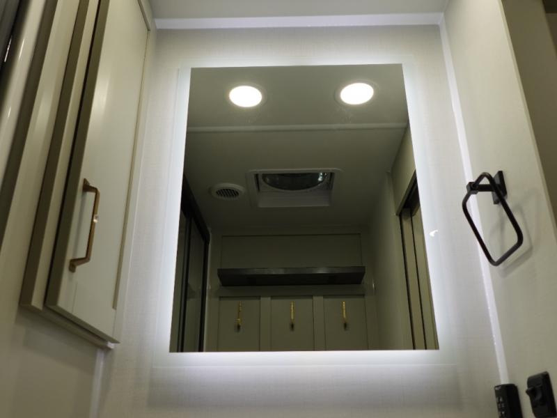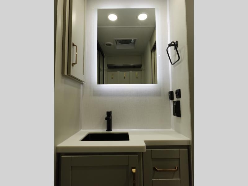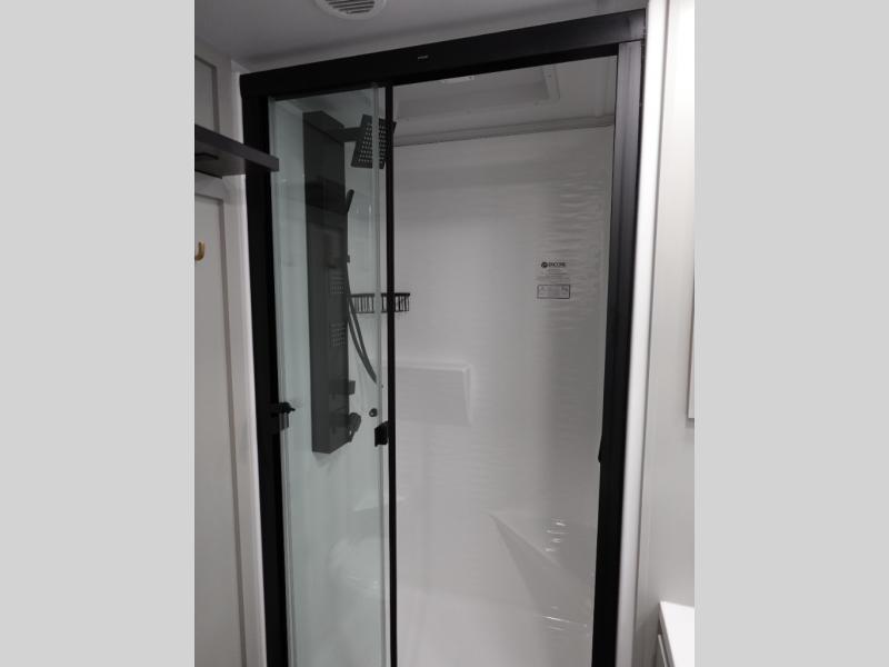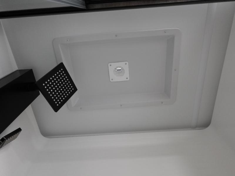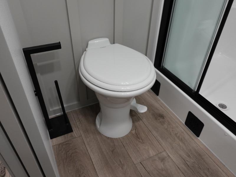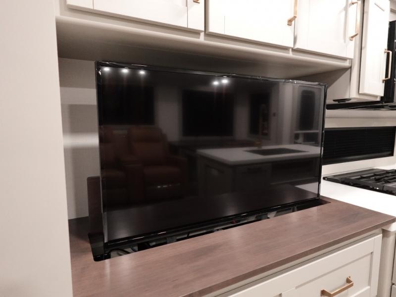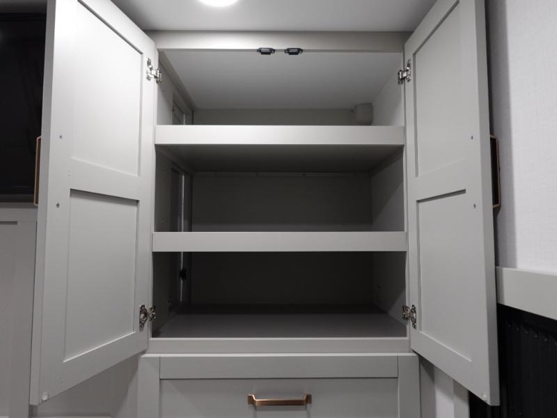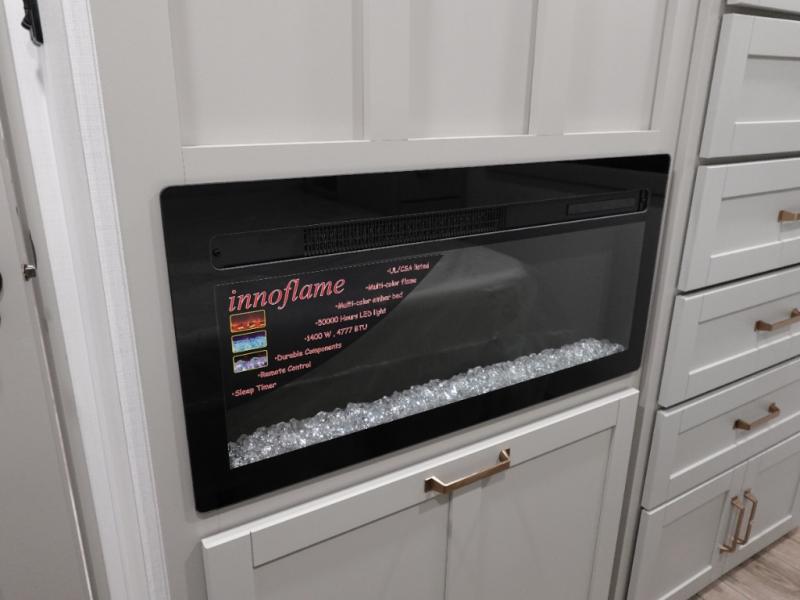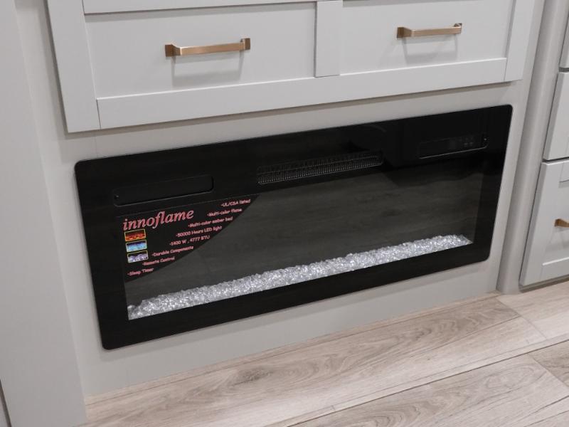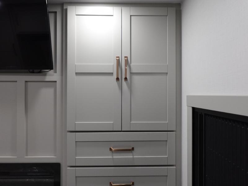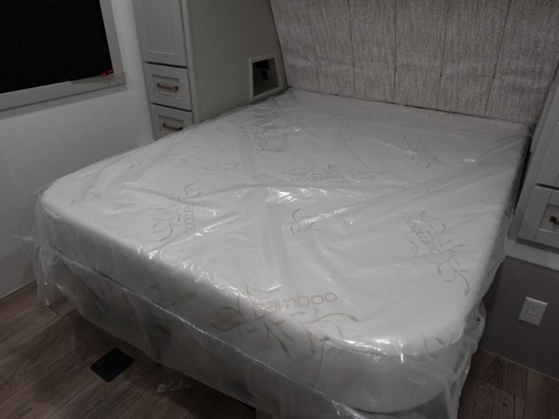 This travel trailer is spacious thanks to the dual opposing slides in the combined kitchen and living area. There is a rear 72" tri-fold sofa here, theater seating, and a sliding desk/dining table. The televator and fireplace will let you relax each evening with a movie or good book, and the full kitchen lets you make meals wherever you go. The chef of your group will also appreciate the pantry with adjustable shelving for all their ingredients, a hutch, 30" residential microwave, and even a pull-out trash bin for easy clean-up. When you're ready to call it a night, the front private bedroom will be waiting for you. This room includes a queen bed with four underbed drawers, a closet with pass-thru access to the bathroom closet, plus washer and dryer prep if you want the option to go full-time!
