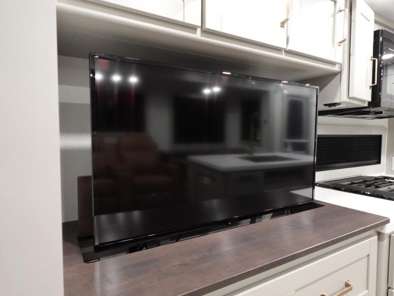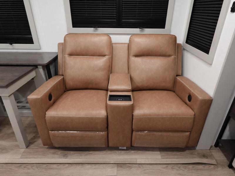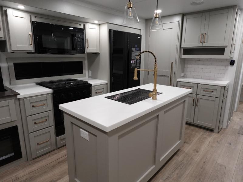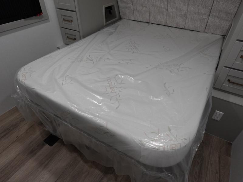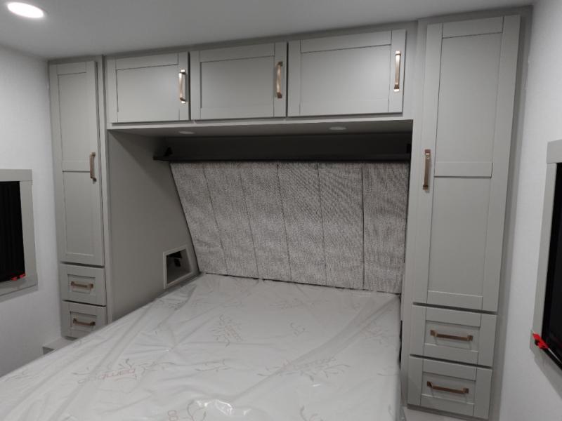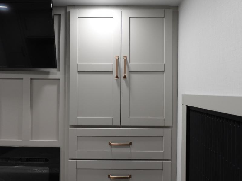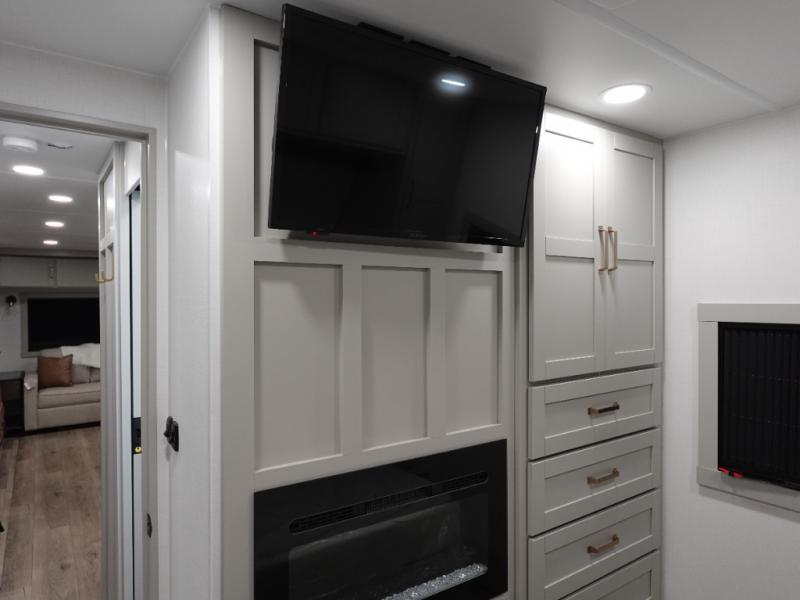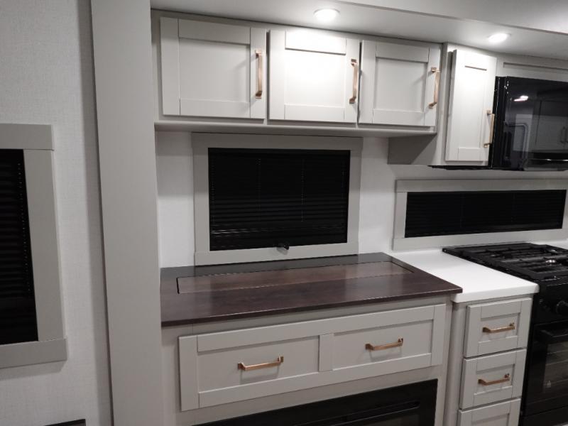This travel trailer is spacious thanks to the dual opposing slides in the combined kitchen and living area. There is a rear 72" tri-fold sofa here, theater seating, and a sliding desk/dining table. The televator and fireplace will let you relax each evening with a movie or good book, and the full kitchen lets you make meals wherever you go. The chef of your group will also appreciate the pantry with adjustable shelving for all their ingredients, a hutch, 30" residential microwave, and even a pull-out trash bin for easy clean-up. When you're ready to call it a night, the front private bedroom will be waiting for you. This room includes a queen bed with four underbed drawers, a closet with pass-thru access to the bathroom closet.