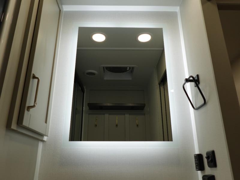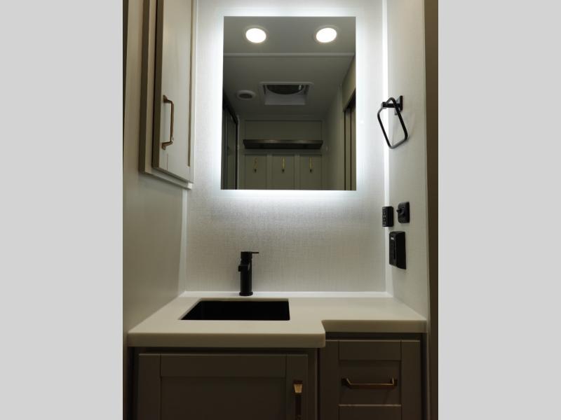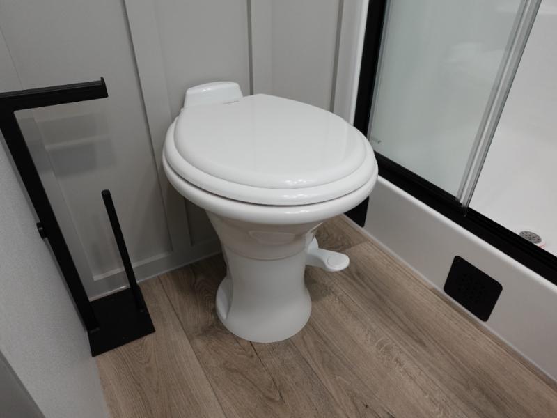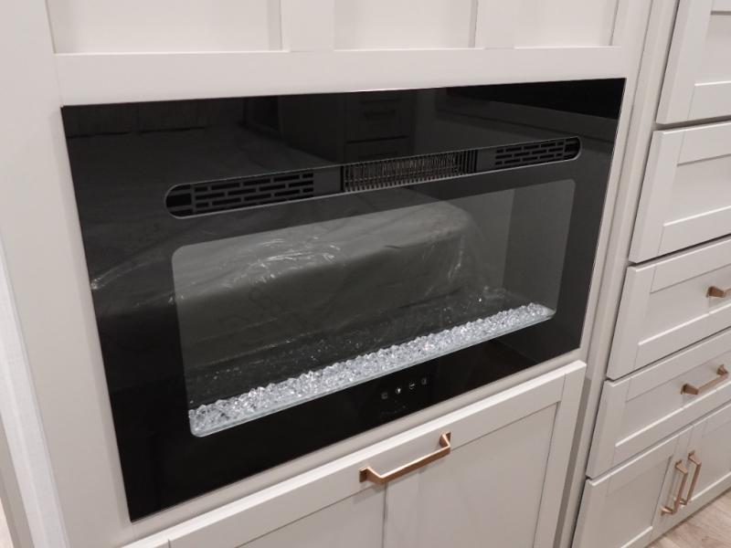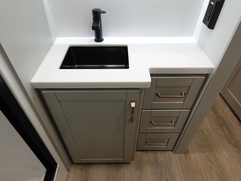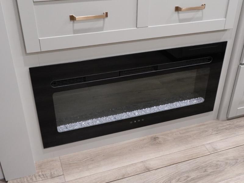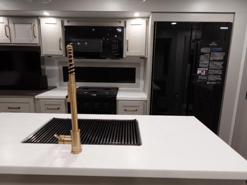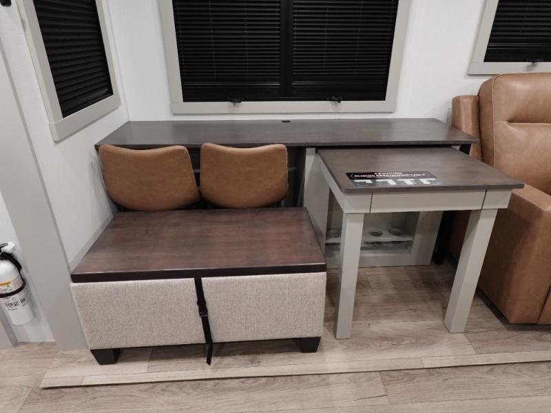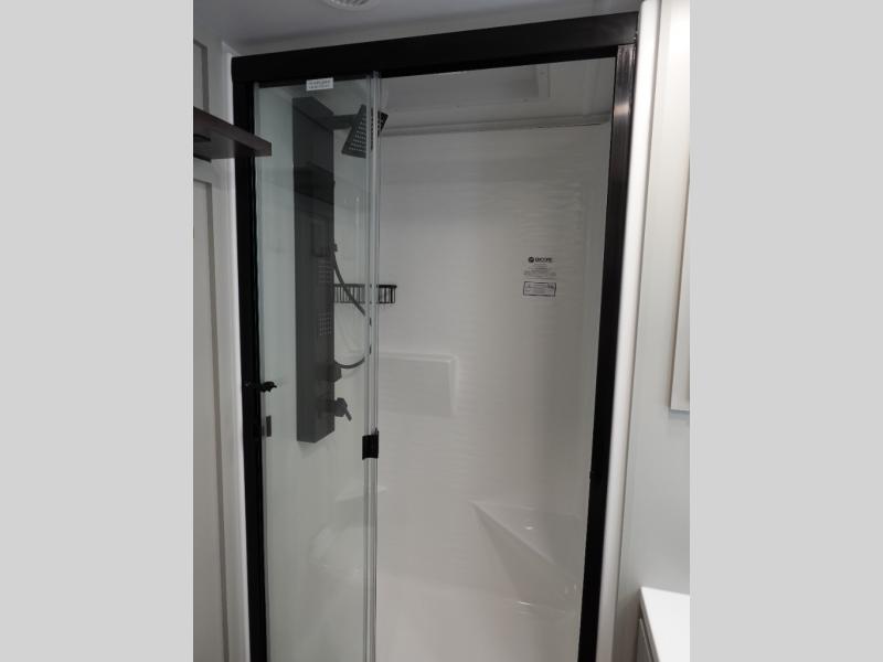This travel trailer is spacious thanks to the dual opposing slides in the combined kitchen and living area. There is a rear 72" tri-fold sofa here, theater seating, and a sliding desk/dining table. The televator and fireplace will let you relax each evening with a movie or good book, and the full kitchen lets you make meals wherever you go. The chef of your group will also appreciate the pantry with adjustable shelving for all their ingredients, a hutch, 30" residential microwave, and even a pull-out trash bin for easy clean-up. When you're ready to call it a night, the front private bedroom will be waiting for you. This room includes a queen bed with four underbed drawers, a closet with pass-thru access to the bathroom closet.