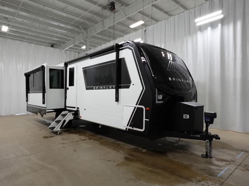 With any Model Z Air travel trailer by Brinkley, you will enjoy premium features at every turn. The industry-first low maintenance roof is sure to be appreciated, plus there are industry-first brass plumbing connections for excellent resistance to corrosion. The drop-frame chassis with ample exterior storage will allow you to bring along camp gear galore, plus there are motion lighting and power outlets for added convenience! You'll also find two hot/cold showers outdoors, along with a 370-watt solar panel, a custom LP box with locked battery storage, and a premium utility center with a retractable 65' water hose to wash off mud from the lake. The interior is just as accommodating with its solid surface countertops, Brinkley CraftSense wood trim construction, integrated window screens and insulated blackout blinds, and the list of luxury features goes on!
