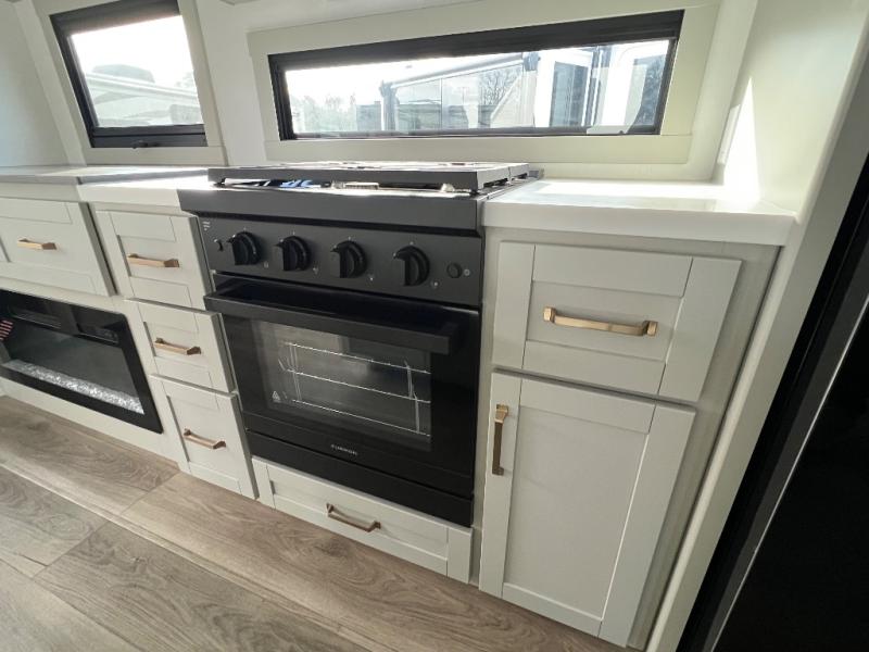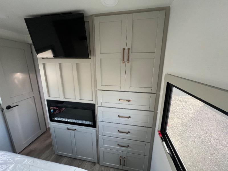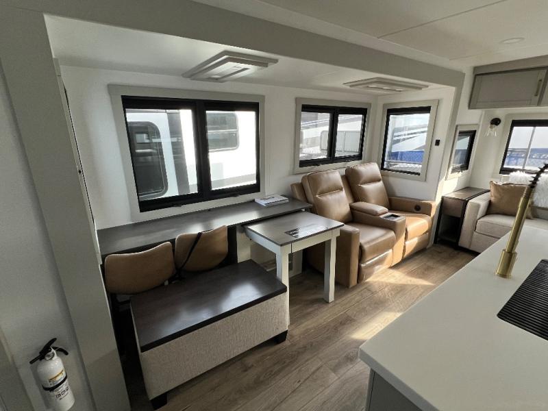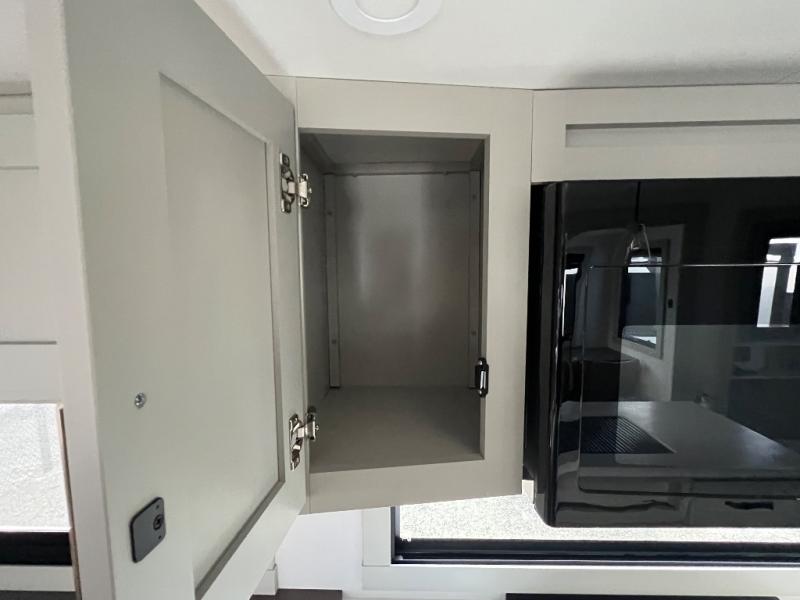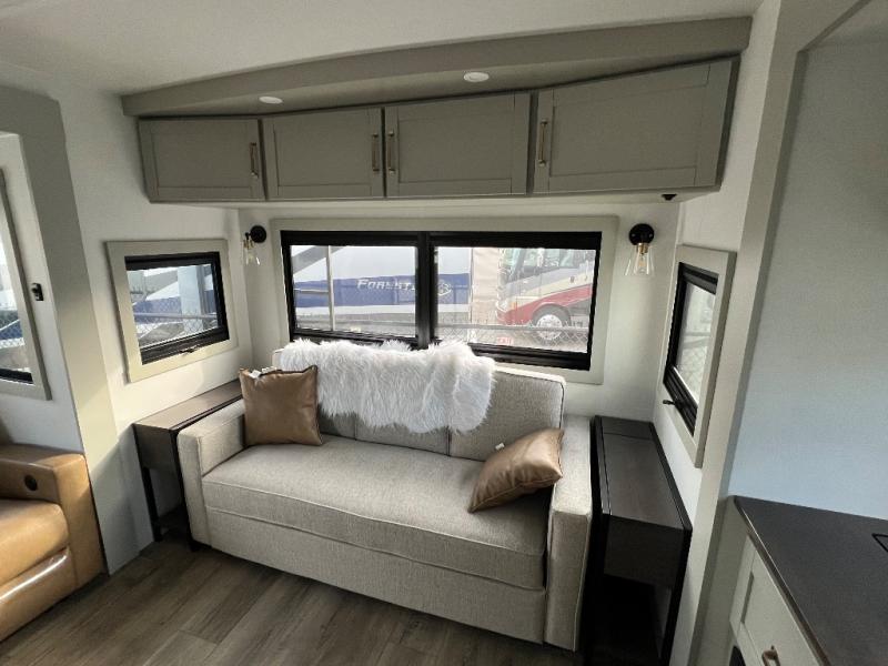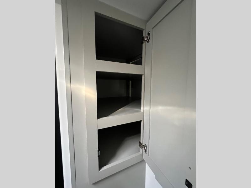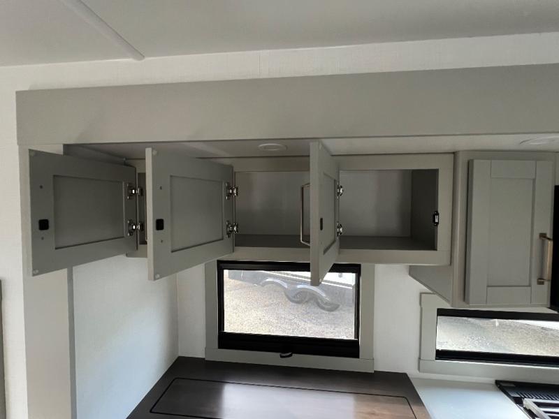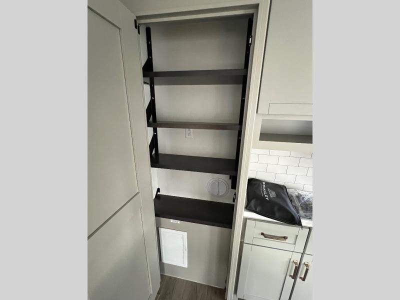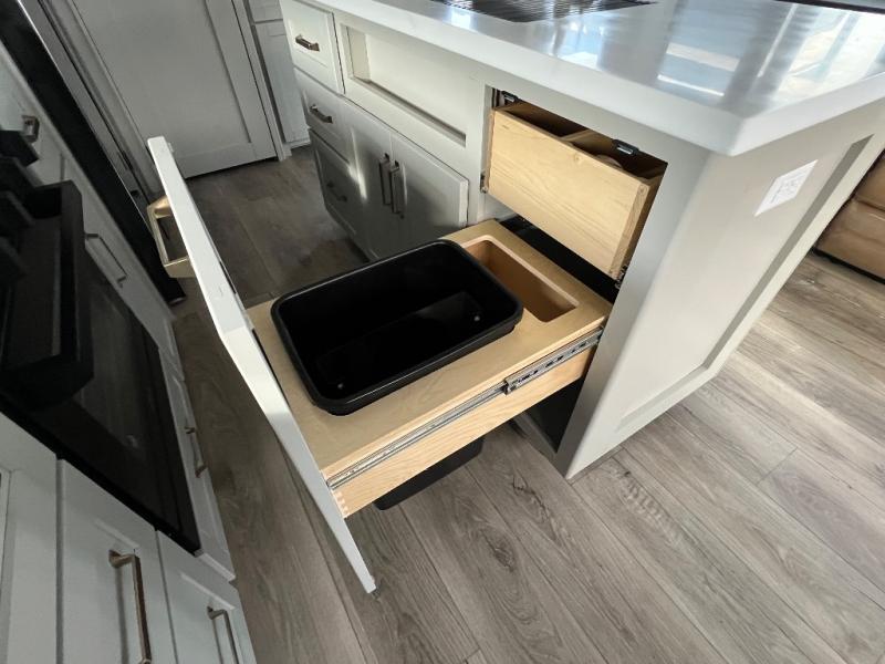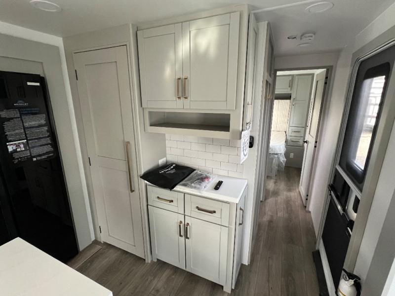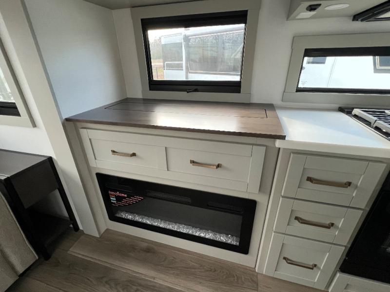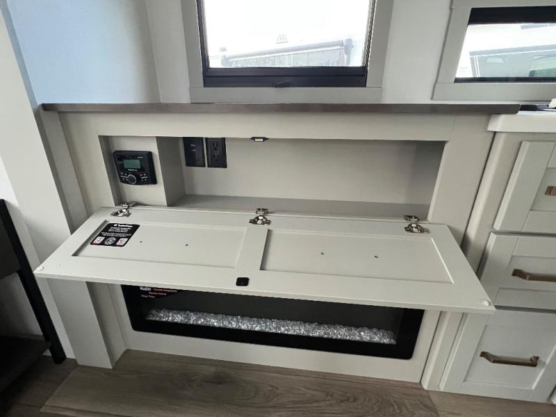 This travel trailer is spacious thanks to the dual opposing slides in the combined kitchen and living area. There is a rear 72" tri-fold sofa here, theater seating, and a sliding desk/dining table. The televator and fireplace will let you relax each evening with a movie or good book, and the full kitchen lets you make meals wherever you go. The chef of your group will also appreciate the pantry with adjustable shelving for all their ingredients, a hutch, 30" residential microwave, and even a pull-out trash bin for easy clean-up. When you're ready to call it a night, the front private bedroom will be waiting for you. This room includes a queen bed with four underbed drawers, a closet with pass-thru access to the bathroom closet, plus washer and dryer prep if you want the option to go full-time!