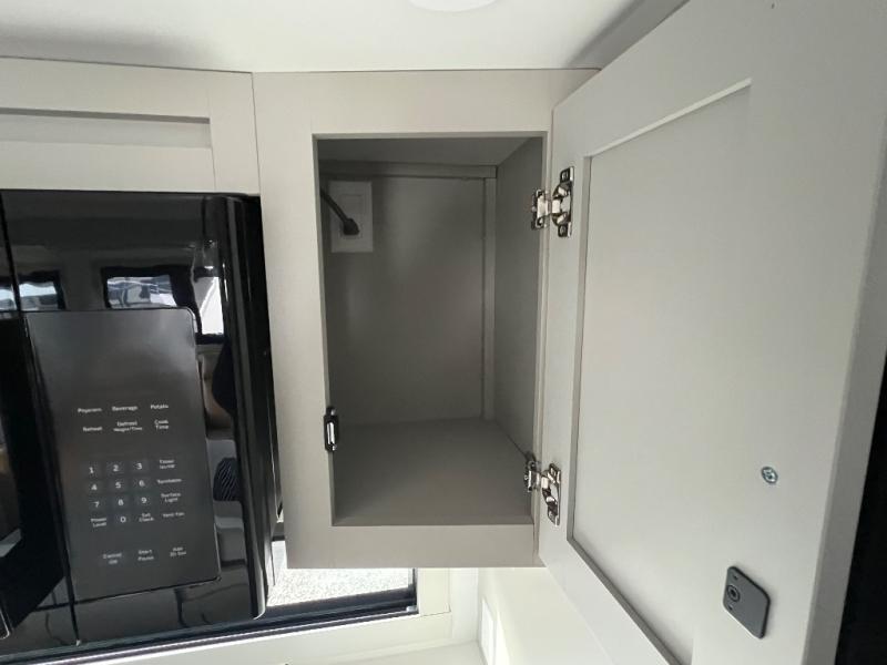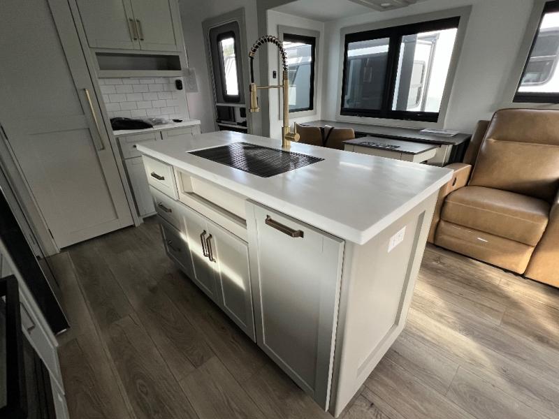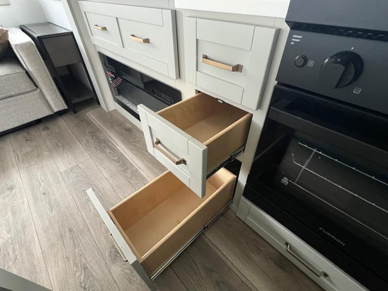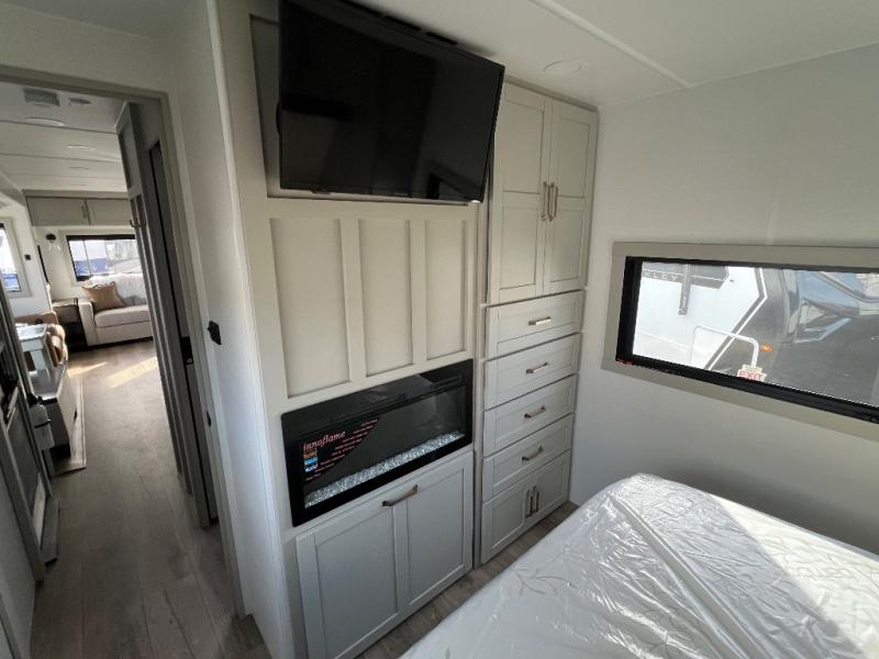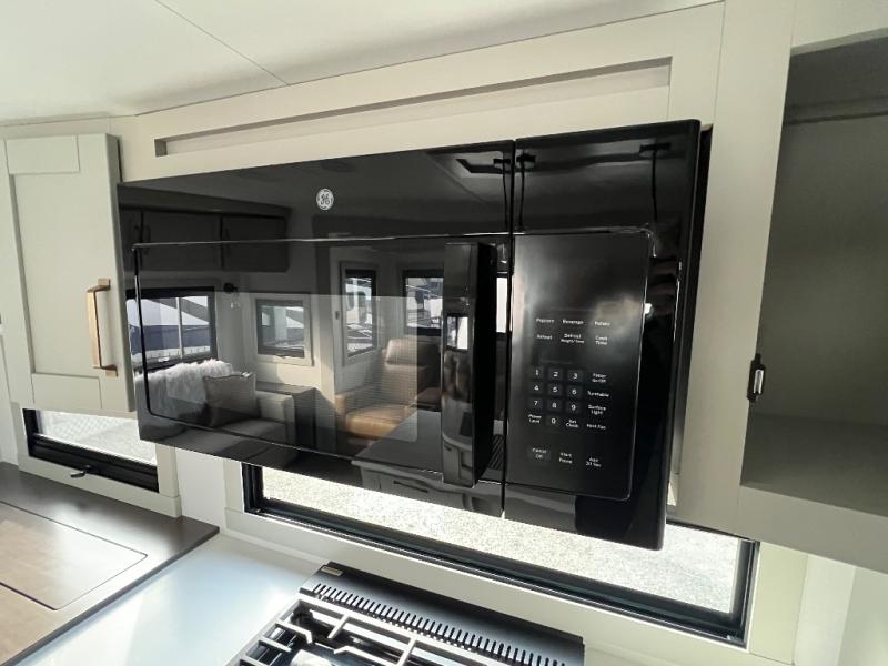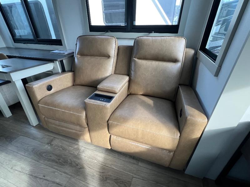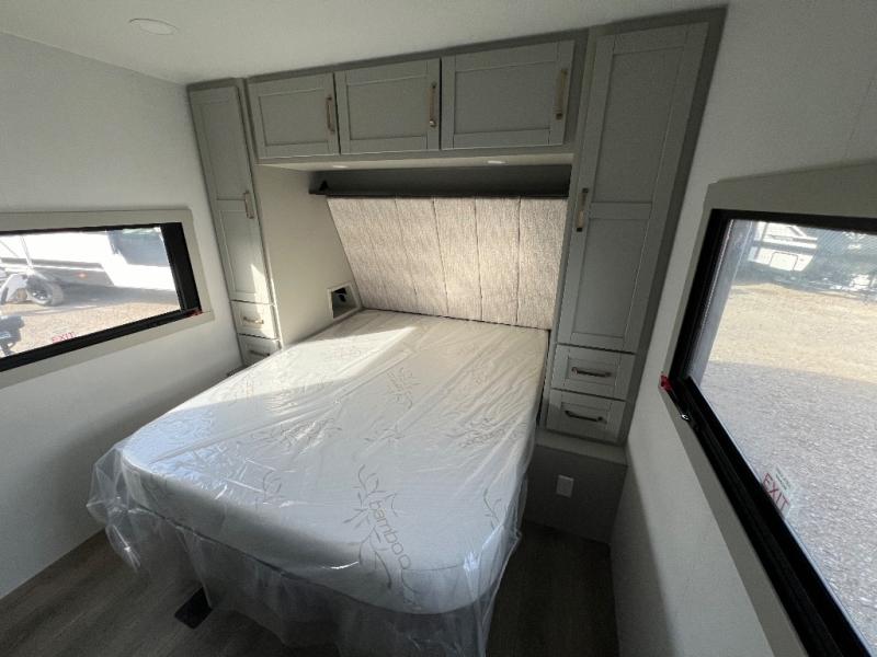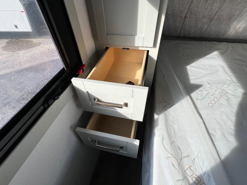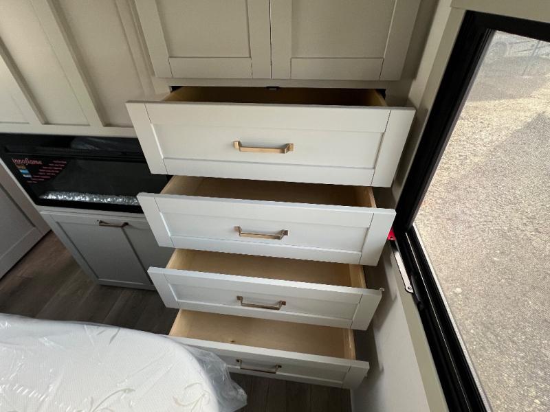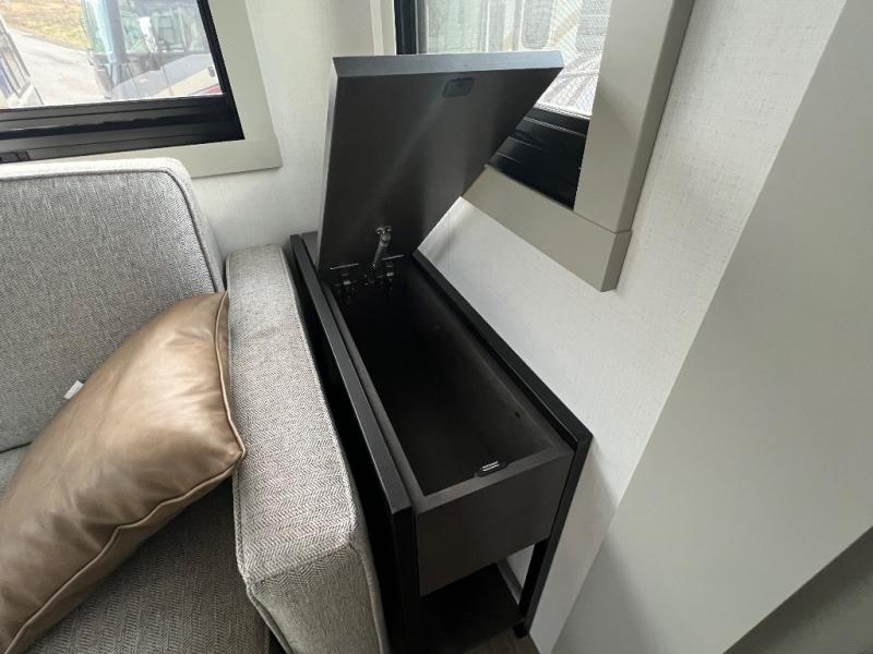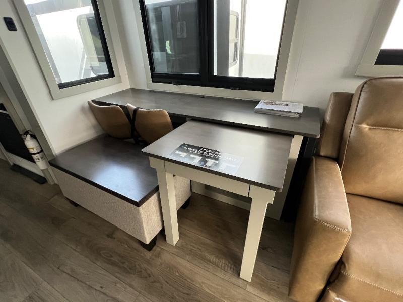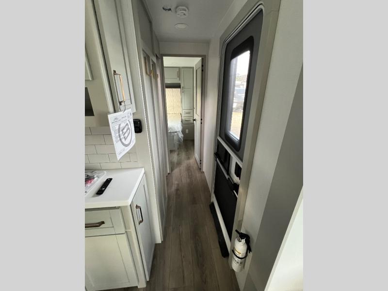 This travel trailer is spacious thanks to the dual opposing slides in the combined kitchen and living area. There is a rear 72" tri-fold sofa here, theater seating, and a sliding desk/dining table. The televator and fireplace will let you relax each evening with a movie or good book, and the full kitchen lets you make meals wherever you go. The chef of your group will also appreciate the pantry with adjustable shelving for all their ingredients, a hutch, 30" residential microwave, and even a pull-out trash bin for easy clean-up. When you're ready to call it a night, the front private bedroom will be waiting for you. This room includes a queen bed with four underbed drawers, a closet with pass-thru access to the bathroom closet, plus washer and dryer prep if you want the option to go full-time!