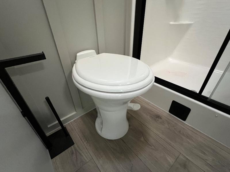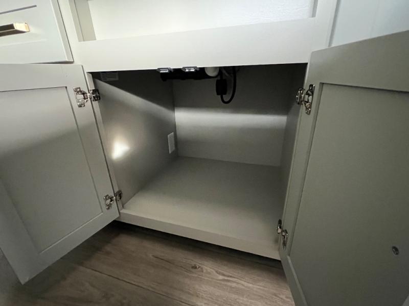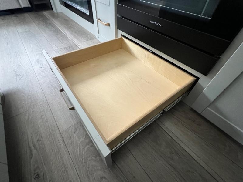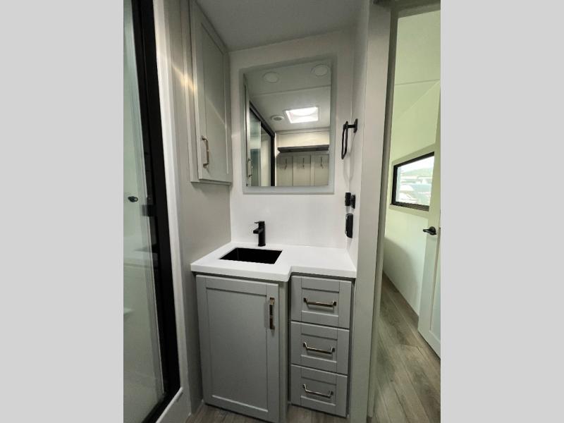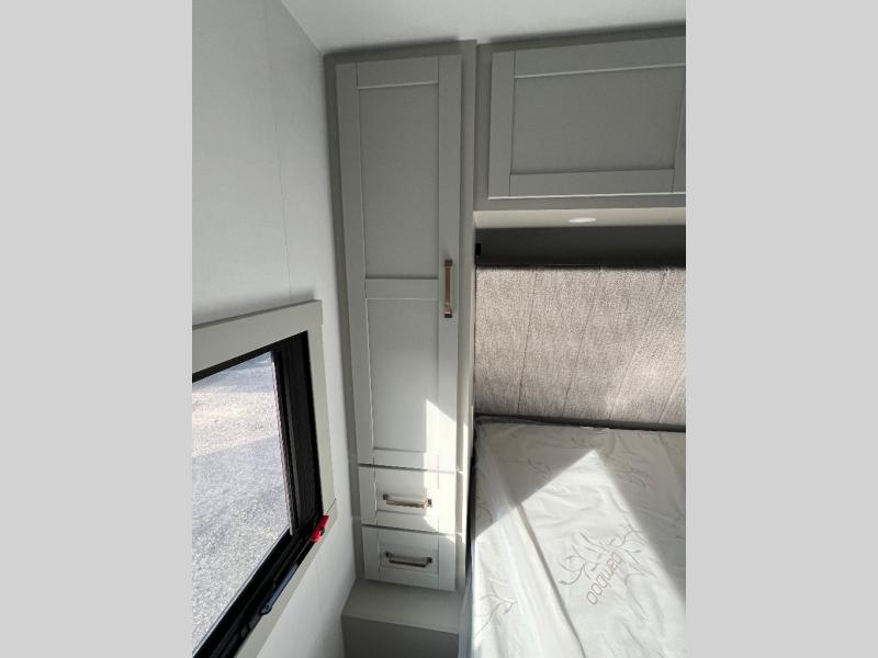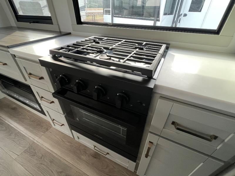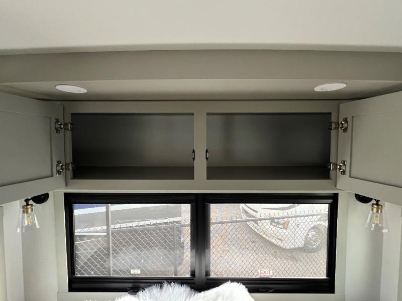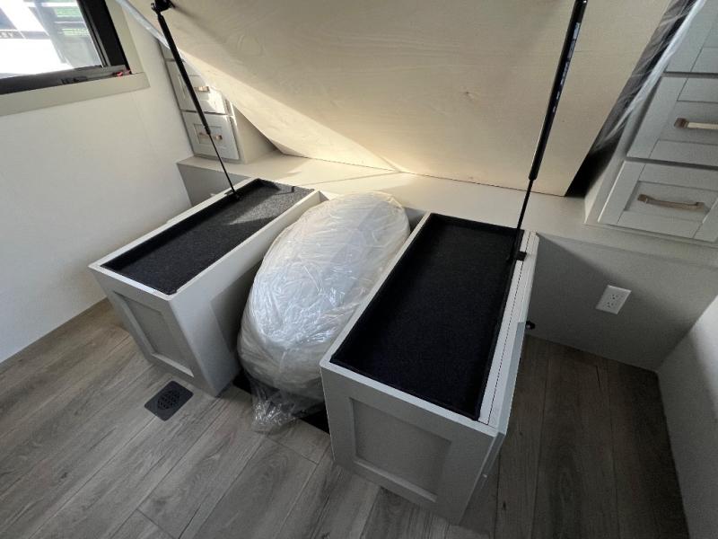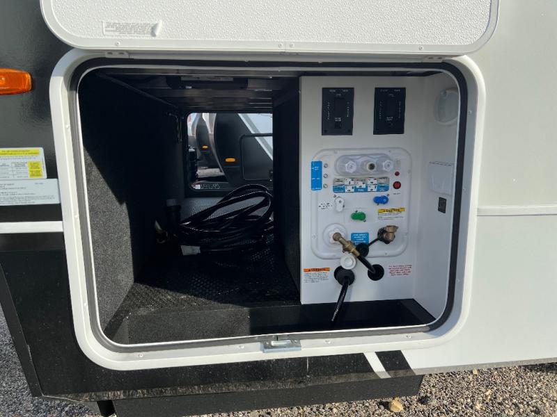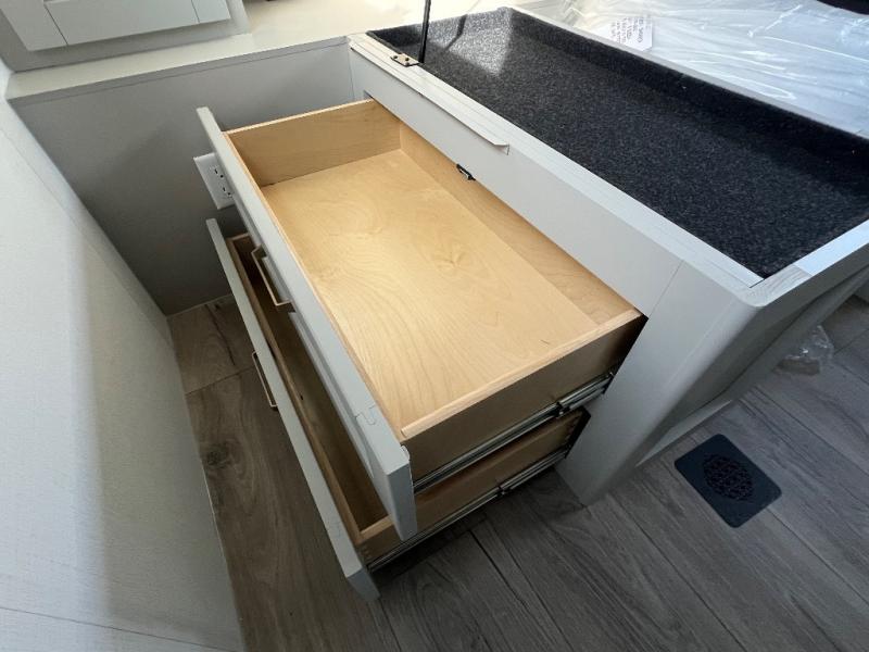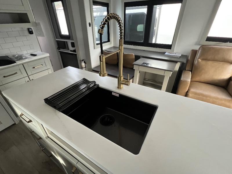 This travel trailer is spacious thanks to the dual opposing slides in the combined kitchen and living area. There is a rear 72" tri-fold sofa here, theater seating, and a sliding desk/dining table. The televator and fireplace will let you relax each evening with a movie or good book, and the full kitchen lets you make meals wherever you go. The chef of your group will also appreciate the pantry with adjustable shelving for all their ingredients, a hutch, 30" residential microwave, and even a pull-out trash bin for easy clean-up. When you're ready to call it a night, the front private bedroom will be waiting for you. This room includes a queen bed with four underbed drawers, a closet with pass-thru access to the bathroom closet, plus washer and dryer prep if you want the option to go full-time!