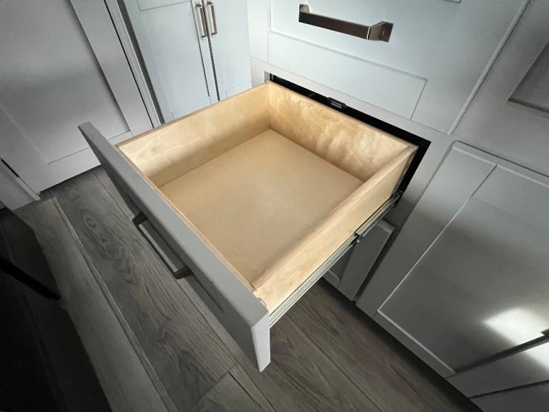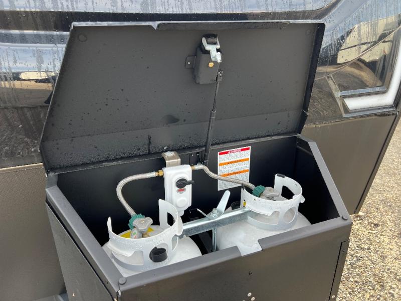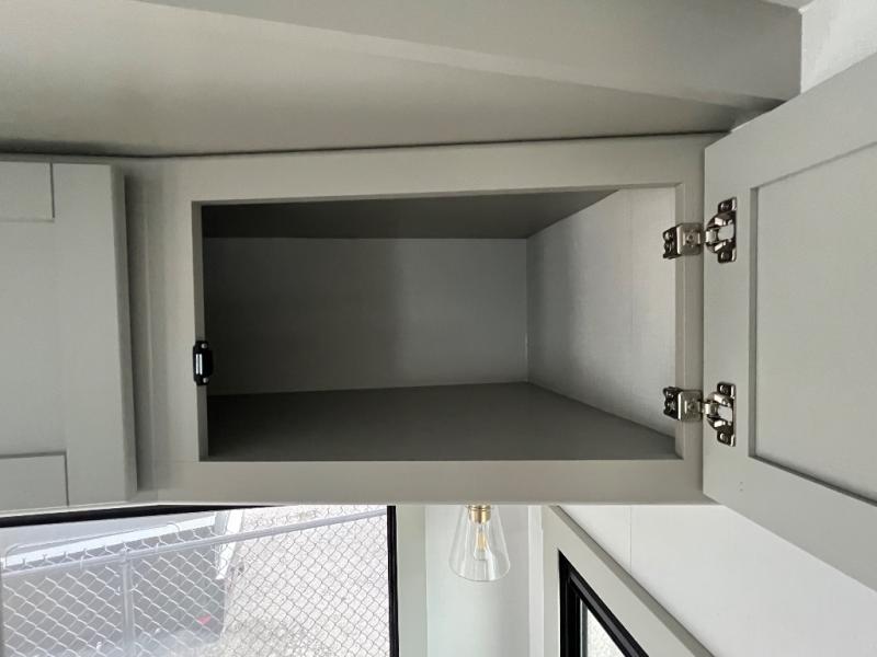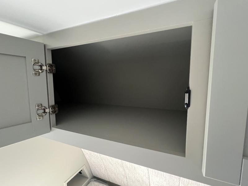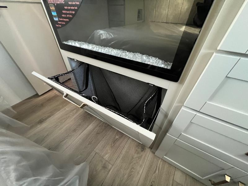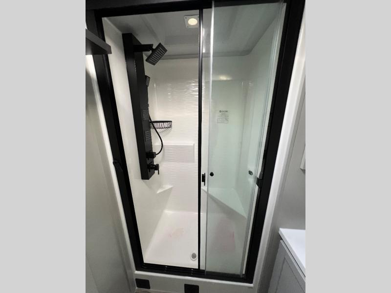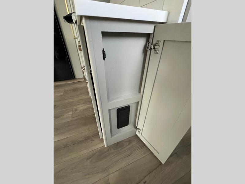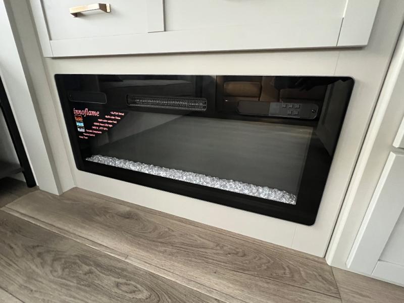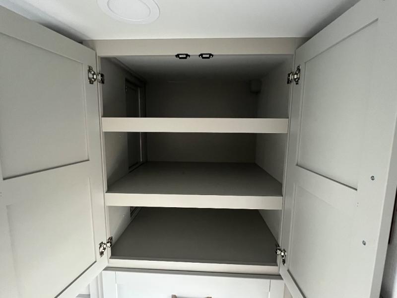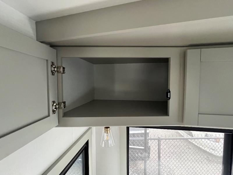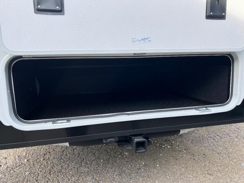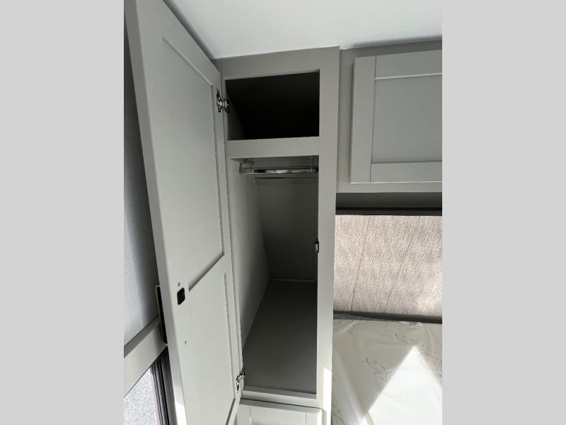 This travel trailer is spacious thanks to the dual opposing slides in the combined kitchen and living area. There is a rear 72" tri-fold sofa here, theater seating, and a sliding desk/dining table. The televator and fireplace will let you relax each evening with a movie or good book, and the full kitchen lets you make meals wherever you go. The chef of your group will also appreciate the pantry with adjustable shelving for all their ingredients, a hutch, 30" residential microwave, and even a pull-out trash bin for easy clean-up. When you're ready to call it a night, the front private bedroom will be waiting for you. This room includes a queen bed with four underbed drawers, a closet with pass-thru access to the bathroom closet, plus washer and dryer prep if you want the option to go full-time!