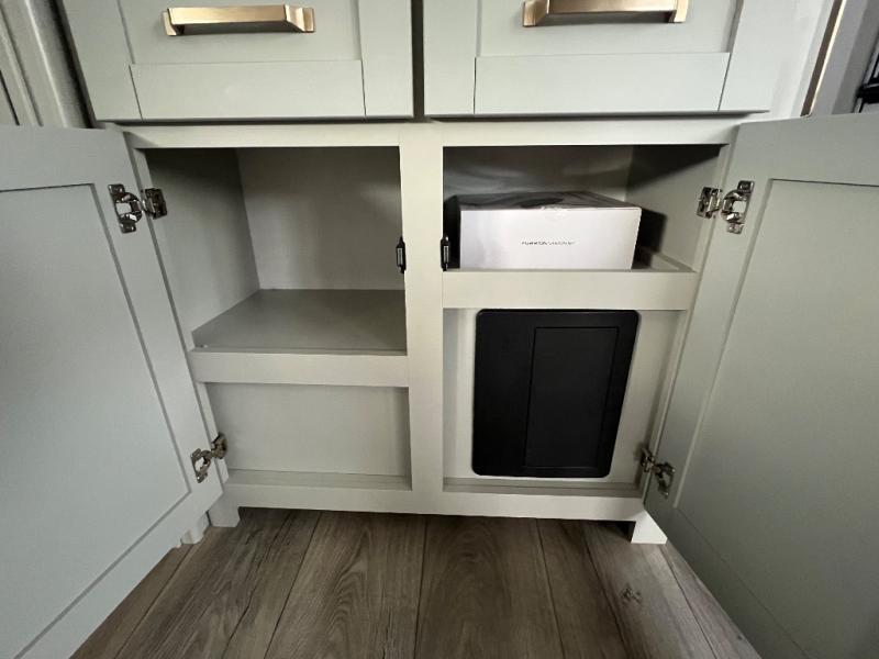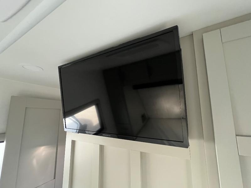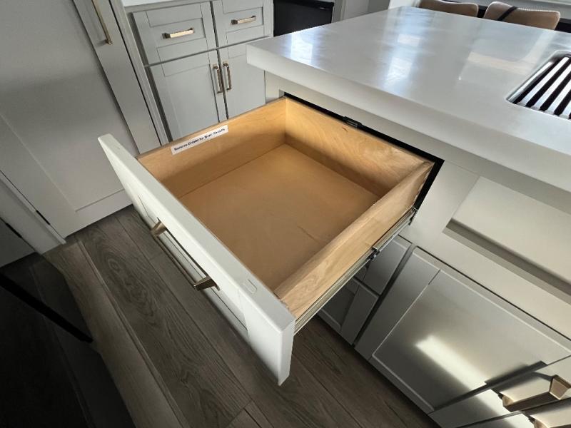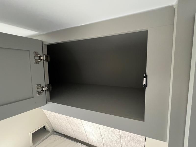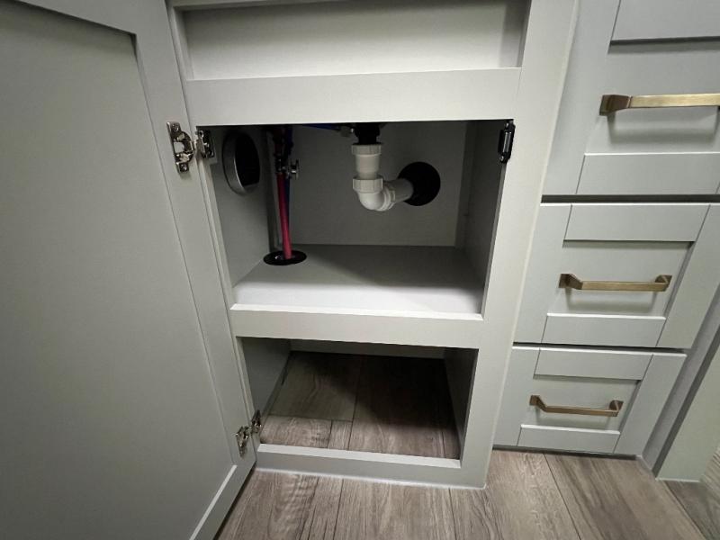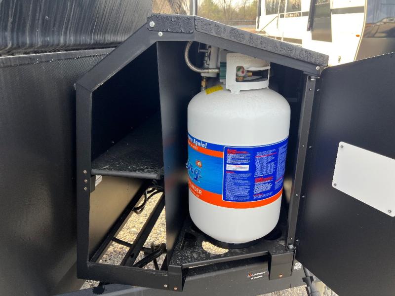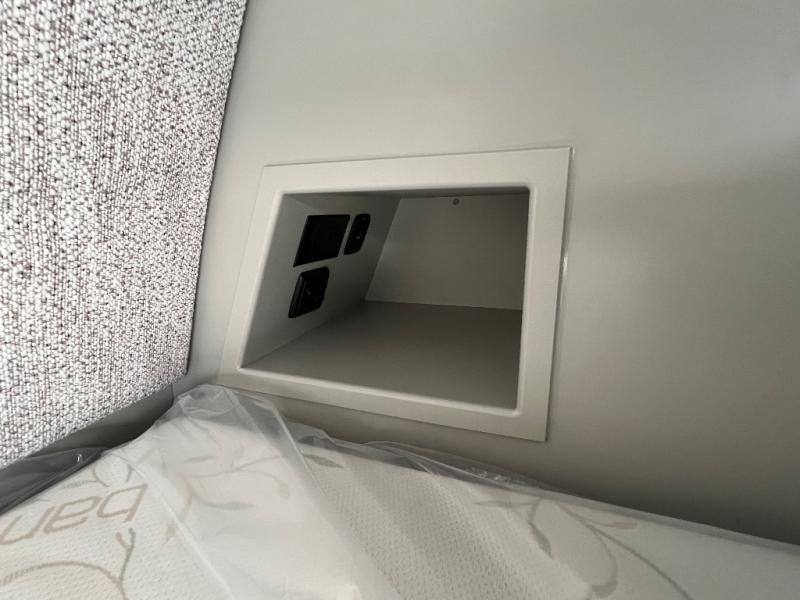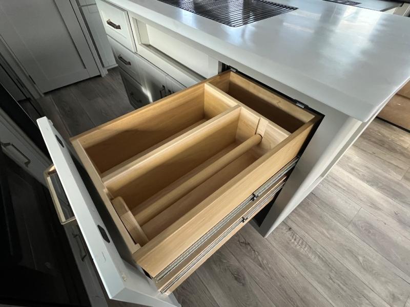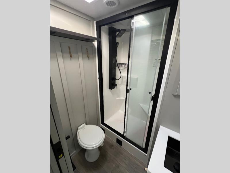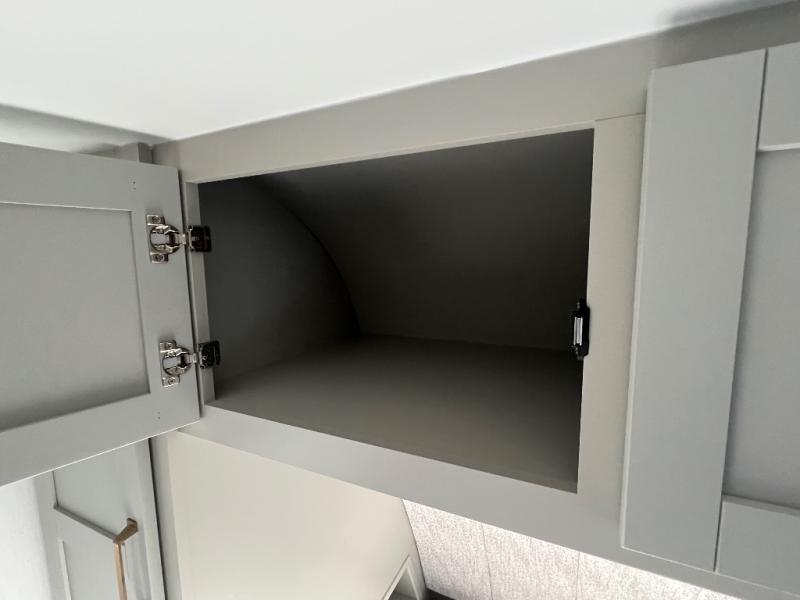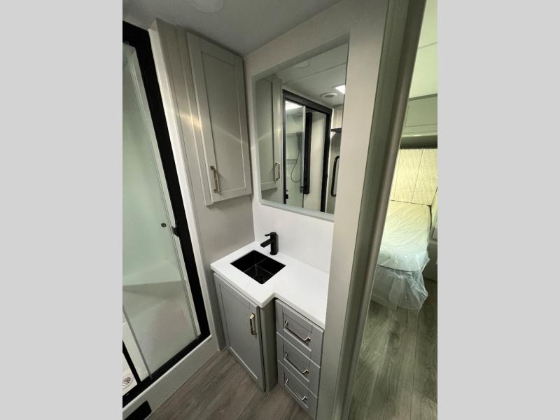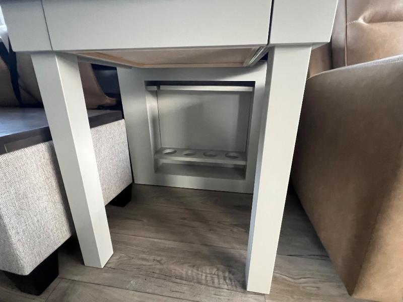 This travel trailer is spacious thanks to the dual opposing slides in the combined kitchen and living area. There is a rear 72" tri-fold sofa here, theater seating, and a sliding desk/dining table. The televator and fireplace will let you relax each evening with a movie or good book, and the full kitchen lets you make meals wherever you go. The chef of your group will also appreciate the pantry with adjustable shelving for all their ingredients, a hutch, 30" residential microwave, and even a pull-out trash bin for easy clean-up. When you're ready to call it a night, the front private bedroom will be waiting for you. This room includes a queen bed with four underbed drawers, a closet with pass-thru access to the bathroom closet, plus washer and dryer prep if you want the option to go full-time!
