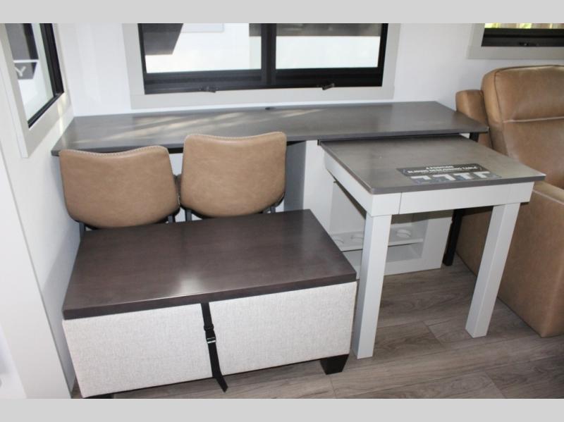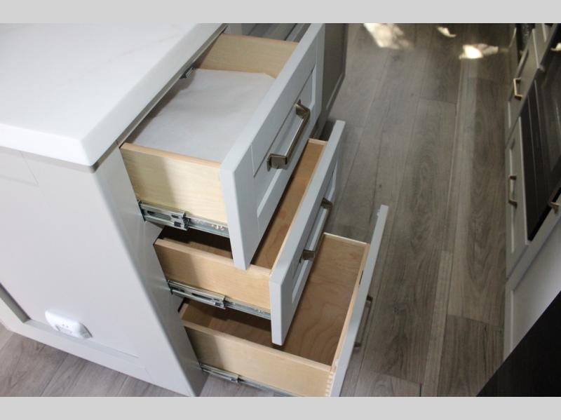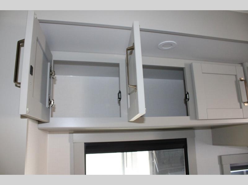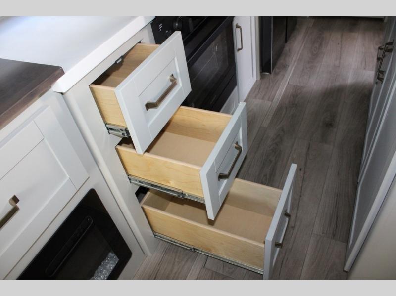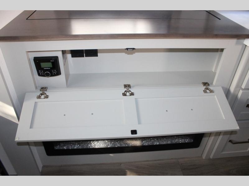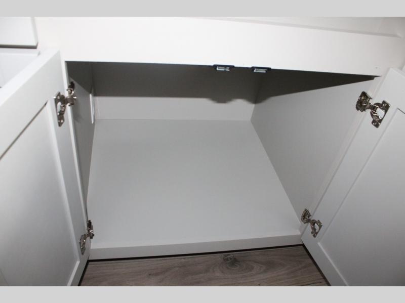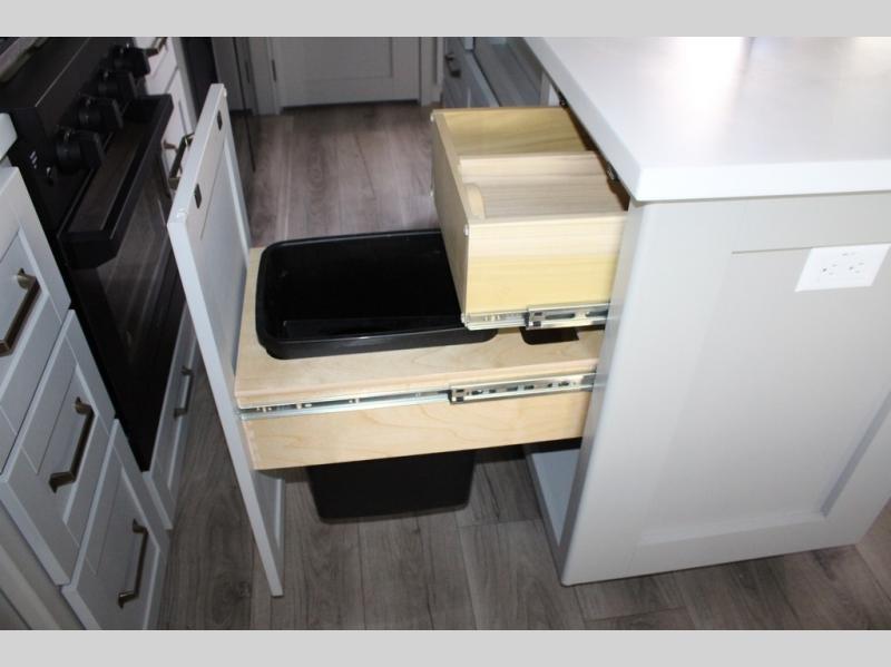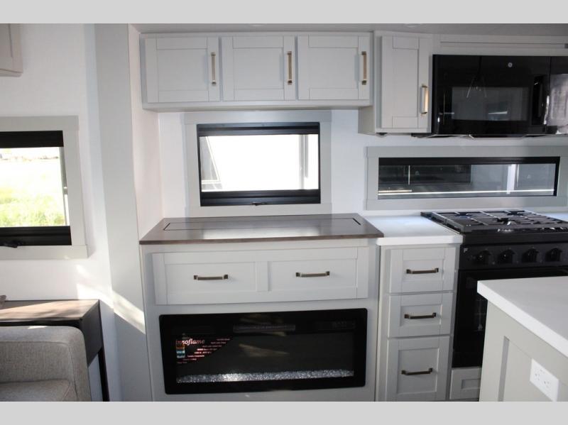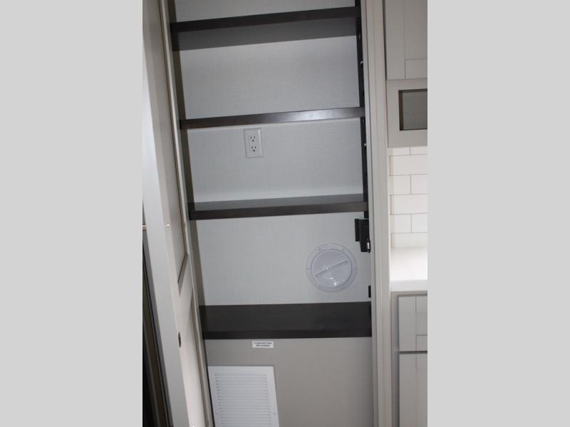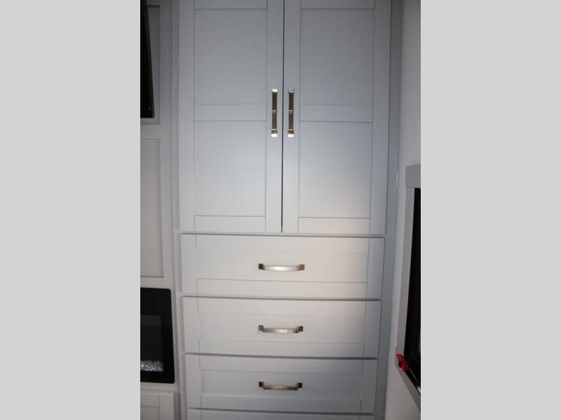 This travel trailer is spacious thanks to the dual opposing slides in the combined kitchen and living area. There is a rear 72" tri-fold sofa here, theater seating, and a sliding desk/dining table. The televator and fireplace will let you relax each evening with a movie or good book, and the full kitchen lets you make meals wherever you go. The chef of your group will also appreciate the pantry with adjustable shelving for all their ingredients, a hutch, 30" residential microwave, and even a pull-out trash bin for easy clean-up. When you're ready to call it a night, the front private bedroom will be waiting for you. This room includes a queen bed with four underbed drawers, a closet with pass-thru access to the bathroom closet, plus washer and dryer prep if you want the option to go full-time!