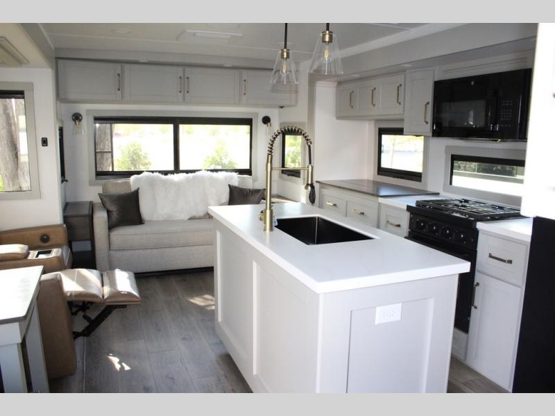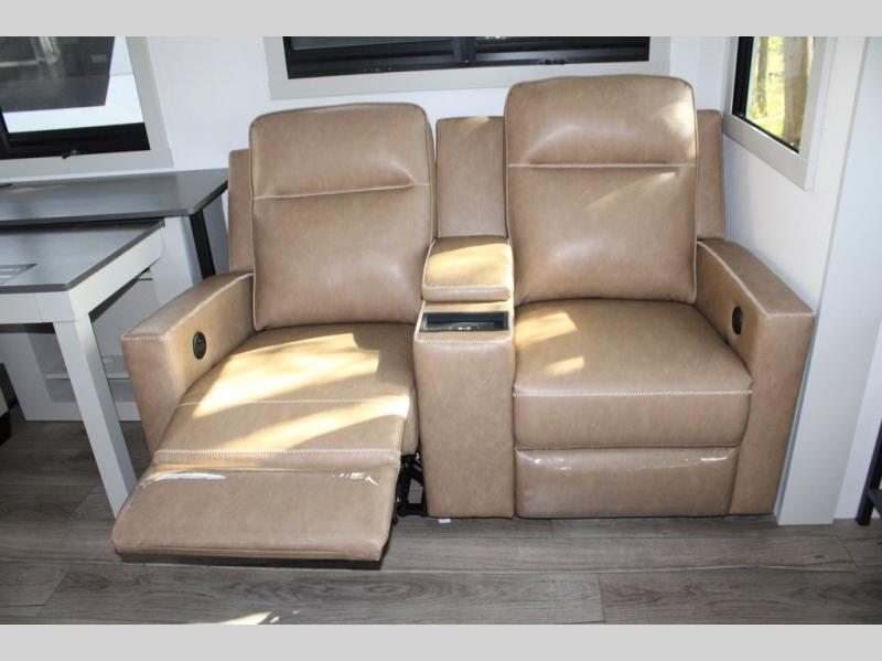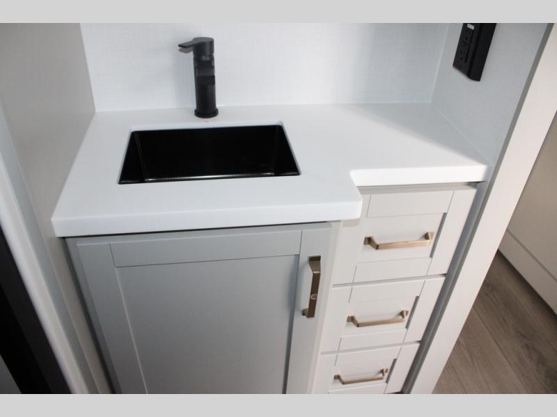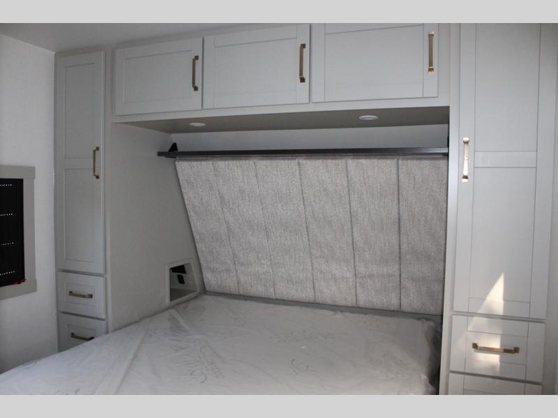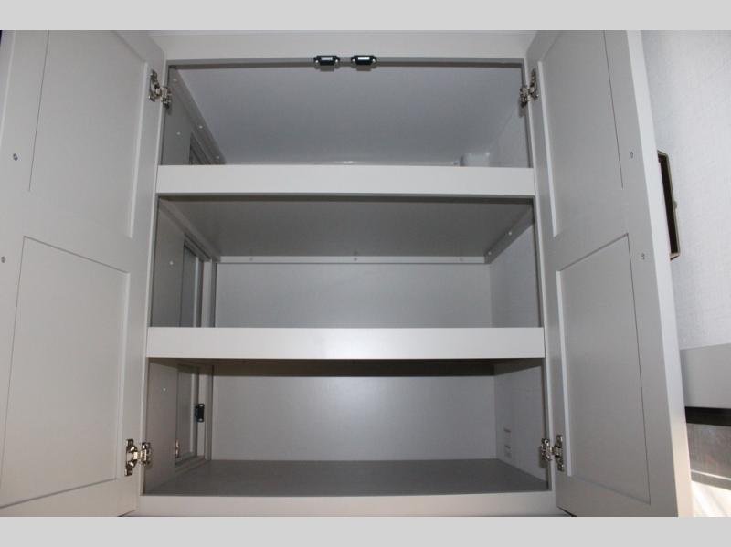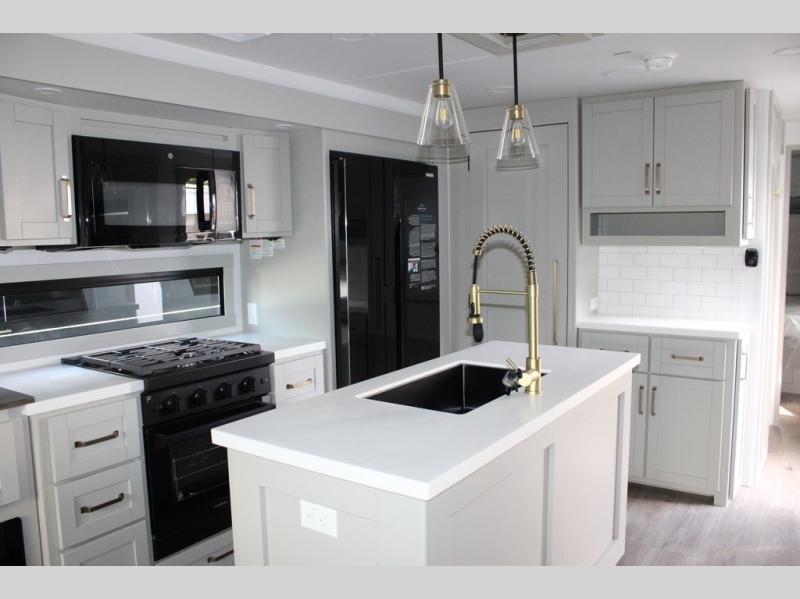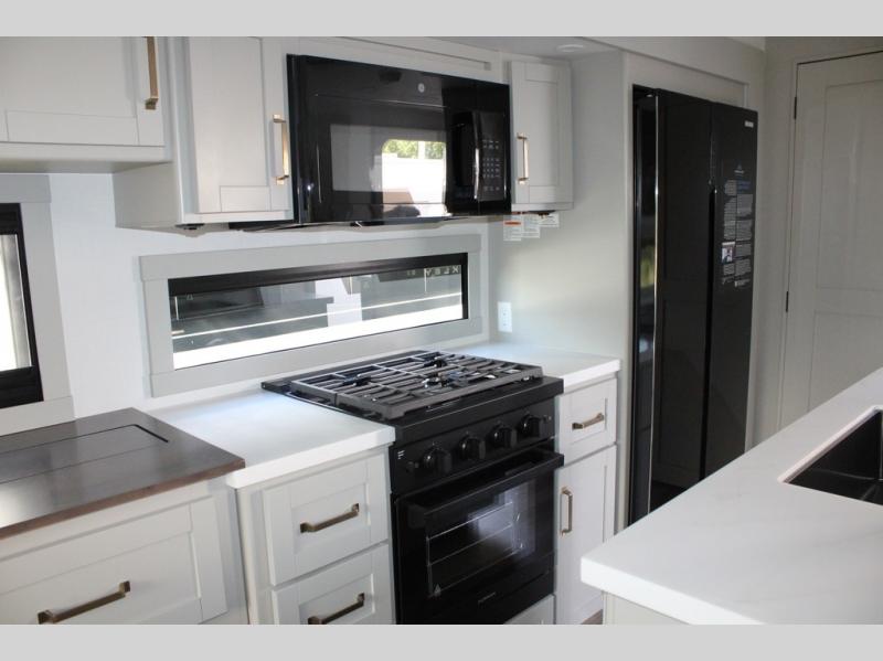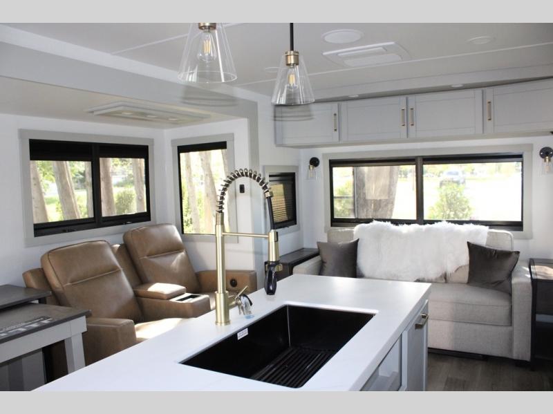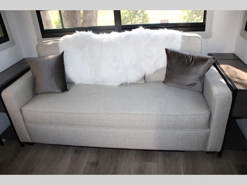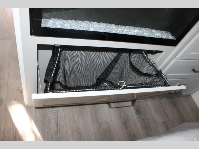 This travel trailer is spacious thanks to the dual opposing slides in the combined kitchen and living area. There is a rear 72" tri-fold sofa here, theater seating, and a sliding desk/dining table. The televator and fireplace will let you relax each evening with a movie or good book, and the full kitchen lets you make meals wherever you go. The chef of your group will also appreciate the pantry with adjustable shelving for all their ingredients, a hutch, 30" residential microwave, and even a pull-out trash bin for easy clean-up. When you're ready to call it a night, the front private bedroom will be waiting for you. This room includes a queen bed with four underbed drawers, a closet with pass-thru access to the bathroom closet, plus washer and dryer prep if you want the option to go full-time!