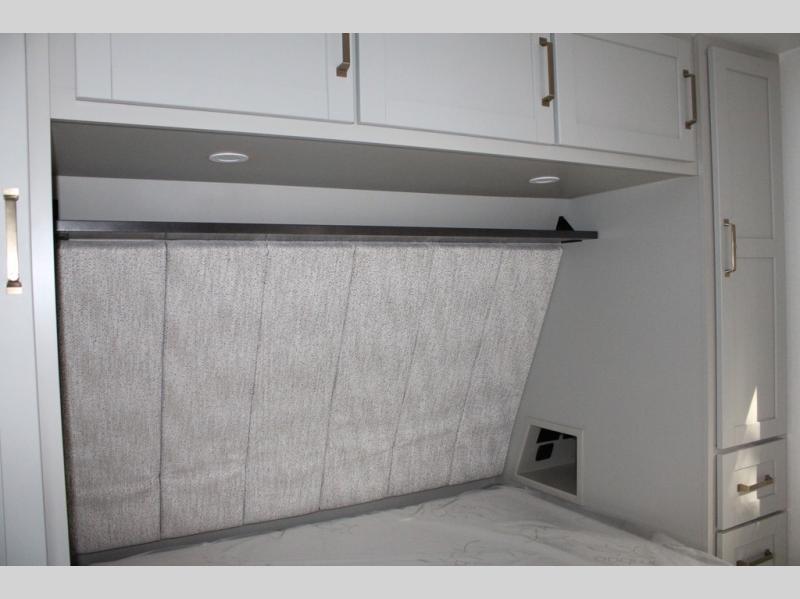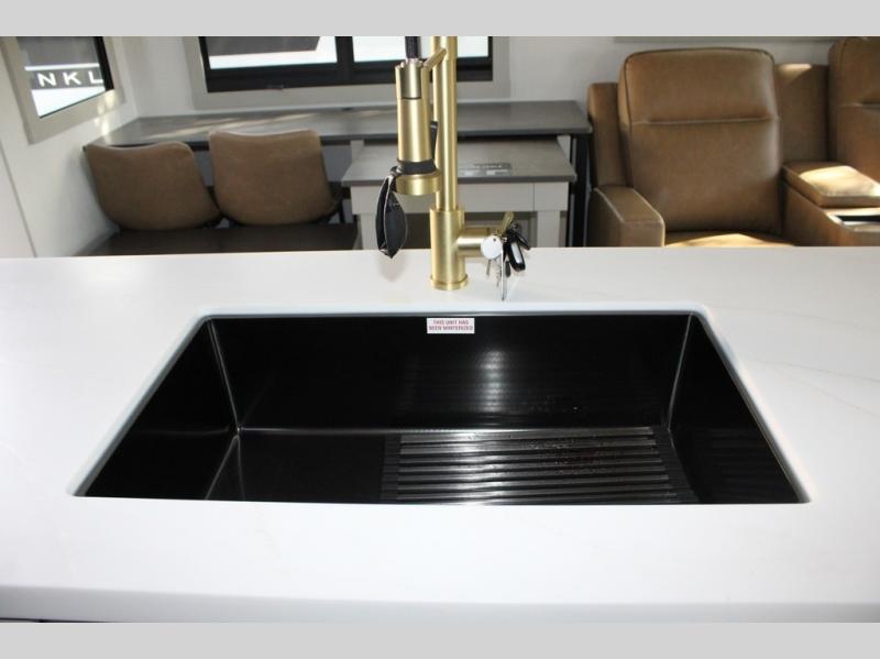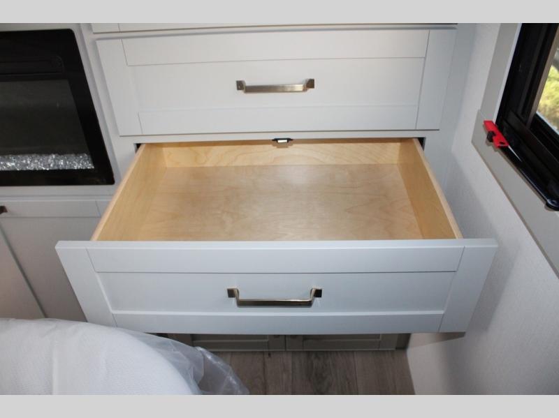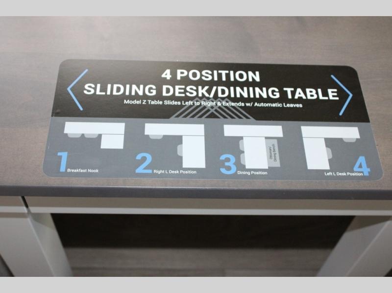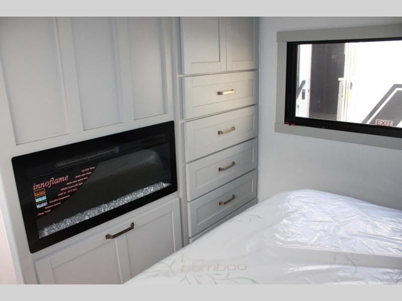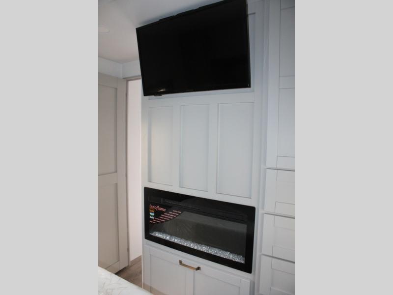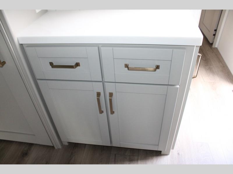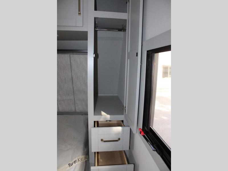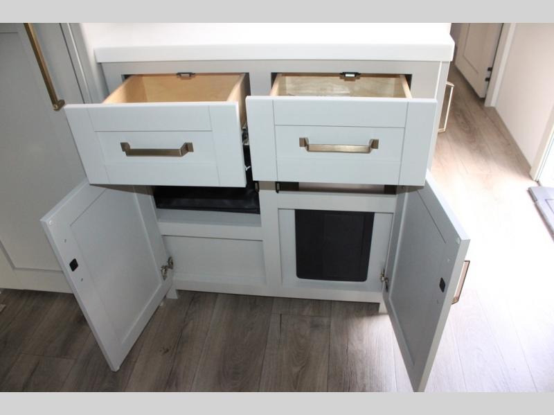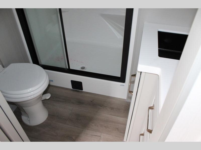 This travel trailer is spacious thanks to the dual opposing slides in the combined kitchen and living area. There is a rear 72" tri-fold sofa here, theater seating, and a sliding desk/dining table. The televator and fireplace will let you relax each evening with a movie or good book, and the full kitchen lets you make meals wherever you go. The chef of your group will also appreciate the pantry with adjustable shelving for all their ingredients, a hutch, 30" residential microwave, and even a pull-out trash bin for easy clean-up. When you're ready to call it a night, the front private bedroom will be waiting for you. This room includes a queen bed with four underbed drawers, a closet with pass-thru access to the bathroom closet, plus washer and dryer prep if you want the option to go full-time!