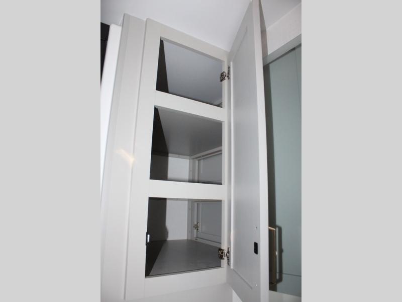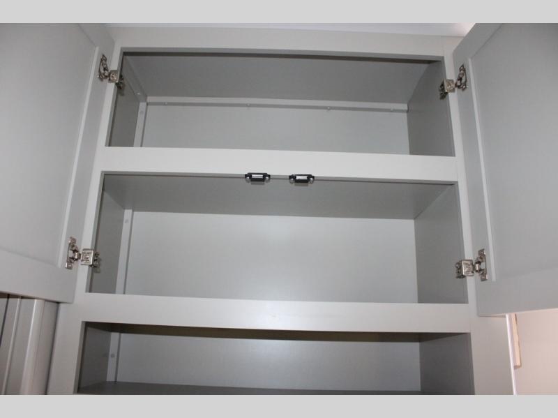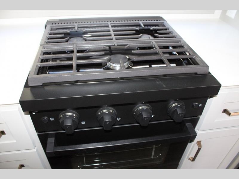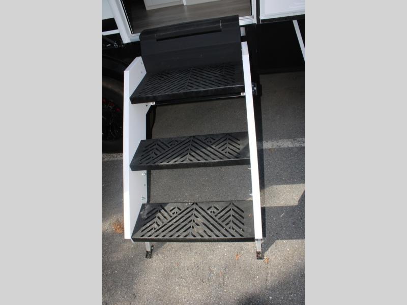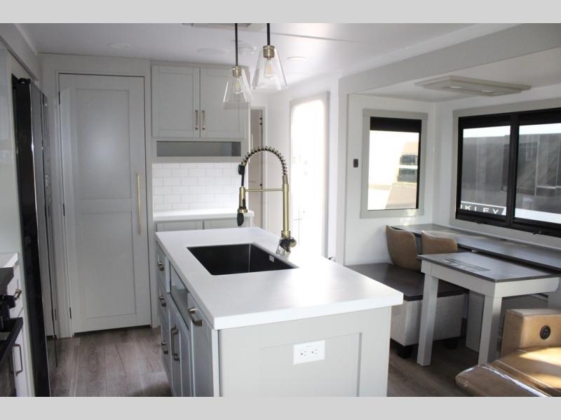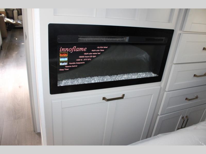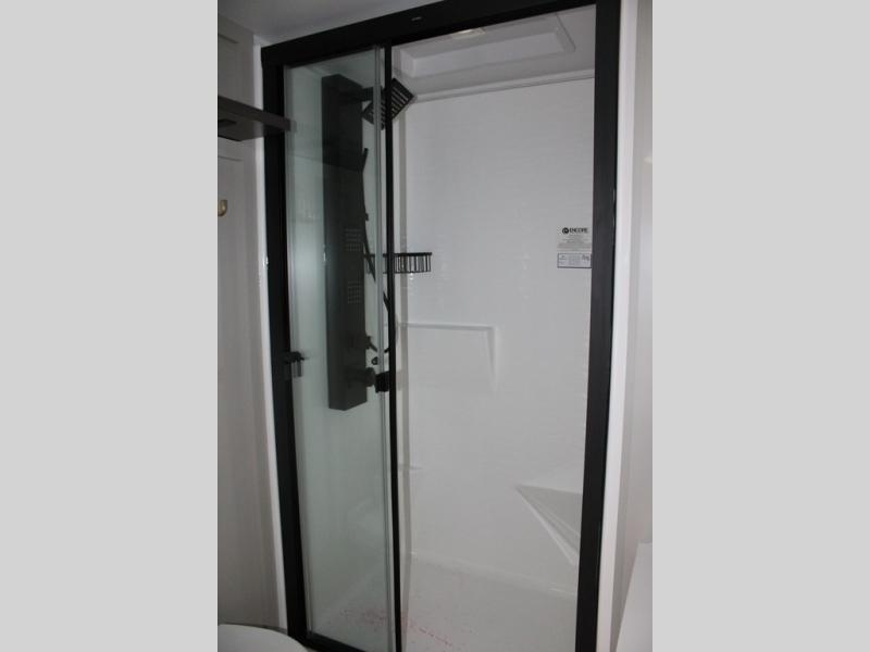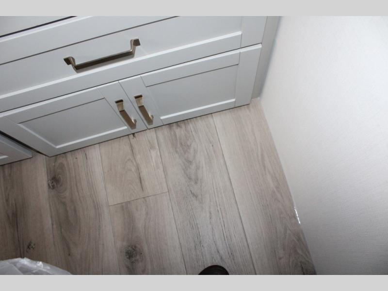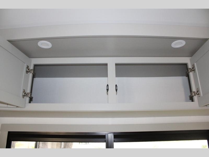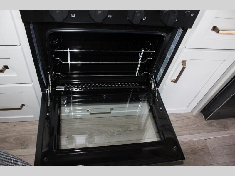 This travel trailer is spacious thanks to the dual opposing slides in the combined kitchen and living area. There is a rear 72" tri-fold sofa here, theater seating, and a sliding desk/dining table. The televator and fireplace will let you relax each evening with a movie or good book, and the full kitchen lets you make meals wherever you go. The chef of your group will also appreciate the pantry with adjustable shelving for all their ingredients, a hutch, 30" residential microwave, and even a pull-out trash bin for easy clean-up. When you're ready to call it a night, the front private bedroom will be waiting for you. This room includes a queen bed with four underbed drawers, a closet with pass-thru access to the bathroom closet, plus washer and dryer prep if you want the option to go full-time!