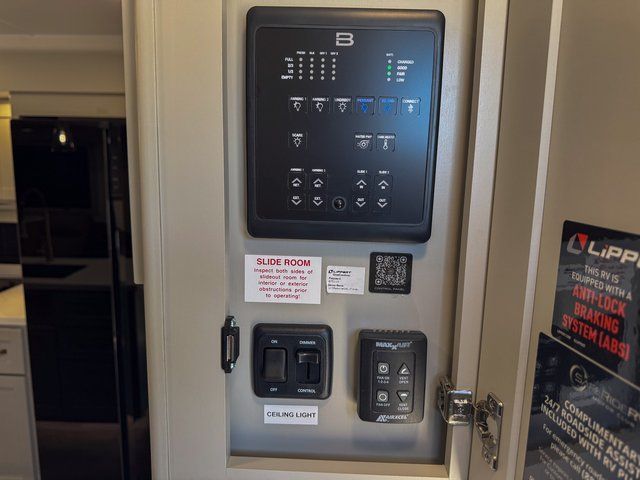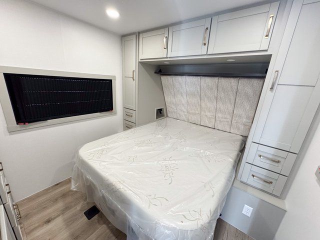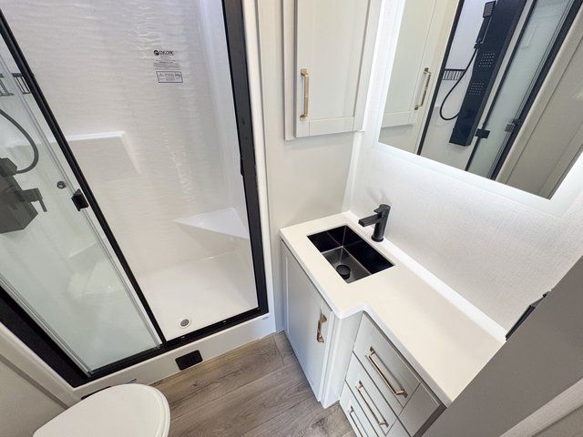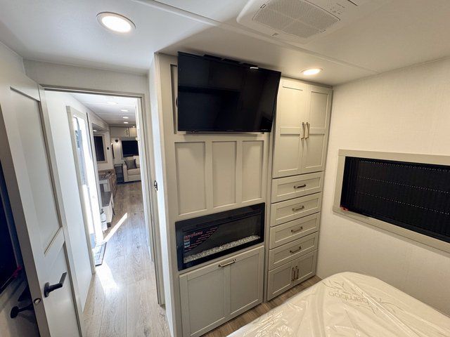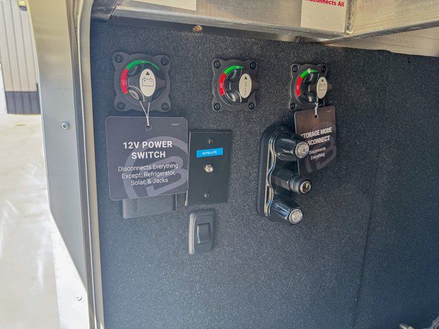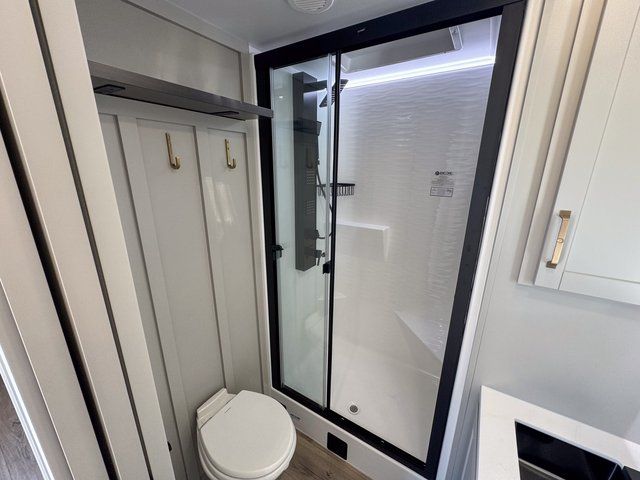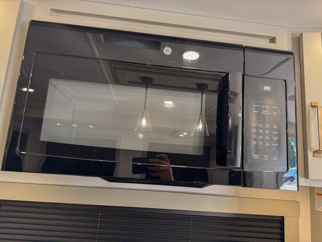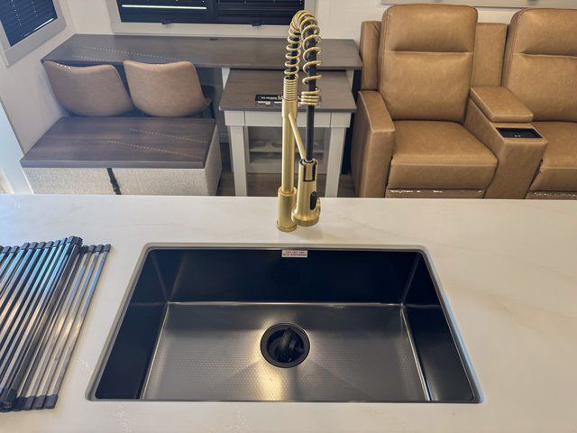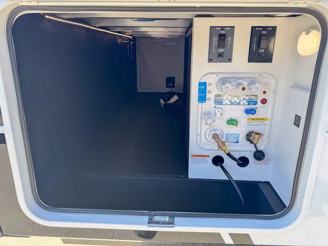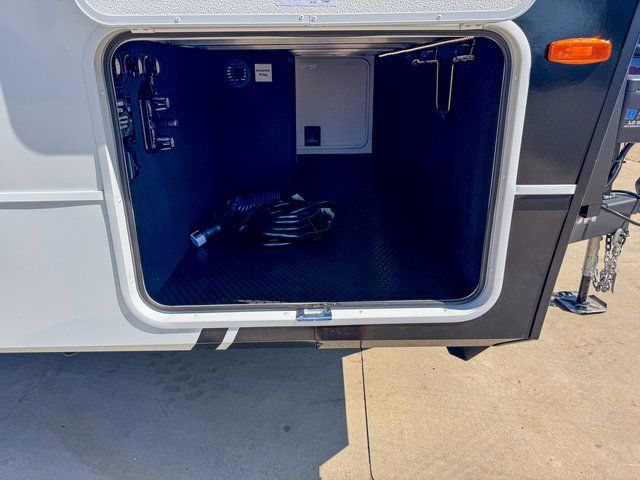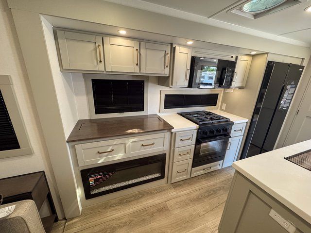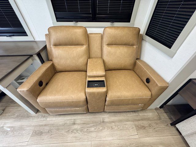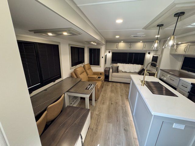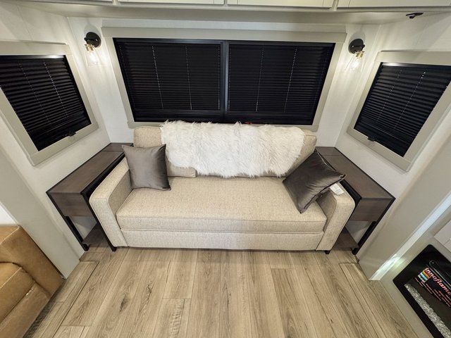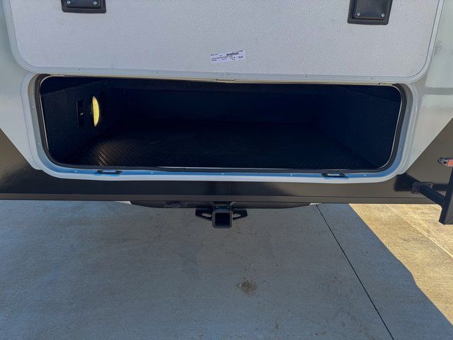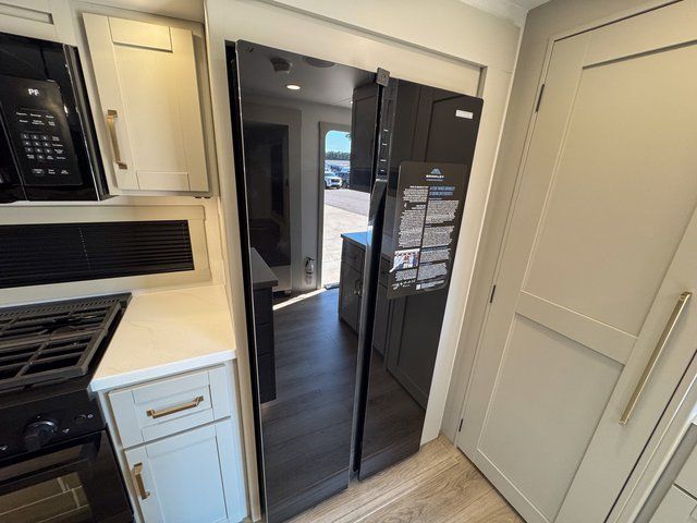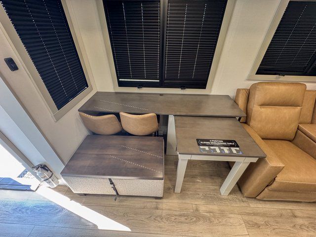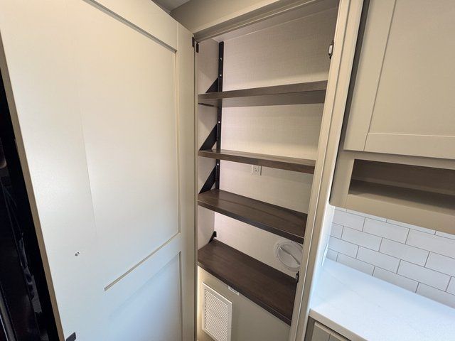 This travel trailer is spacious thanks to the dual opposing slides in the combined kitchen and living area. There is a rear 72" tri-fold sofa here, theater seating, and a sliding desk/dining table. The televator and fireplace will let you relax each evening with a movie or good book, and the full kitchen lets you make meals wherever you go. The chef of your group will also appreciate the pantry with adjustable shelving for all their ingredients, a hutch, 30" residential microwave, and even a pull-out trash bin for easy clean-up. When you're ready to call it a night, the front private bedroom will be waiting for you. This room includes a queen bed with four underbed drawers, a closet with pass-thru access to the bathroom closet, plus washer and dryer prep if you want the option to go full-time!
